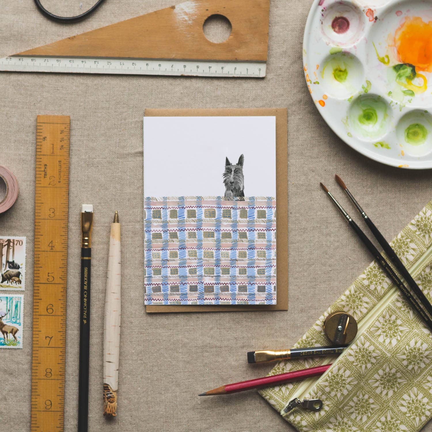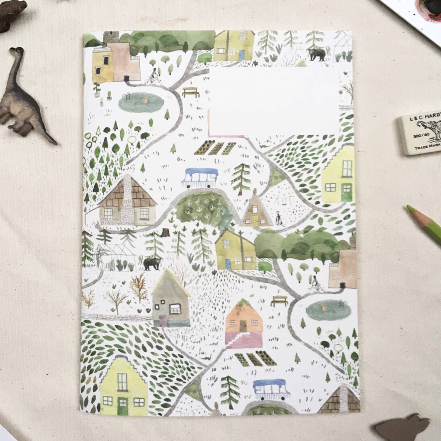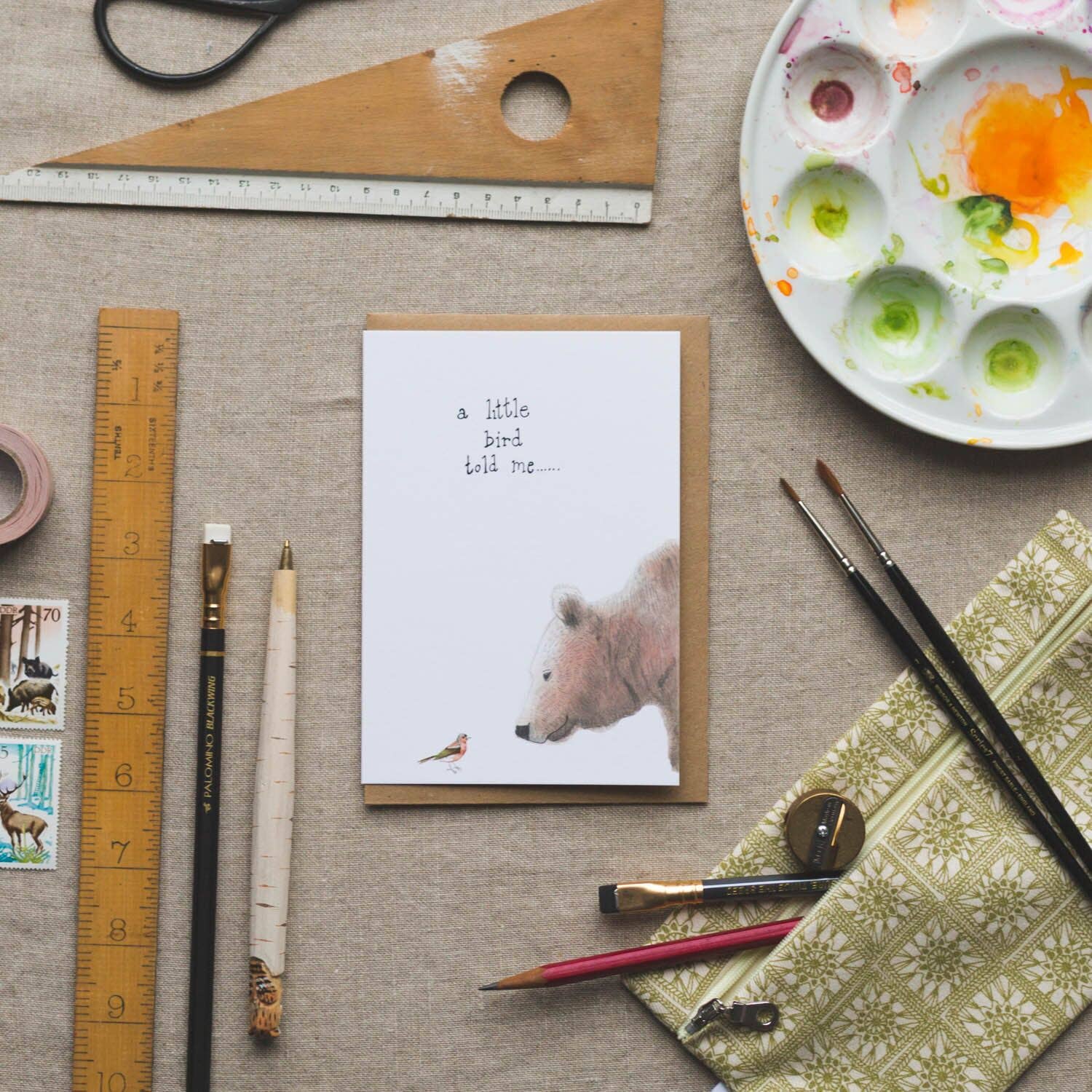 Every Dear Prudence product starts out with Laura picking up her paints, her pencils, pastels and more. A clean, quiet, orderly studio allows ideas to flow on to blank sketchbook pages... the whimsical little characters Laura conjures, the textures she captures and the details she notes will later be digitised and turned in to cards, calendars, notebooks, ready to be sent out in to the world. Messages of love and congratulations, hearty thanks, and words to cheer on birthdays and wedding days, heading out all around the world, in to homes and warm hands. The power of paper, pen and a stamp and the power of intent - all at the very heart of Dear Prudence, all at the very heart of Laura. Dear Prudence cards are made with the very best paper stock, from sustainable forests. We use recycled envelopes and now offer cello free packaging.