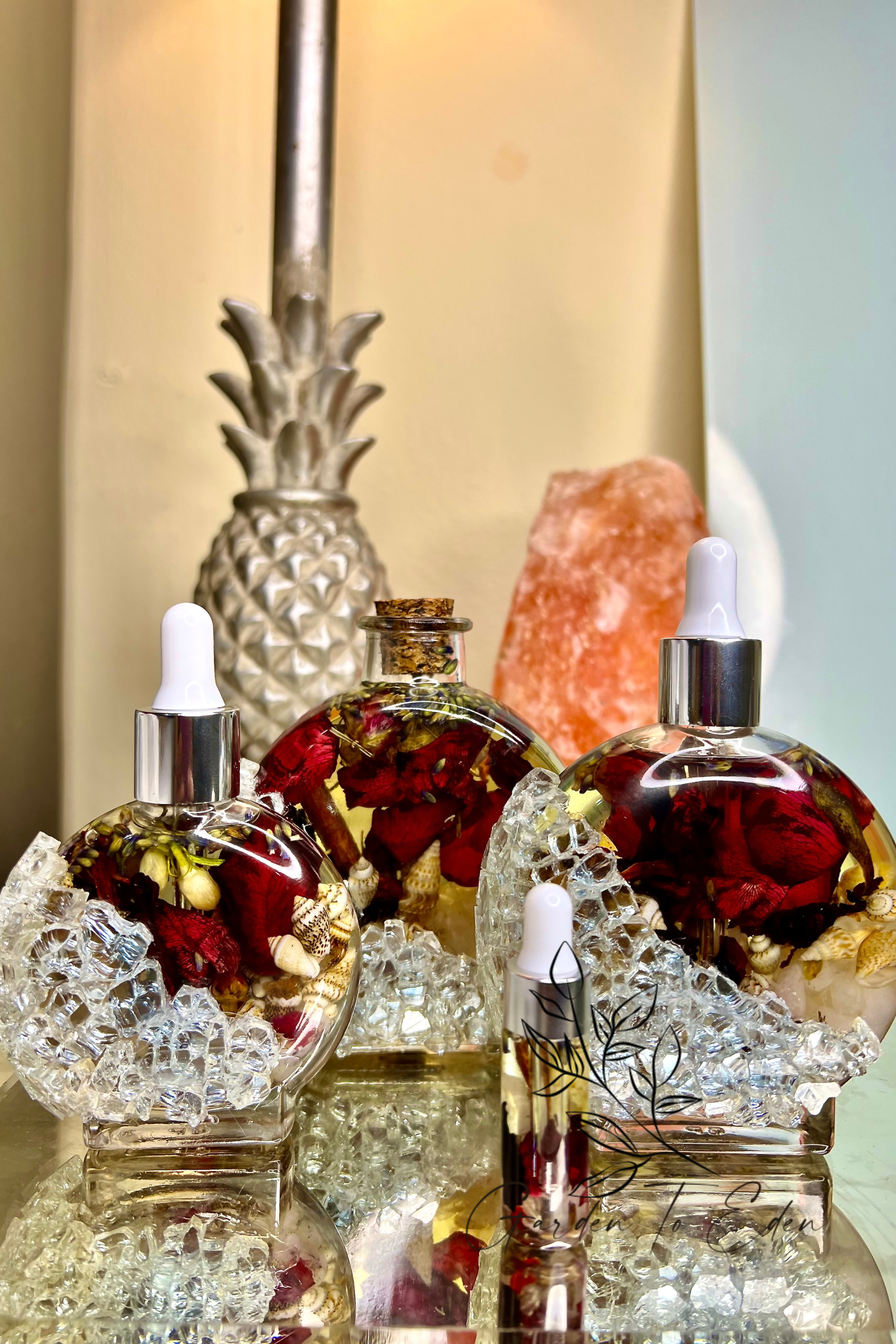Beauty didn’t meet the beast in this story, she met a farmer and then they had me! Garden to eden is that story ends... In this herbal apothecary garden; I combine everything that's pure, natural and given to us by the earth itself into high quality beauty products designed to help manifest your deepest intentions. My creations are infused in a beautiful vessel, intended to remind you daily of your manifestations. Most of my potions are created in our signature vessels, "a circle cradled in a shattered glass crescent moon" designed to unify and release our deepest intentions. Helping us to plant the seeds needed to create the life of we all desire. THE CIRCLE: are among the oldest of geometric symbols, and commonly represent unity, wholeness, and infinity. Pythagoras called the circle "monad," the most perfect of creative forms, without beginning or end, without sides or corners. THE CRESCENT MOON: is often considered the beginning, the pause at the end of the inhale, a time to sit in fullness, to bask in gratitude, and to take in at a very deep level the blessings, the expansion, and the grace of all that is. This phase of the moon is an especially potent time to ground into the truth of what you want to create in your life. If you want to live with a sense of abundance, plant those seeds with the new moon. THE SHATTERED GLASS: represents the release of the desires we contain deep down inside.