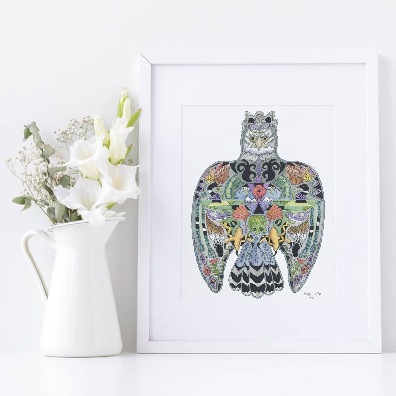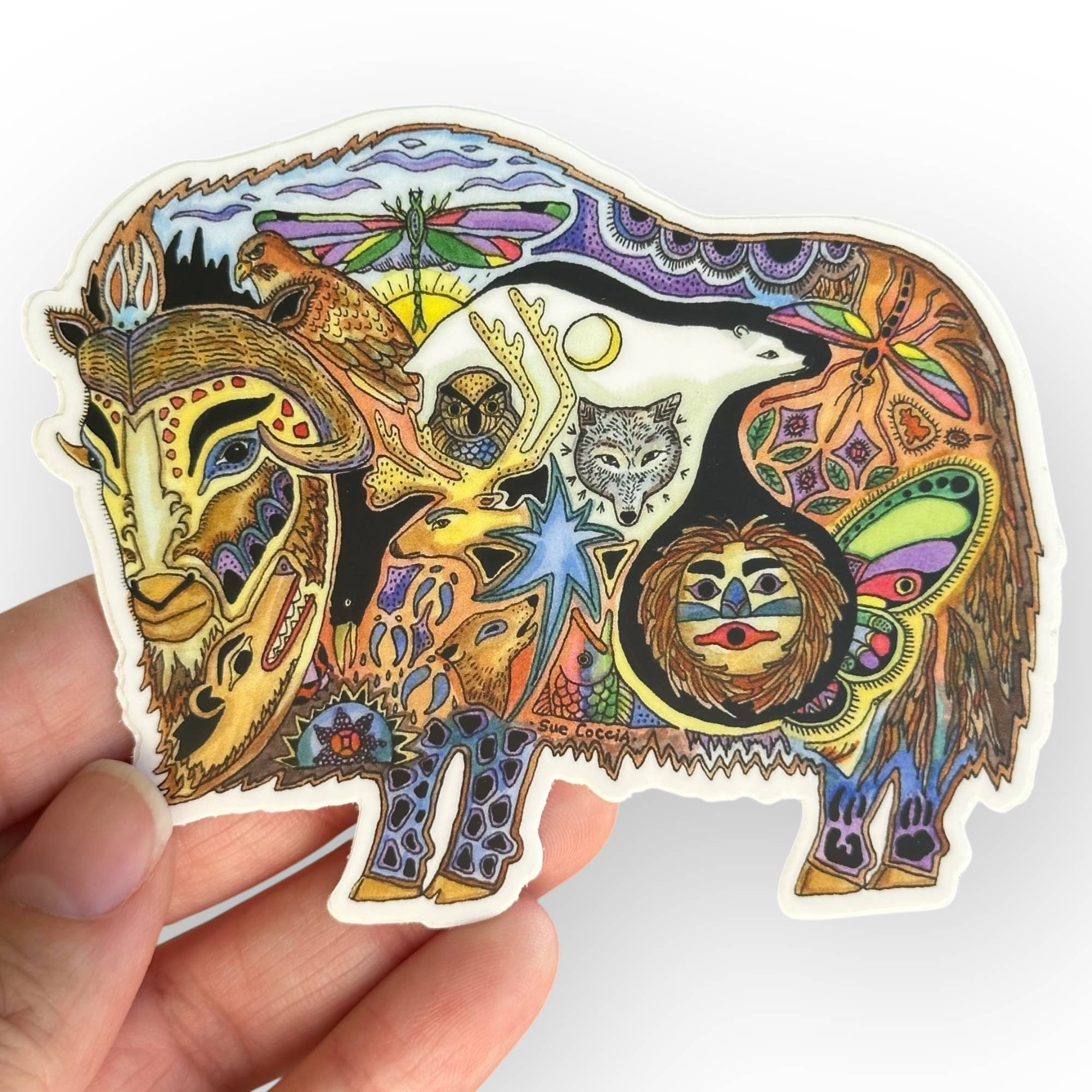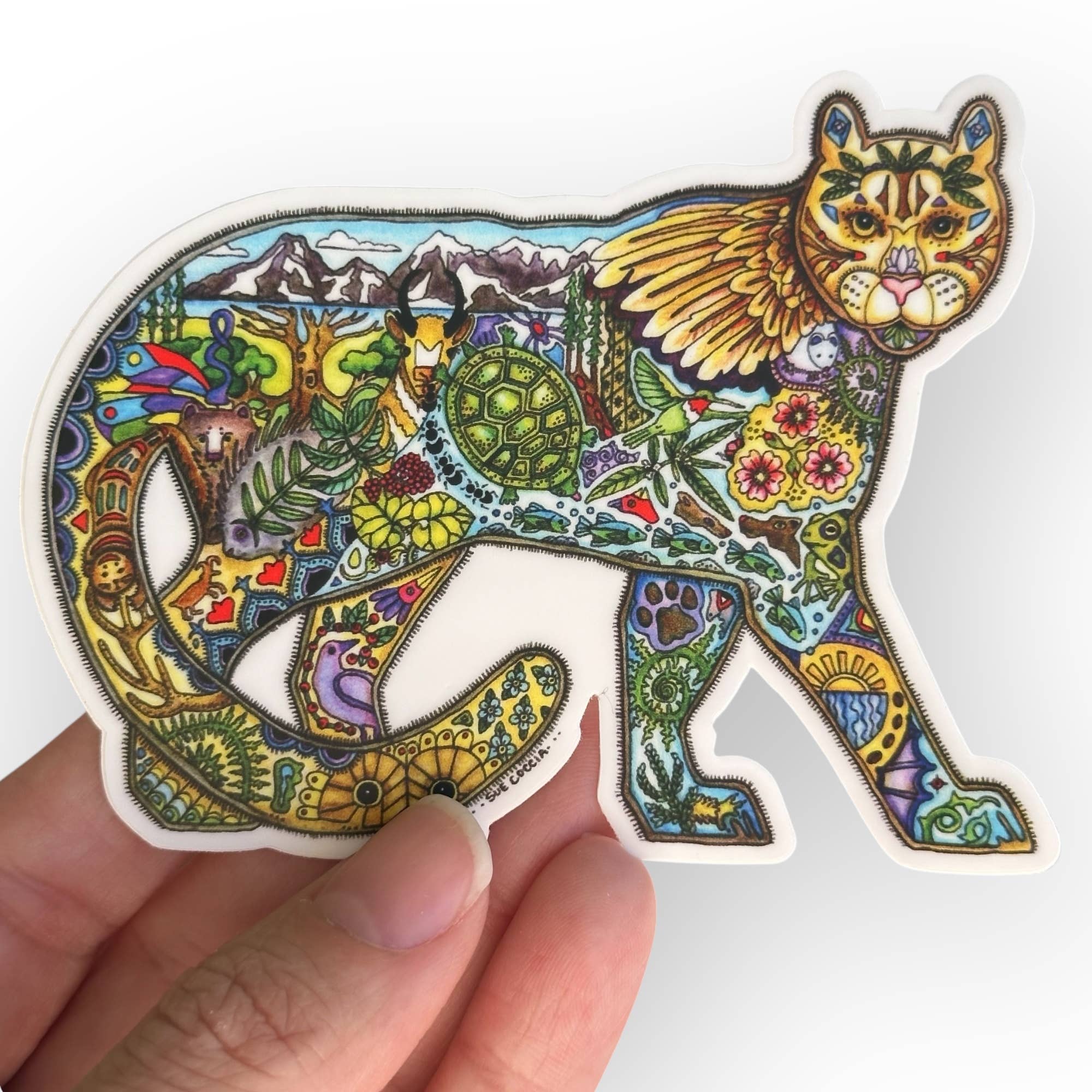 Northwest artist Sue Coccia is from Edmonds, Washington. She has a formal art background, however it is a deep love of all animals that sparks her work with a unique style. She started selling her art in 1996 as EarthArt International with a portion of her proceeds being donated to wildlife conservation organizations. Her Animal Spirits are inspired drawings in pen and ink, then meticulously painted with acrylics. The drawings depict animals from around the world. The images reflect a deep spirituality, and when we begin to understand and respect their individual qualities and strengths, we realize we are all connected.