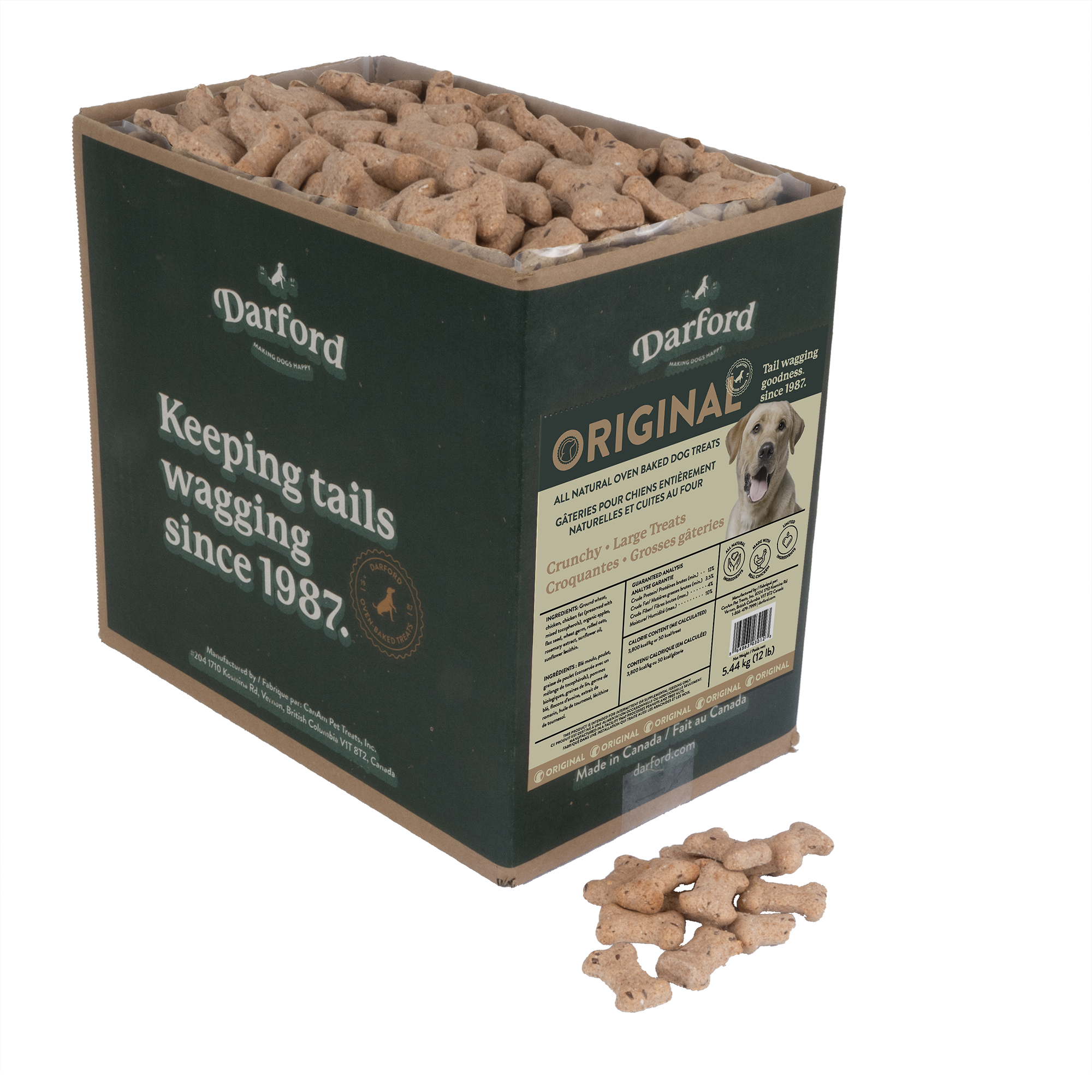 Tail Wagging Goodness since 1987. Since 1987, we have been baking deliciously crunchy and wholesome treats and food for our dogs, here in the beautiful Okanagan Valley of British Columbia, Canada. Over the years, our ‘kitchen’ and baking capabilities have expanded but our commitment to quality & freshness remain unchanged. Always in small batches, baked in our own ovens. We have been oven baking dog treats and food for all breeds for over 35 years. It’s what we know, and do best as master bakers. Our artisanal style dog food & treats are 100% natural, containing whole ingredients of grains, fruit, meat and vegetables. DARFORD oven baked dog treats and food. Meticulously baked. Devoured in seconds.
