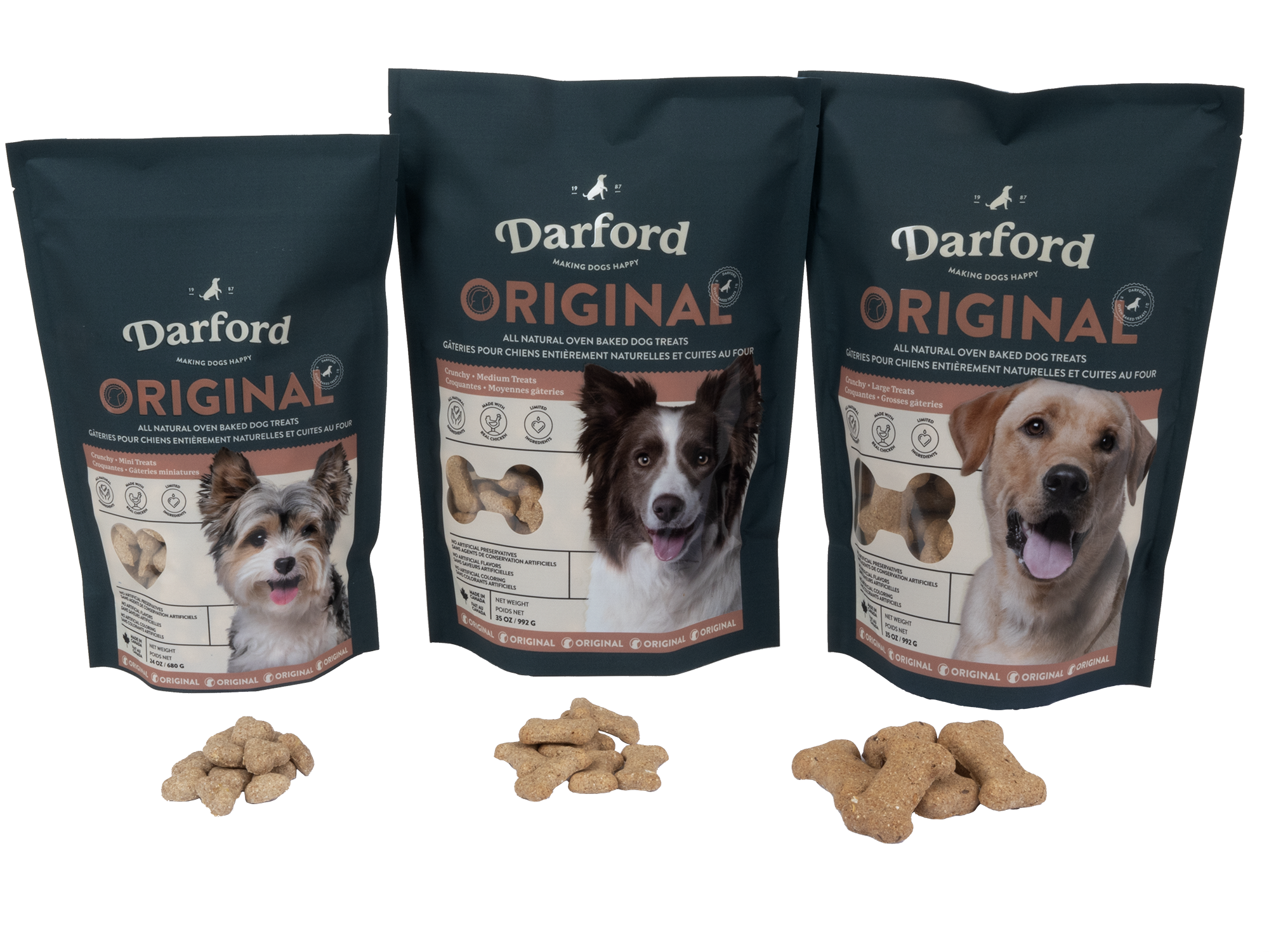 Tail Wagging Goodness since 1987. Since 1987, we have been baking deliciously crunchy and wholesome treats and food for our dogs, here in the beautiful Okanagan Valley of British Columbia, Canada. Over the years, our ‘kitchen’ and baking capabilities have expanded but our commitment to quality & freshness remain unchanged. Always in small batches, baked in our own ovens. We have been oven baking dog treats and food for all breeds for over 35 years. It’s what we know, and do best as master bakers. Our artisanal style dog food & treats are 100% natural, containing whole ingredients of grains, fruit, meat and vegetables. DARFORD oven baked dog treats and food. Meticulously baked. Devoured in seconds.