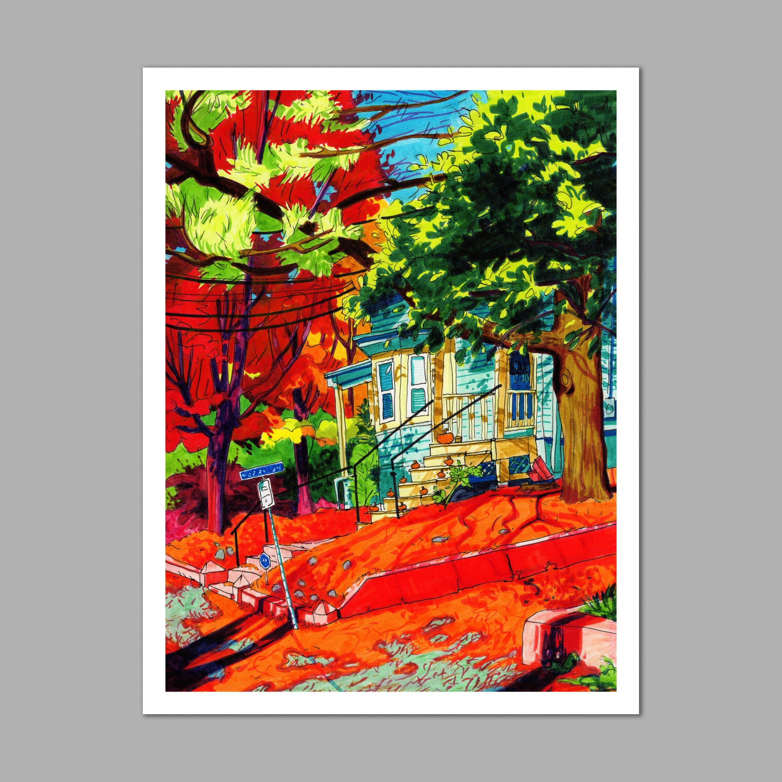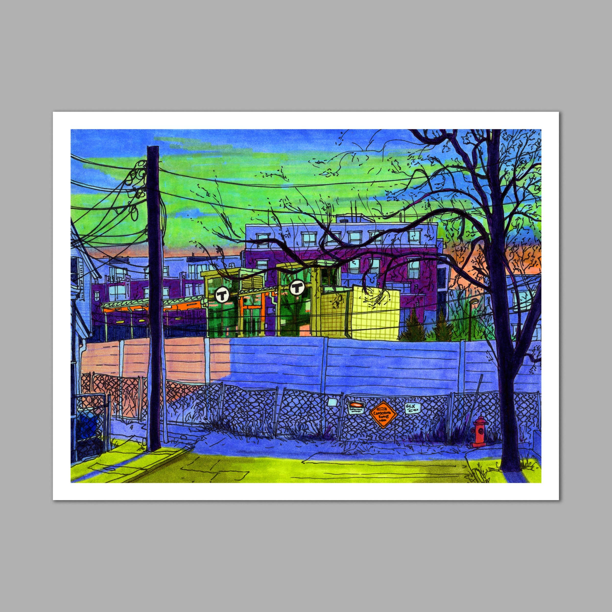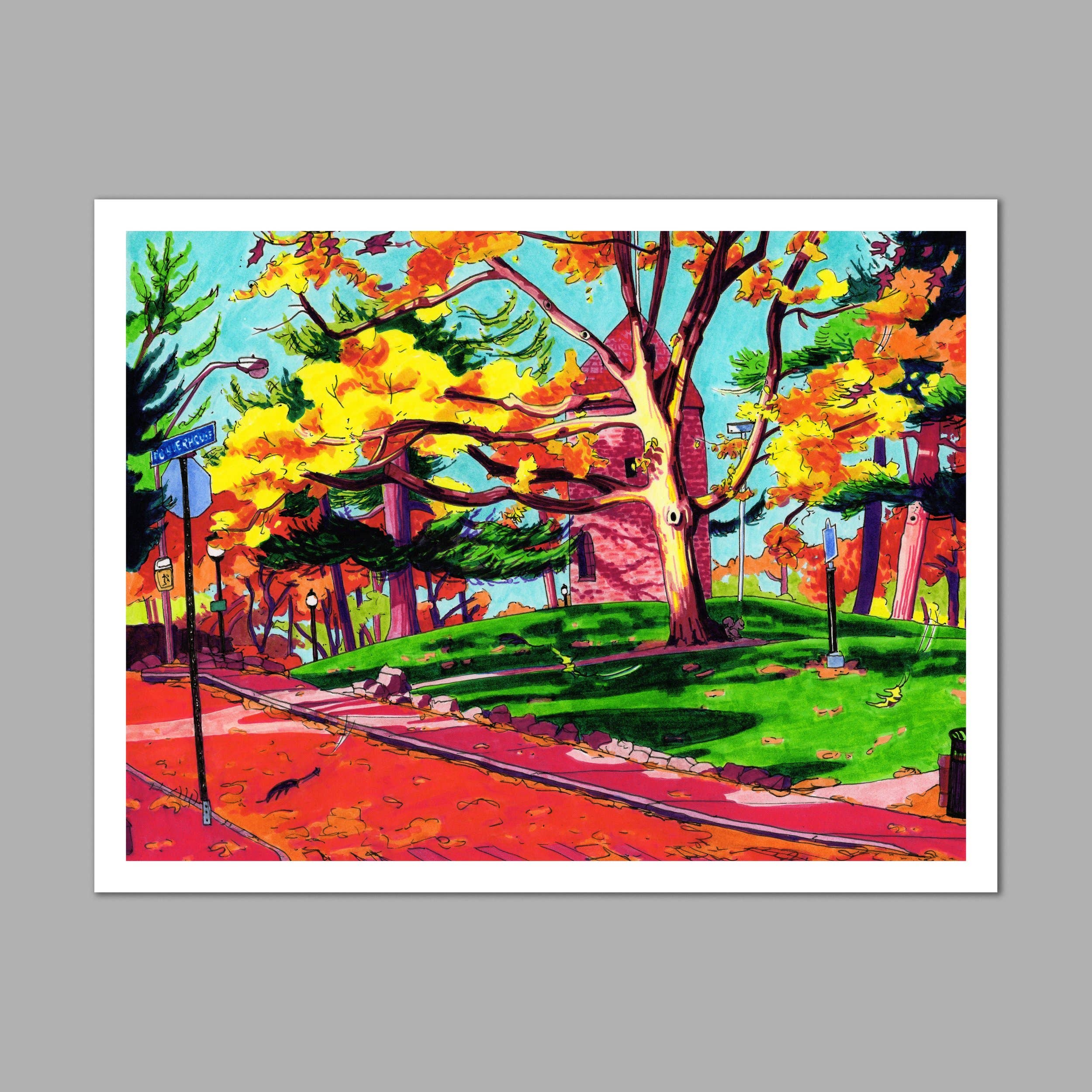 Hi, I’m Stephanie! I’m an illustrator and designer based in Somerville, MA. Inspired by connecting with the small moments of everyday life, I draw local places from observation. I love to illustrate every detail that makes a place feel like home, from cool trees to messy telephone poles, so that each drawing feels like a whimsical photograph of that specific time and place. My drawings are characterized by free-handed outlines drawn directly onto the paper in pen and colored in bright marker. I’ll draw from anywhere, in rain or shine, from a bench or a curb, standing in a crowd or sitting on a cold rock alone in a forest. Using playful saturation and unexpected color, I seek to find the heart, joy, and nostalgia in the places and objects we look at every day. I hope you find your favorite place in my drawings!