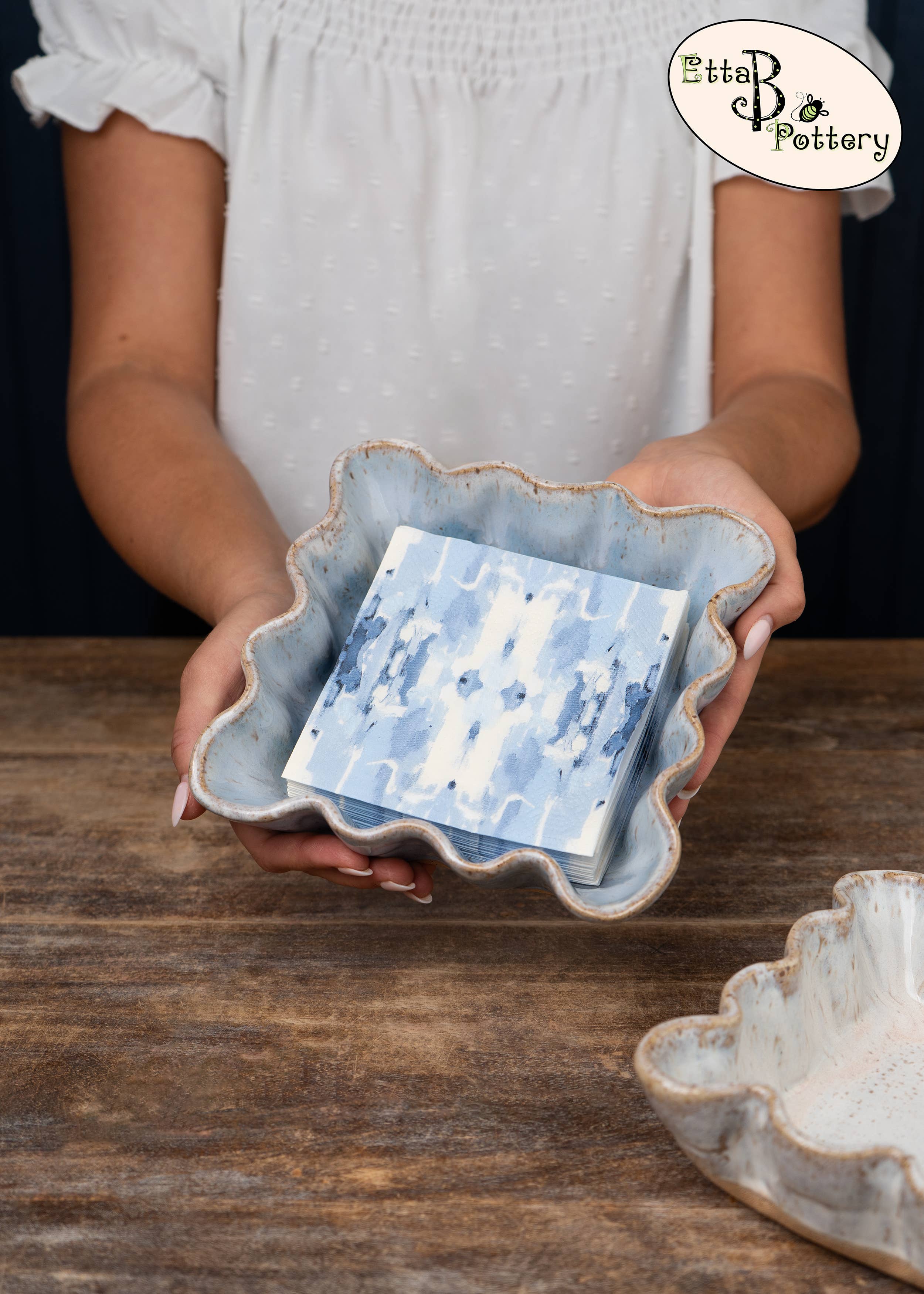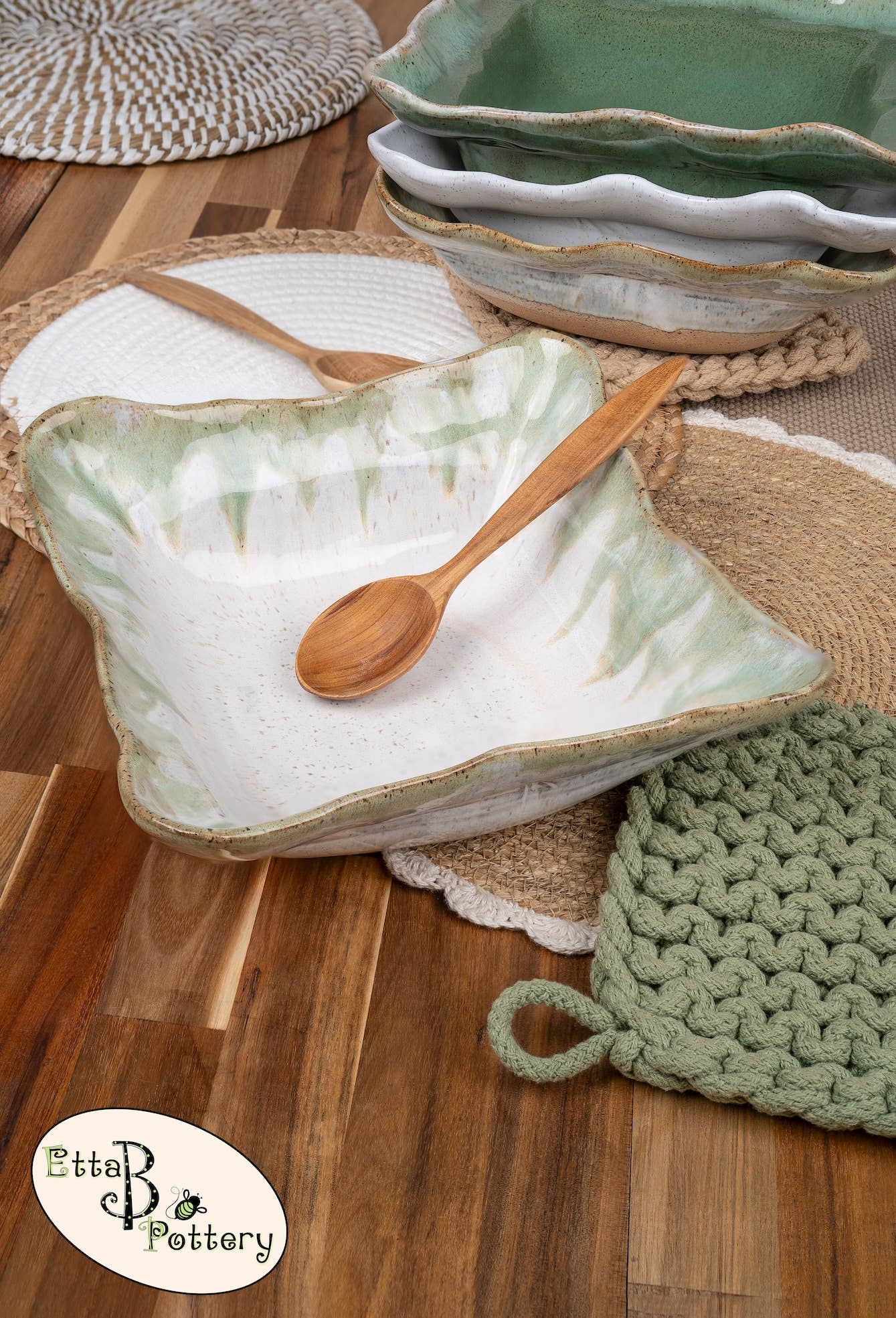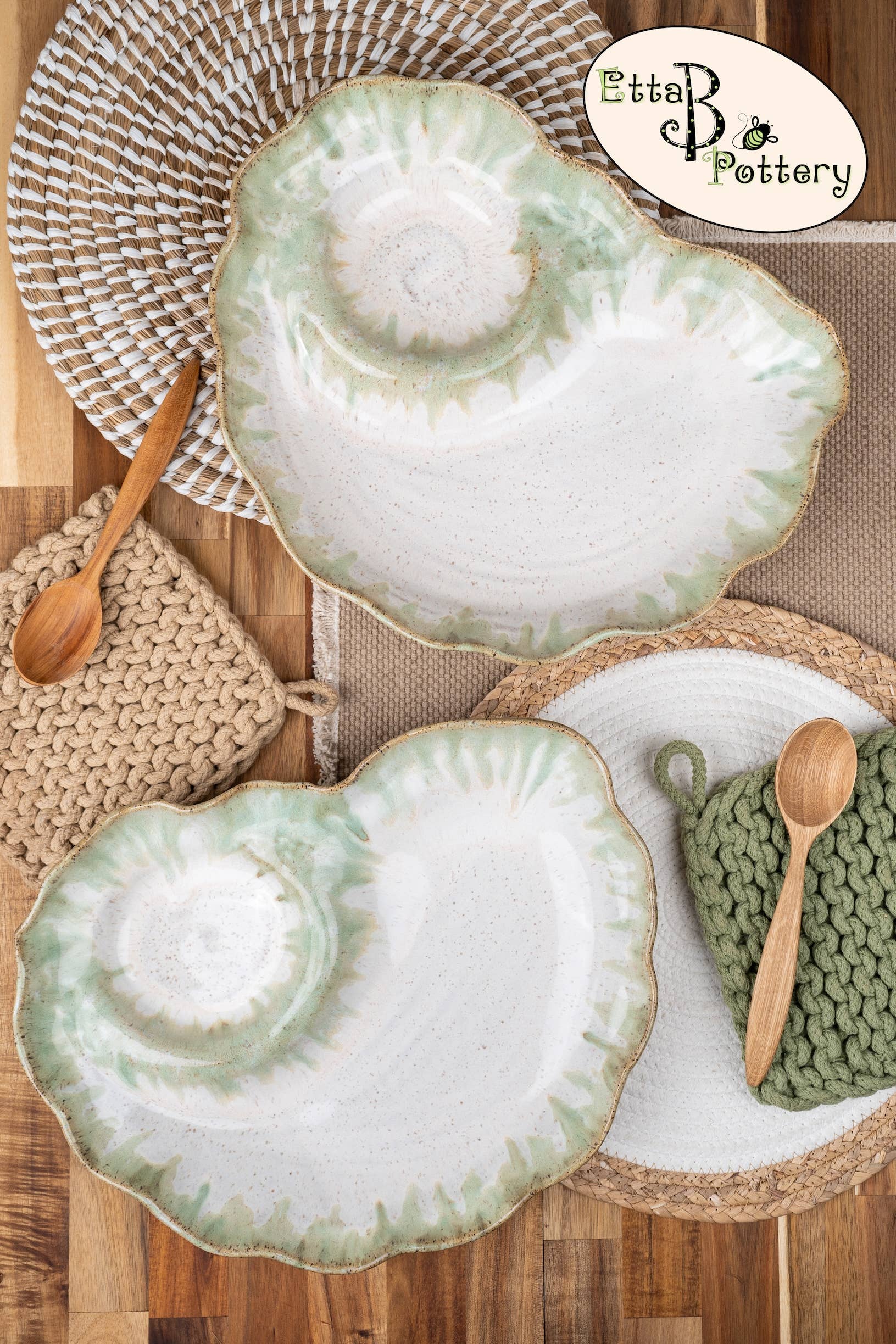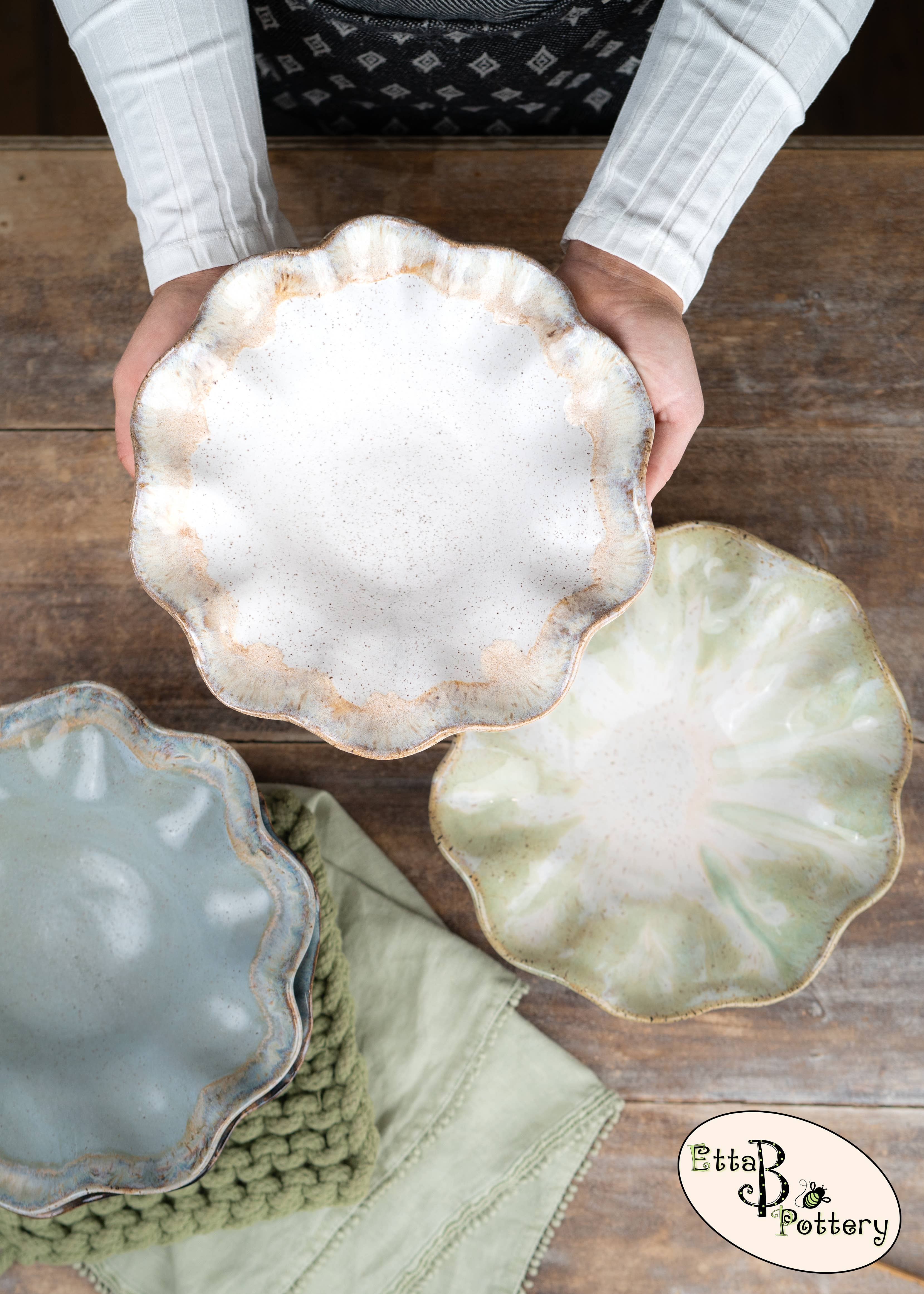 Originally founded in an old farmhouse, Etta B Pottery is proudly handmade, hand-poured & hand-painted in Mississippi. We started this family venture in 2008 and it has remained our mission to create beautiful pieces, both decorative and functional that you can enjoy with heirloom quality for years to come. Etta B Pottery strives to continue bringing unique designs every year that will be treasured gifts for your home, family, and friends. Each piece has its own individual character and color, with no two pieces ever coming out of the kilns the same. Our team of artisans hope you find this to be a lovely and special quality of our handcrafted pottery.