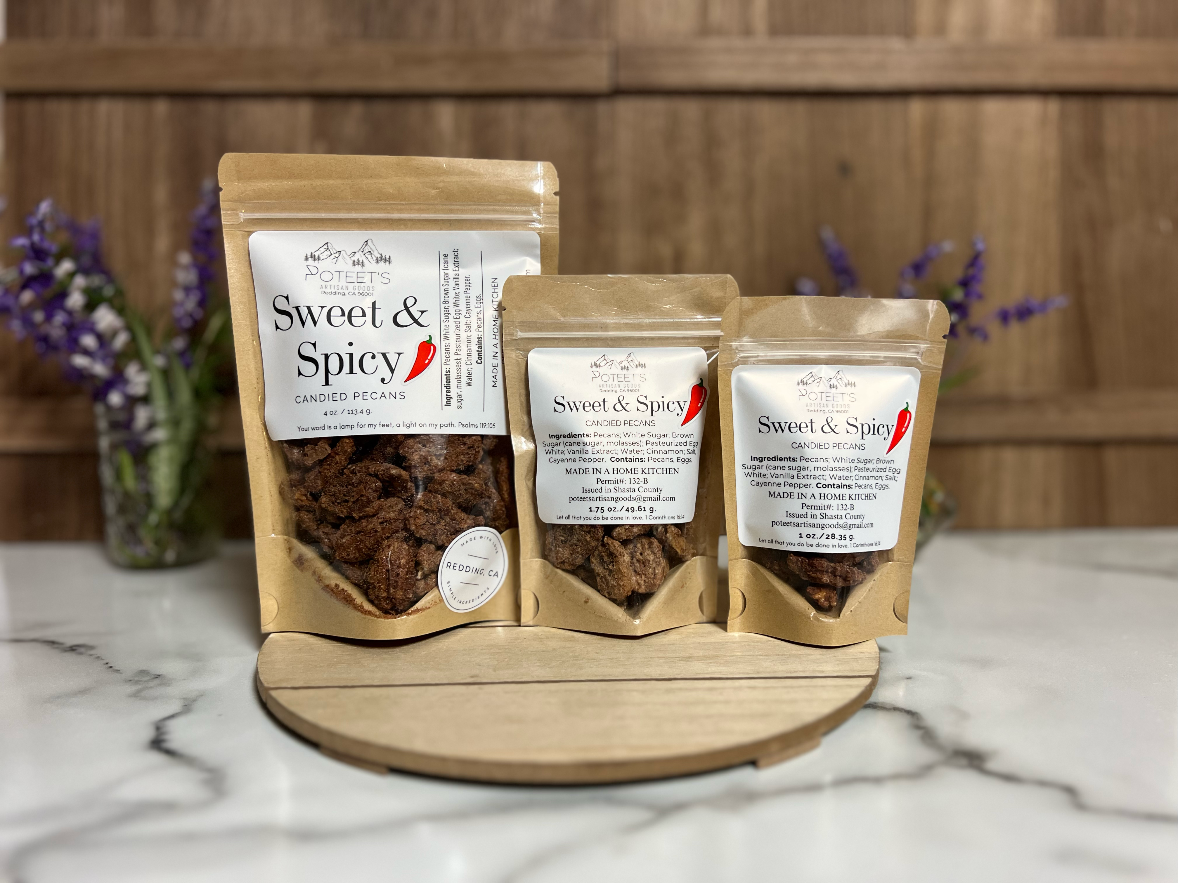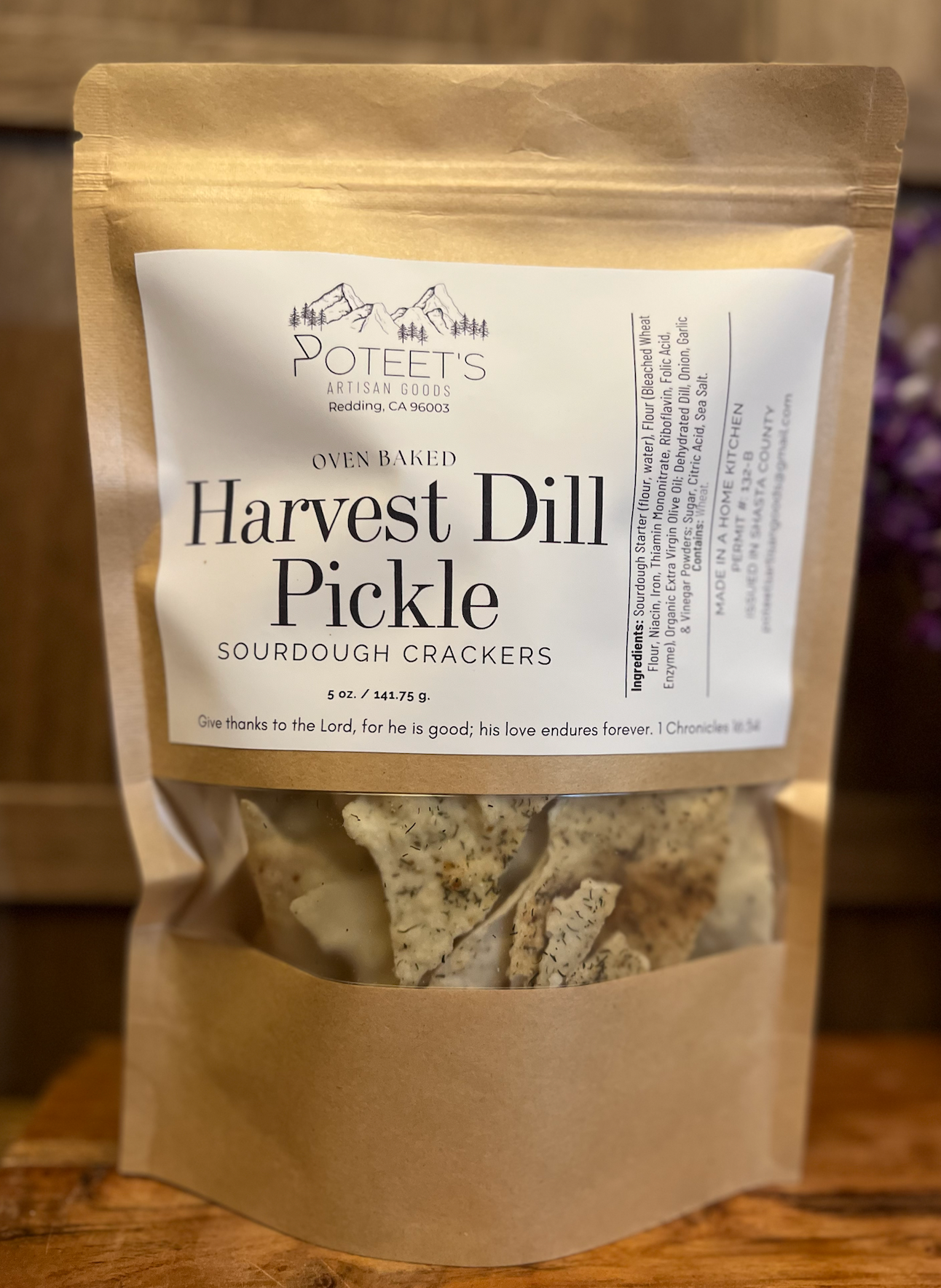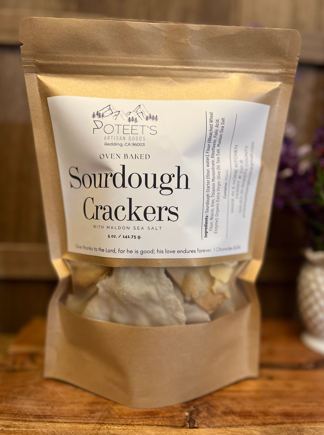 Poteet’s Artisan Goods was born in Redding, CA, out of a passion for crafting high-quality, wholesome foods made from scratch. Founded by Kim Davis, the business is dedicated to providing preservative-free, chemical-free creations that nourish both body and soul. Kim’s journey with sourdough began in 2021, leading to an ever-growing selection of handmade goods, including sourdough crackers, bread, dehydrated starters, candied pecans, seasoning blends and more. Poteet’s Artisan Goods is committed to high quality products that bring out the heritage of sourdough. Each item is made fresh to order, with a 2-5 day processing time depending on the size of the order and pre-existing orders. Named in honor of Kim’s grandmother, Annie Poteet, the business carries forward a legacy of kindness, laughter, and love. Annie’s warmth and generosity continue to inspire every aspect of Poteet’s Artisan Goods. In 2021, Kim’s life was transformed by Jesus, and her faith remains at the center of all she does. Each product is thoughtfully labeled with a meaningful Bible verse, offering encouragement and comfort to those who receive it. I am truly looking forward to working with you and brining these yummy goodies to you and your customers!