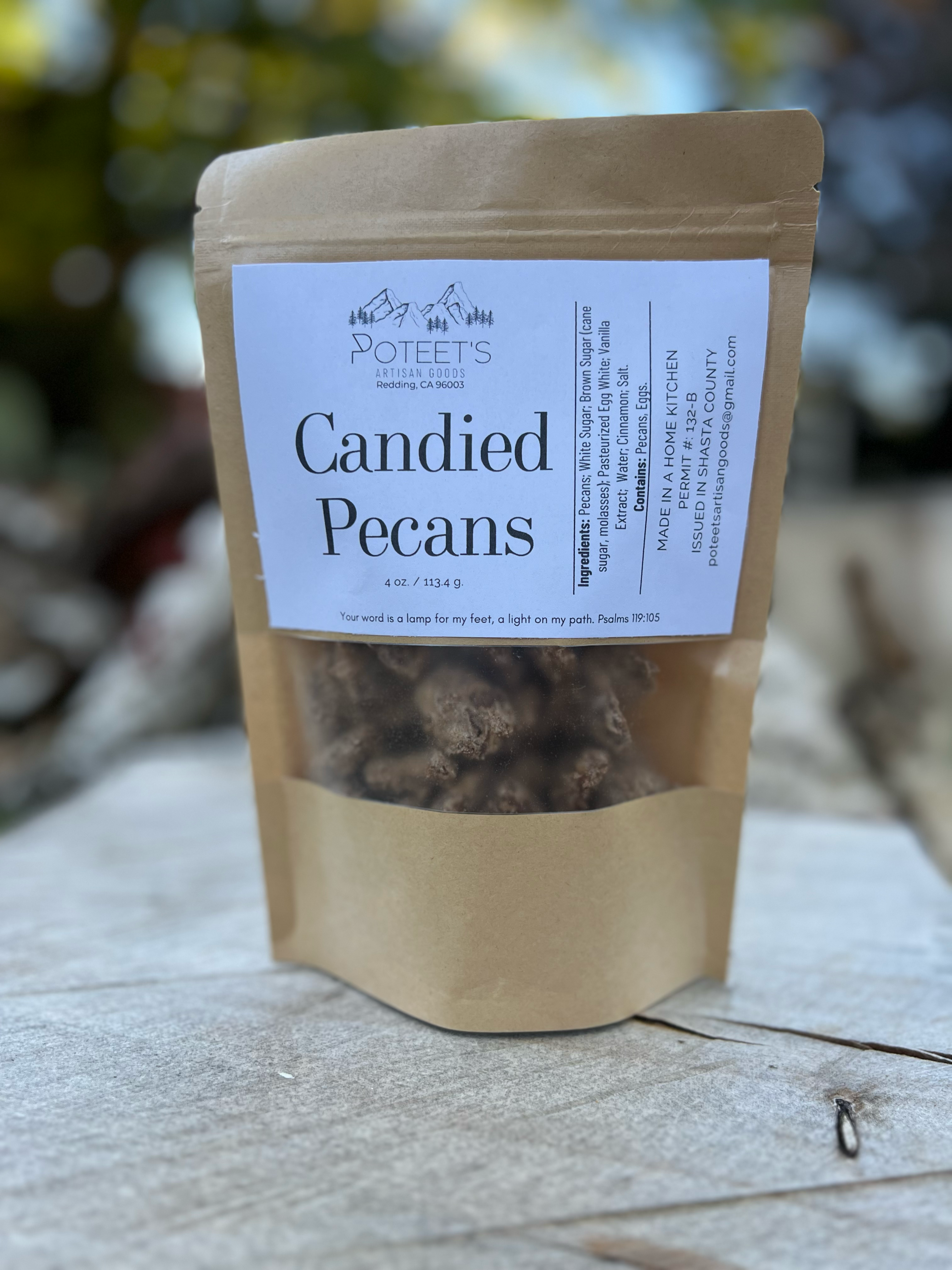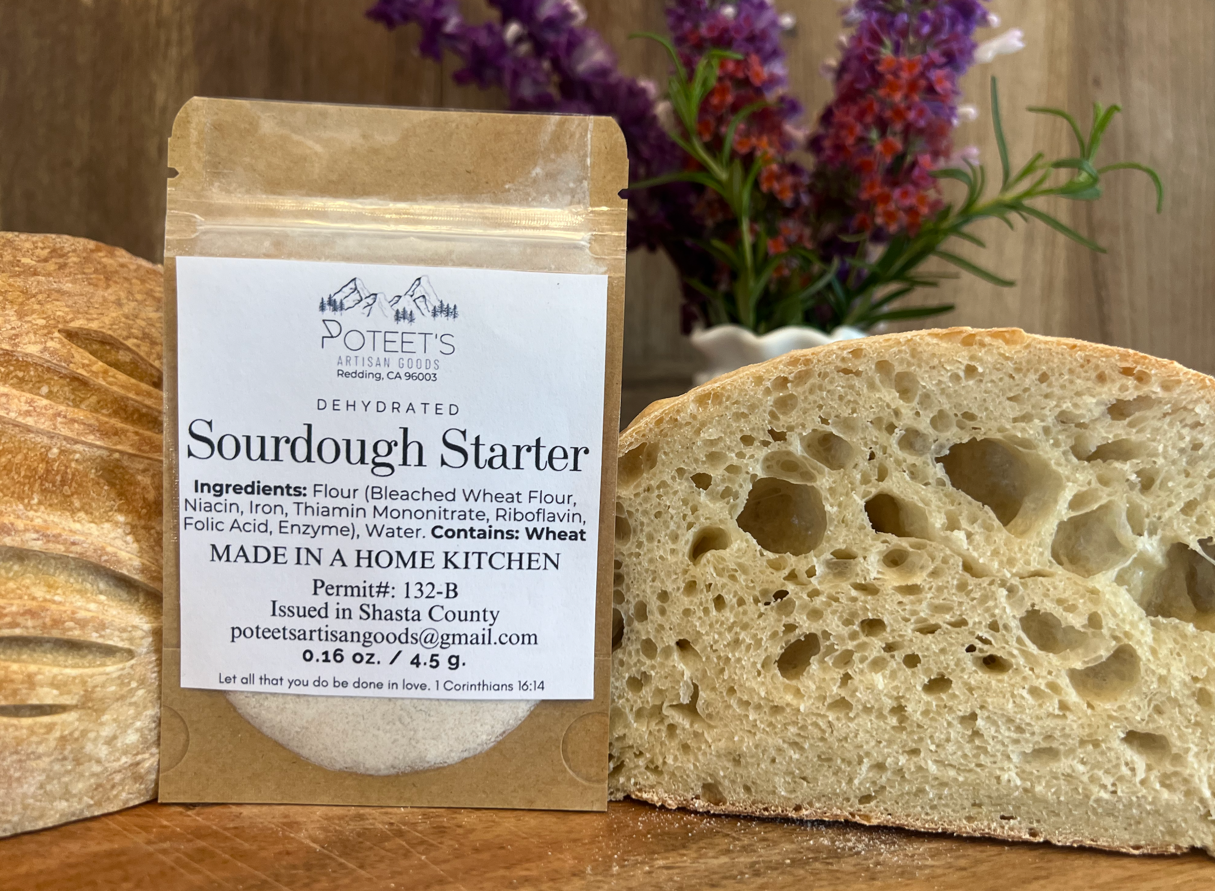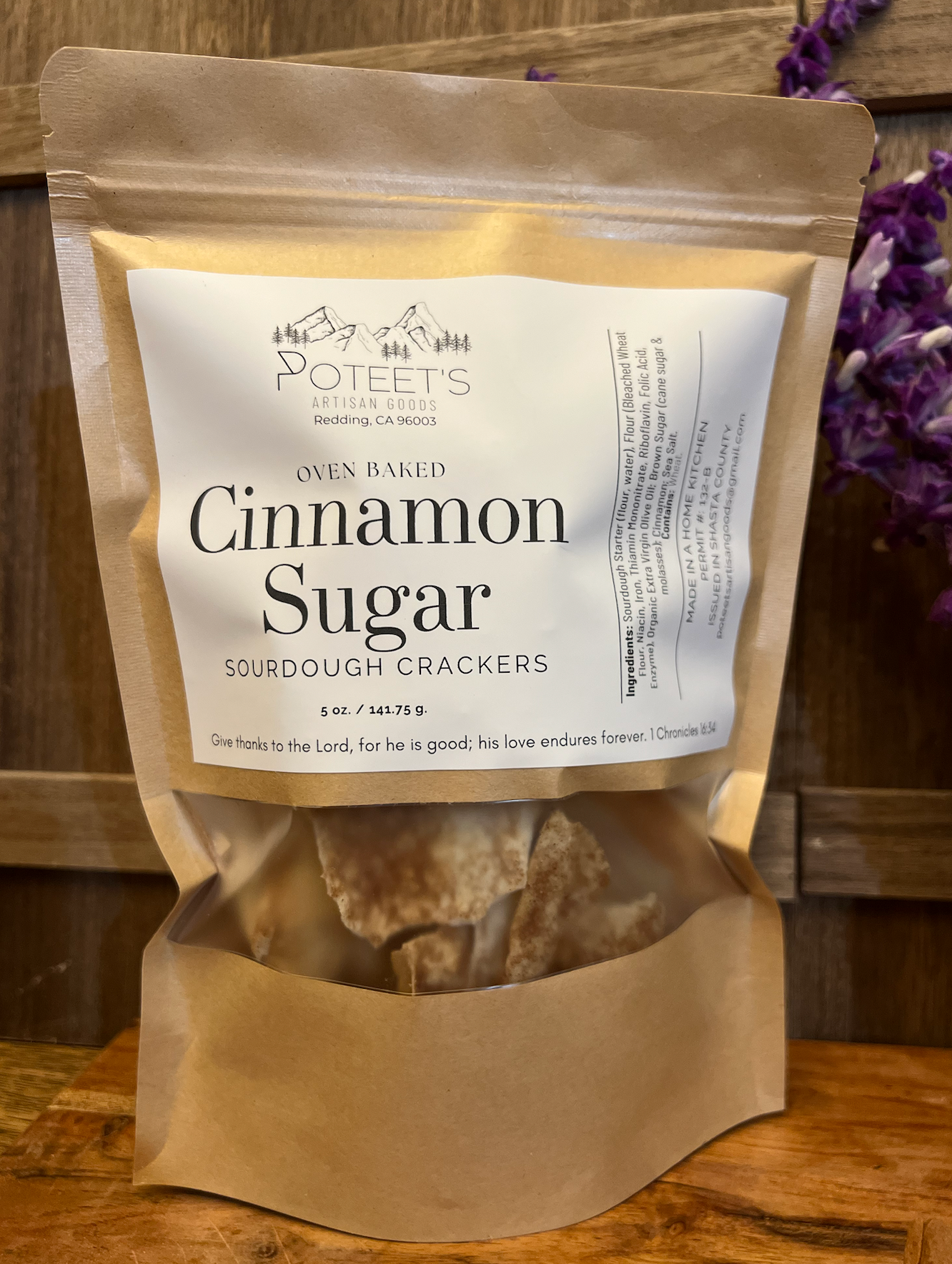 Poteet’s Artisan Goods was born in Redding, CA, out of a passion for crafting high-quality, wholesome foods made from scratch. Founded by Kim Davis, the business is dedicated to providing preservative-free, chemical-free creations that nourish both body and soul. Kim’s journey with sourdough began in 2021, leading to an ever-growing selection of handmade goods, including sourdough crackers, bread, dehydrated starters, candied pecans, seasoning blends and more. Poteet’s Artisan Goods is committed to high quality products that bring out the heritage of sourdough. Each item is made fresh to order, with a 2-5 day processing time depending on the size of the order and pre-existing orders. Named in honor of Kim’s grandmother, Annie Poteet, the business carries forward a legacy of kindness, laughter, and love. Annie’s warmth and generosity continue to inspire every aspect of Poteet’s Artisan Goods. In 2021, Kim’s life was transformed by Jesus, and her faith remains at the center of all she does. Each product is thoughtfully labeled with a meaningful Bible verse, offering encouragement and comfort to those who receive it. I am truly looking forward to working with you and brining these yummy goodies to you and your customers!
