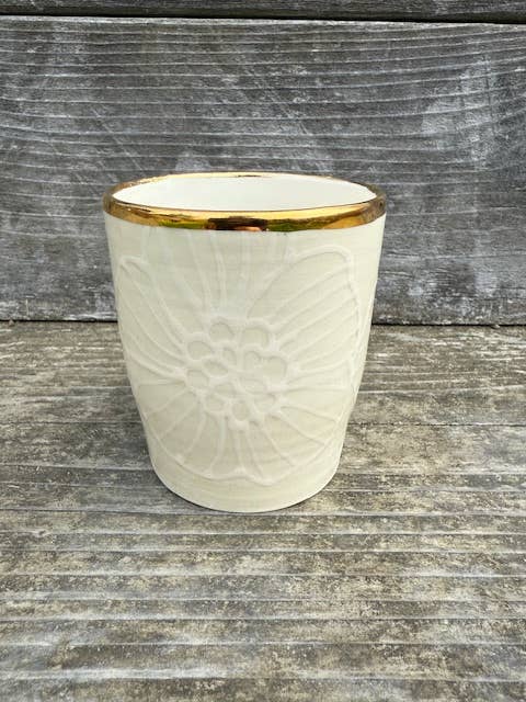 Nicole Hsieh creates timeless, handcrafted ceramics that carry a sense of quiet nostalgia and lived history. Influenced by a 1970s childhood surrounded by antiques, vintage textures, and heirloom forms, her work evokes the warmth and intimacy of objects passed through generations. Each piece is adorned with delicate, hand-drawn florals—Dahlias, Dogwoods, Roses—and softly kissed in 22-karat gold luster, adding a touch of opulence to everyday rituals. Made slowly and intentionally, her vessels celebrate imperfection, individuality, and the beauty of things made by hand. Hsieh describes her ceramics as pieces that feel as though they’ve already lived a lifetime—soulful, enduring, and meant to be held, used, and remembered.