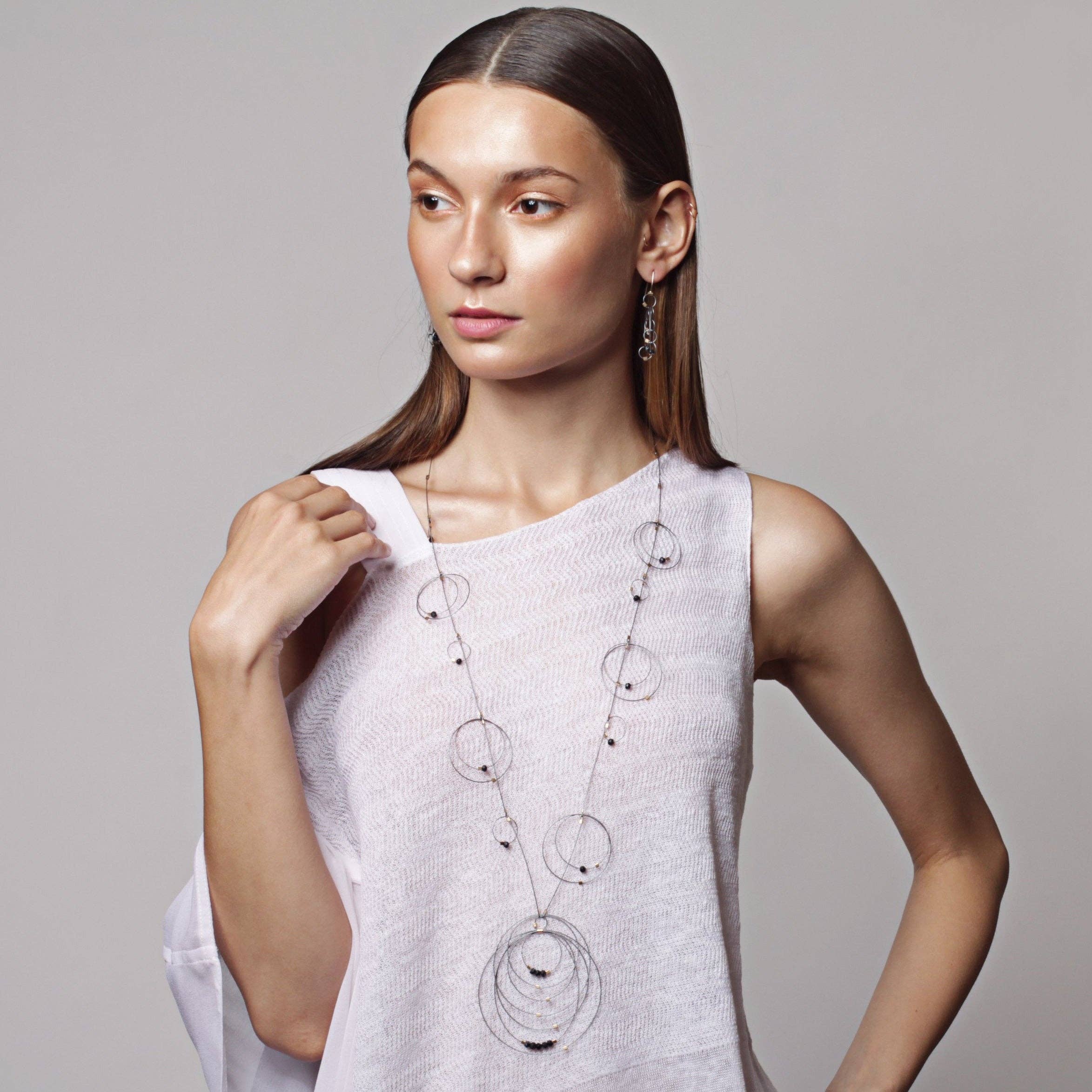 Each MPR Jewelry by Meghan Patrice Riley piece is fabricated by hand in the MPR Atelier in Brooklyn, New York by trained artists and metalsmiths. Mixing metals with textile techniques, I experiment with classic, elementary materials like our classic nylon-coated stainless steel cable wire mixed with fine metals and semi-precious stones to reinterpret them to create sculptural, contemporary jewelry that is feminine, luxurious, and alluring as well as engineered for wearability and durability. We work with nylon-coated stainless-steel cable that is coated in fine metals like 24k yellow gold and sterling silver. This little cable looks like a wire but is actually 49 miniature wires woven together to make a monofilament-like miniature stainless steel cable that is soft like a textile but has a super strong core of steel. The fabrication process of the cable is similar to that of cables for suspension bridges which are engineered to move with the shifting plates of the earth so as to not collapse but sway with movement. I then add little square connectors and findings of 14k gold fill and sterling silver with touches of semi-precious stones which makes these pieces hypoallergenic and luxe. The collections look ultra-dainty and are extremely lightweight (great for earrings!) but can be crushed and bounce back into shape because of the properties of the cable. The jewelry collections offered are truly unique, thoughtful, handcrafted and, most of all, wearable.