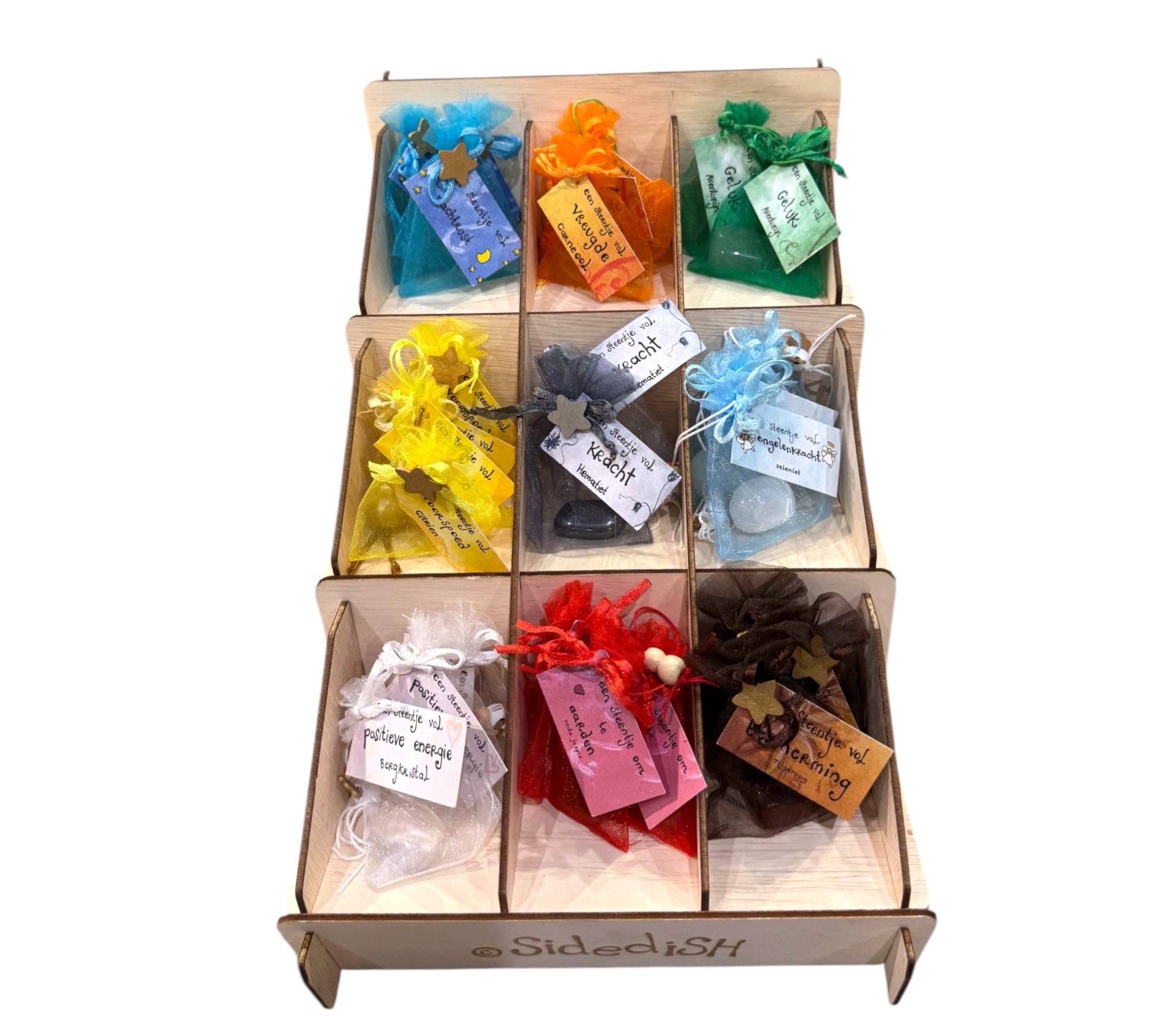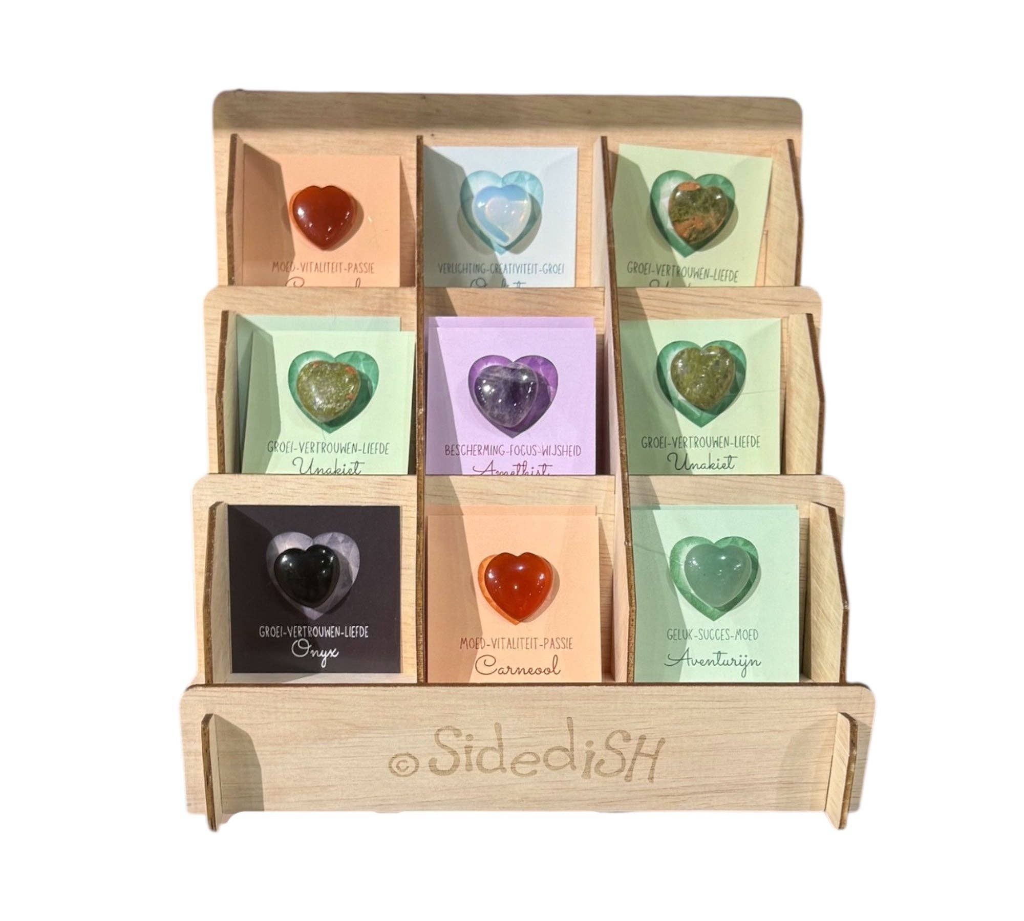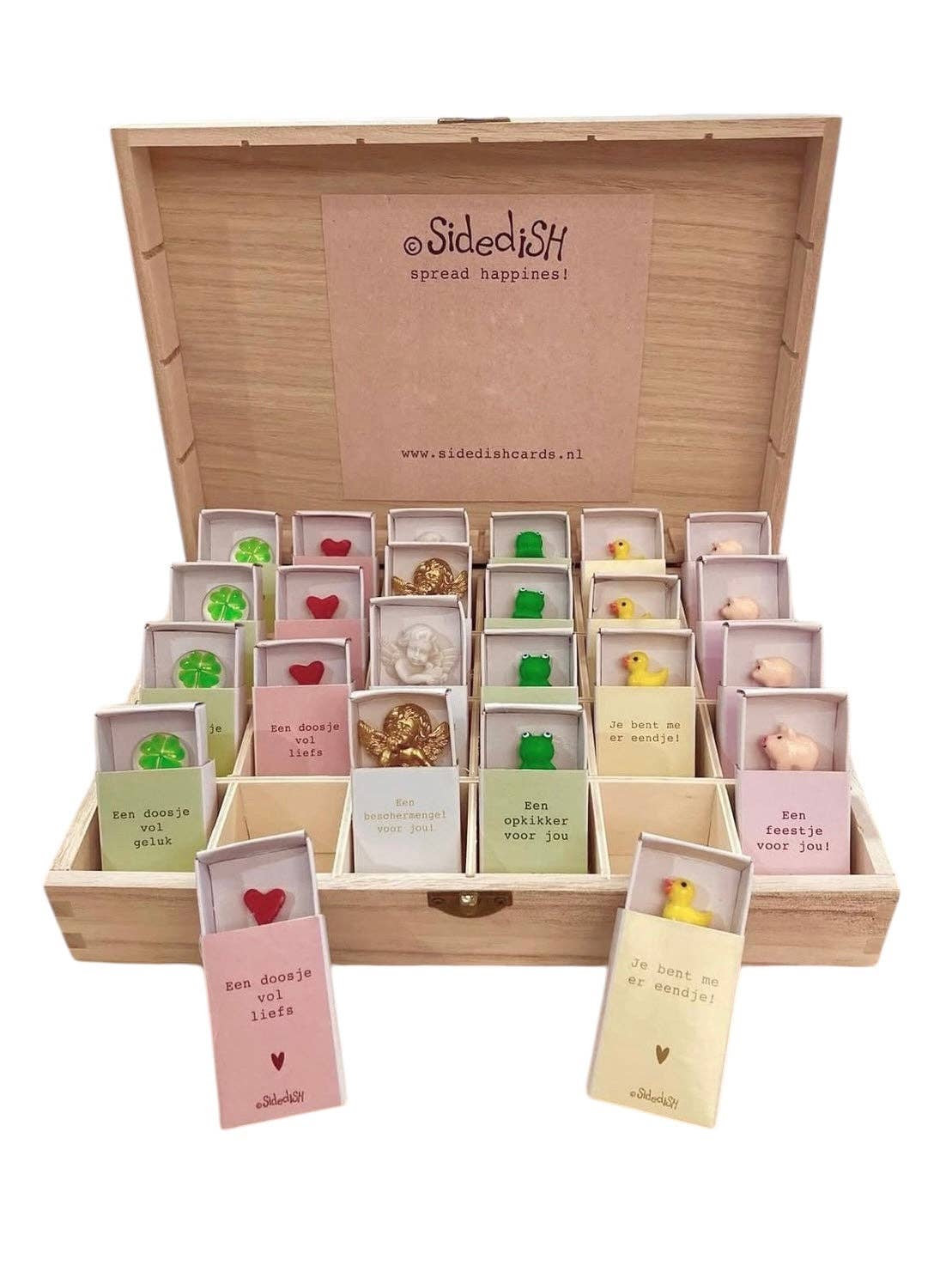 Sidedish (anno 2013) has been supplying unique cards and gifts to more than 180 points of sale in the Netherlands for more than 8 years. What is essential here is the major contribution to the production work done by people with a distance from the labor market. They work at Makers & Brands -, Hart van Velp - and Bisonder in Gelderland; and recently we also have help from the employees of Lekerweide in Wognum. Artist Lianne Oost, graphic designer and initiator of the brand, is also assisted by a small group of employees in designing and making handmade and assembled products. Our main goal? That our products make people happy! Our motto is therefore: Spread Happiness!