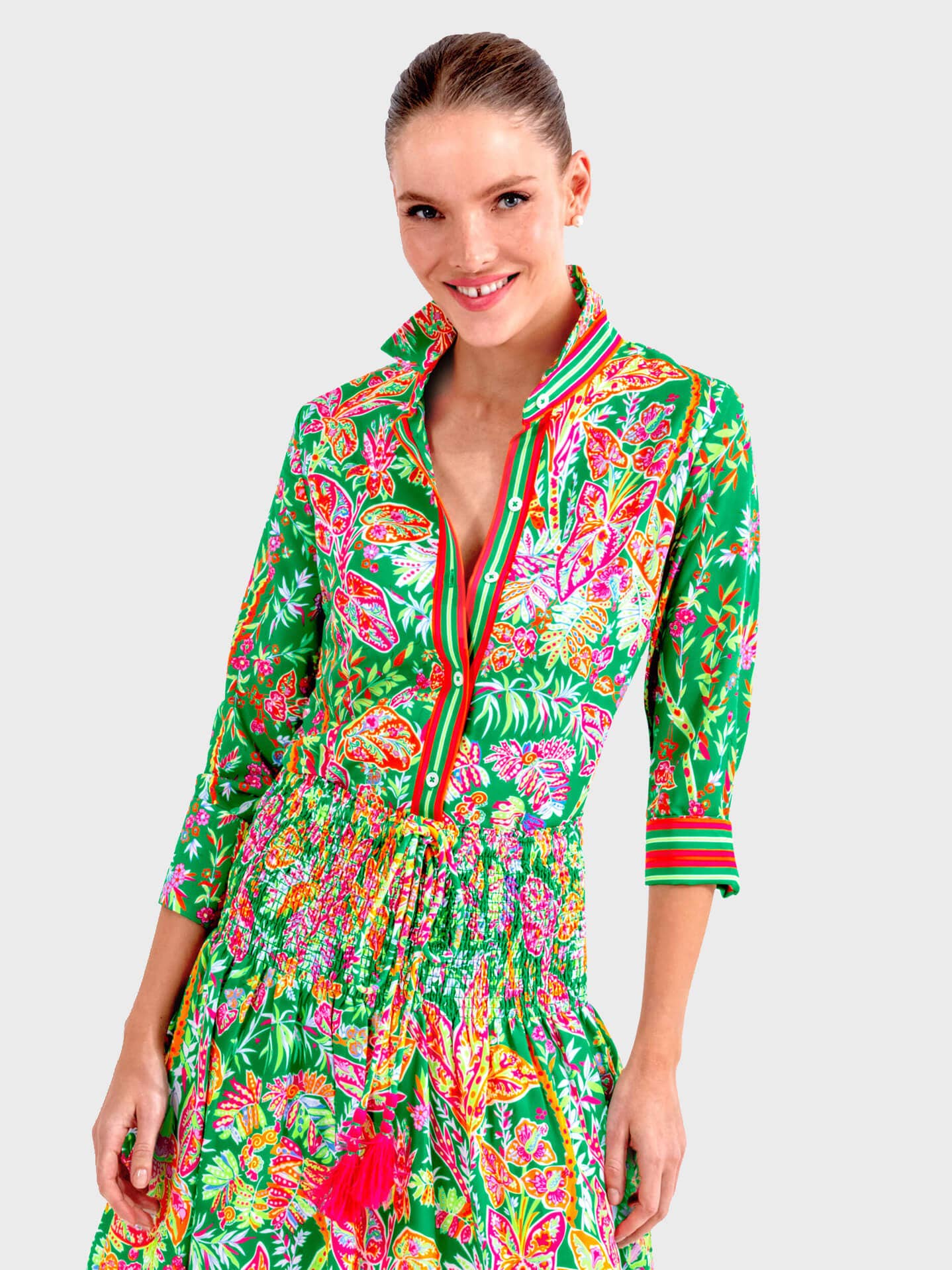 About Gretchen Our brand embodies a place that is chic, joyous, playful and fun,” says Gretchen Scott, founder, and CEO of Gretchen Scott Designs. Our mantra is: “Laugh More, Gripe Less, Ignore Critics, Say Yes, Order Dessert, Love Life.” These words are sewn into everything we make. We imagine people smiling as they read those words while dressing. The brand was born in Gretchen’s living room when she began producing unique flowered baskets. Armed with glue guns, silk flowers, woven baskets, creative passion, entrepreneurial vision, and most importantly, determination, she began her journey. The company quickly outgrew the space and evolved into a lifestyle brand. Gretchen worked in many different fields before starting her business. She was the former Market Research Director at Smithsonian magazine, sold advertising for Conde Nast, renovated and sold houses, and ran a decorating business. Gretchen says, “Having reinvented myself so many times, I’ve learned how important it is to evolve but to always remember the lessons. The lessons are what make you wiser.” Travel influences Gretchen’s designs. She finds inspiration wherever she goes. Her designs reflect a global perspective. “India is an integral part of what I design,” says Gretchen. “Indian simplicity clarified even the most complicated design elements. Hand blocks, complex patterns, and vibrant colors define our look. India has taught me to keep my colors true and vivid.”