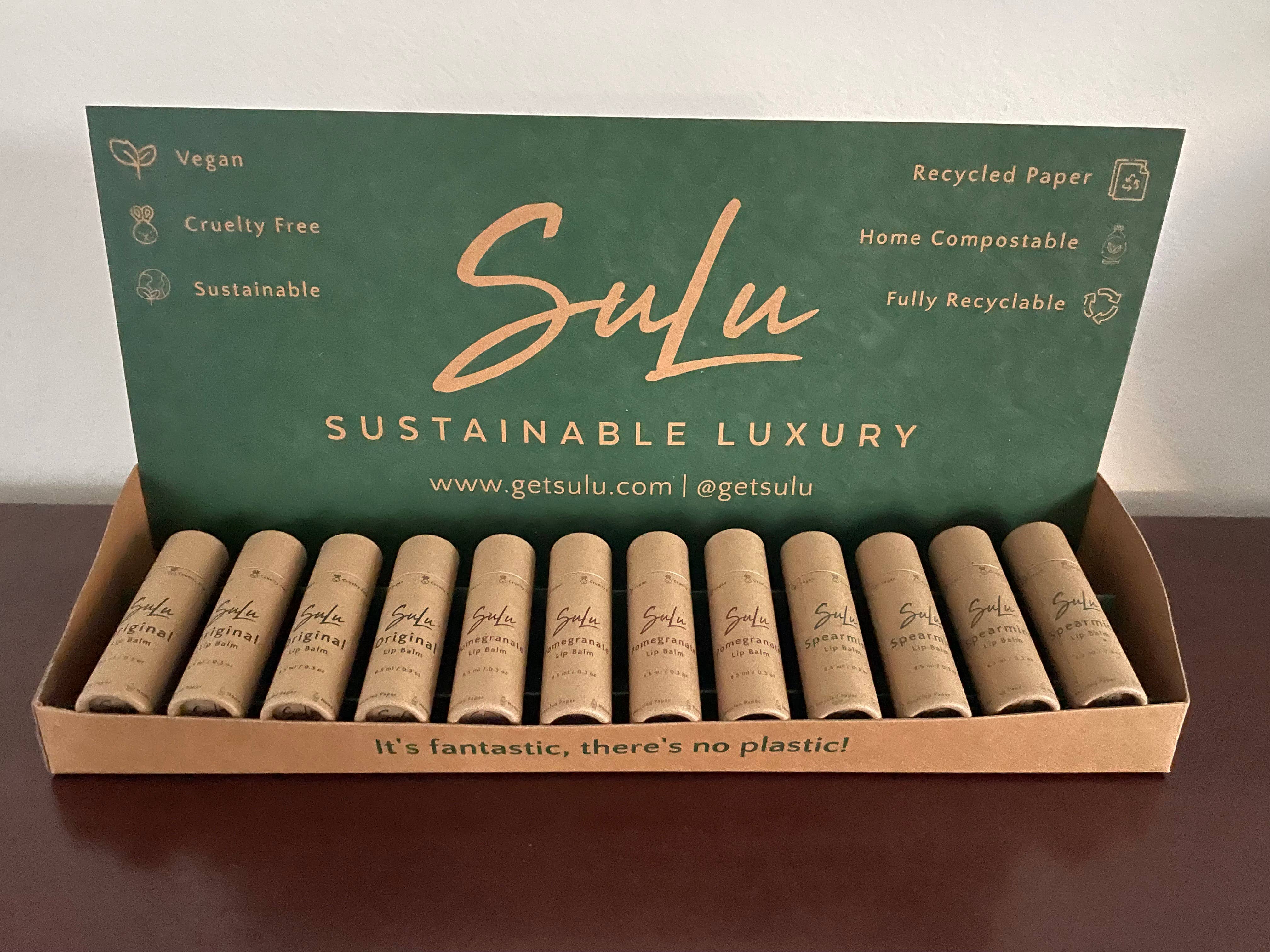 SuLu embodies Sustainable Luxury and everything we do is focused on delivering value through quality. We are a 100% plastic-free and 100% zero-waste brand that has launched a planet-friendly lip balm. All SuLu lip balms are sustainable, vegan, use organic ingredients, and NEVER use synthetic or artificial preservatives or perfumes. Hand poured in the USA, SuLu lip balms have a very nourishing and silky smooth application with a natural matte finish. The paper tubes are made in the USA with recycled paper, are plastic-free, and can either be reused, home-composted, or recycled again. Each lip balm is 8.5 ml / 0.3 oz and will typically last about a month and a half of regular use, that's 2X the size of standard plastic lip balm tubes and none the plastic! To show even more love for our planet, SuLu has partnered with CleanHub, which partners with local advocates to remove plastic pollution from the most susceptible locations before it ends up in our rivers, seas, and oceans.