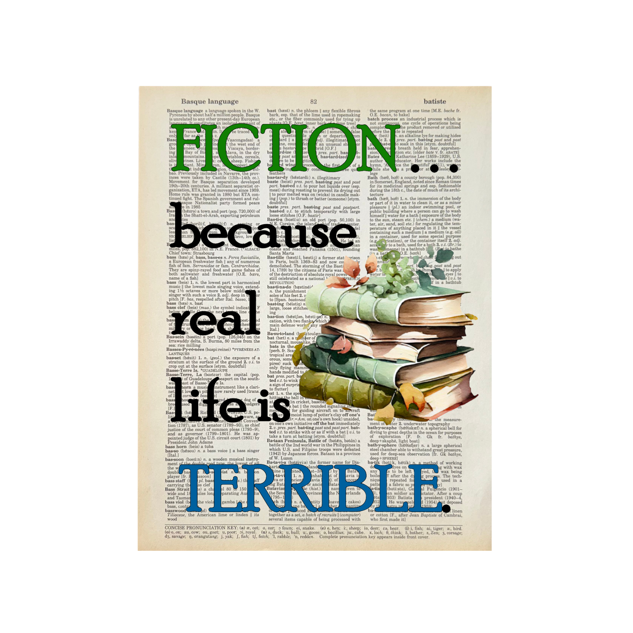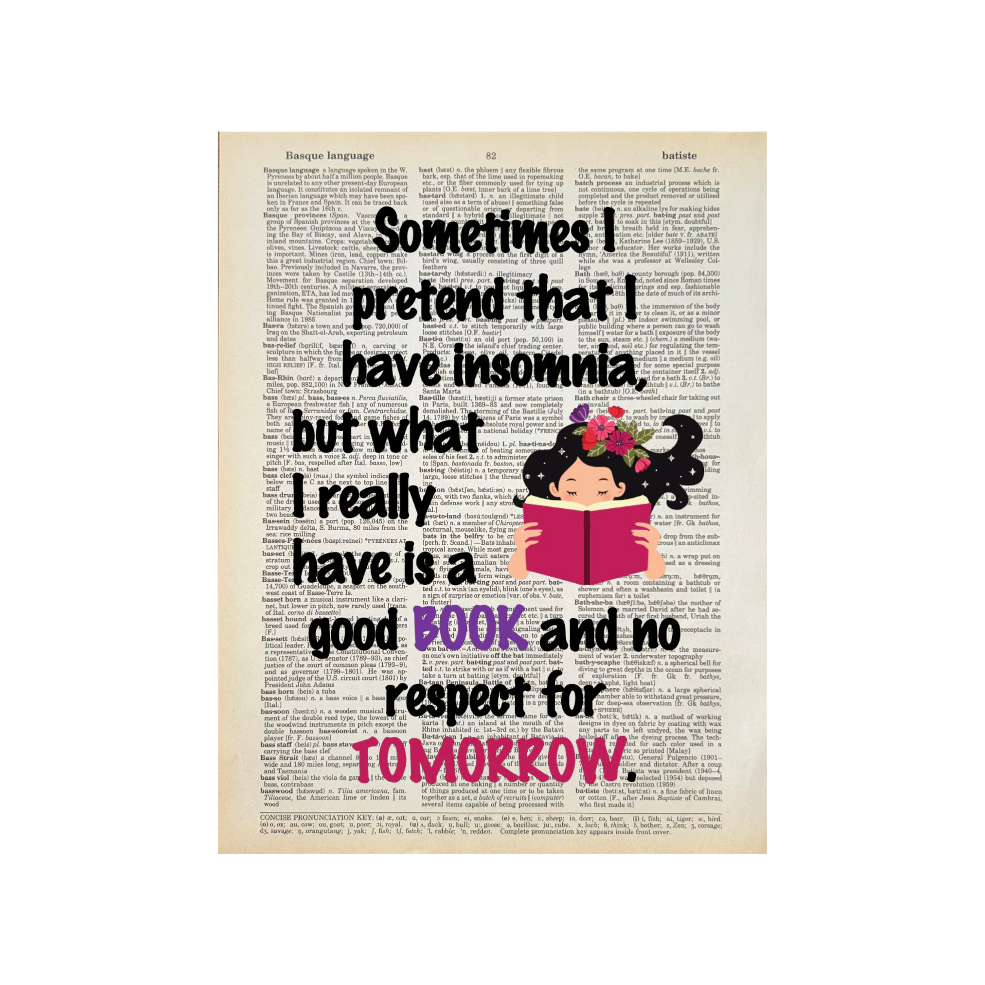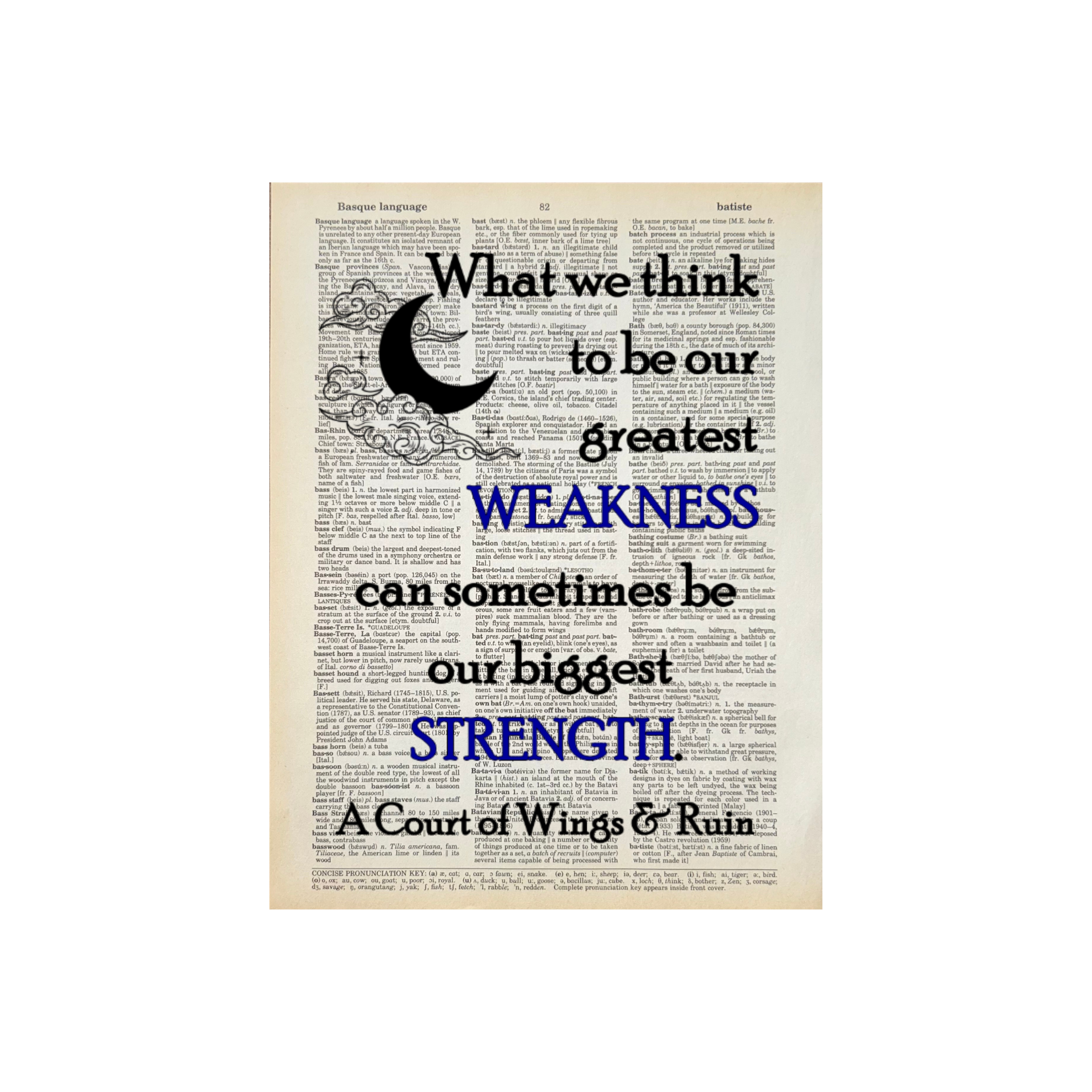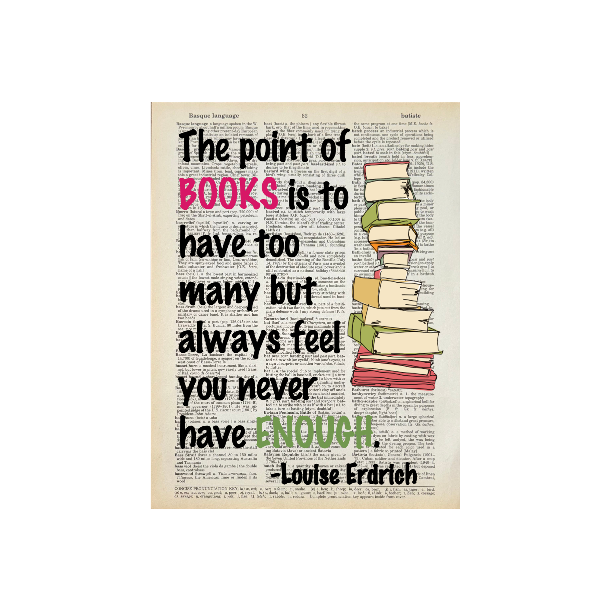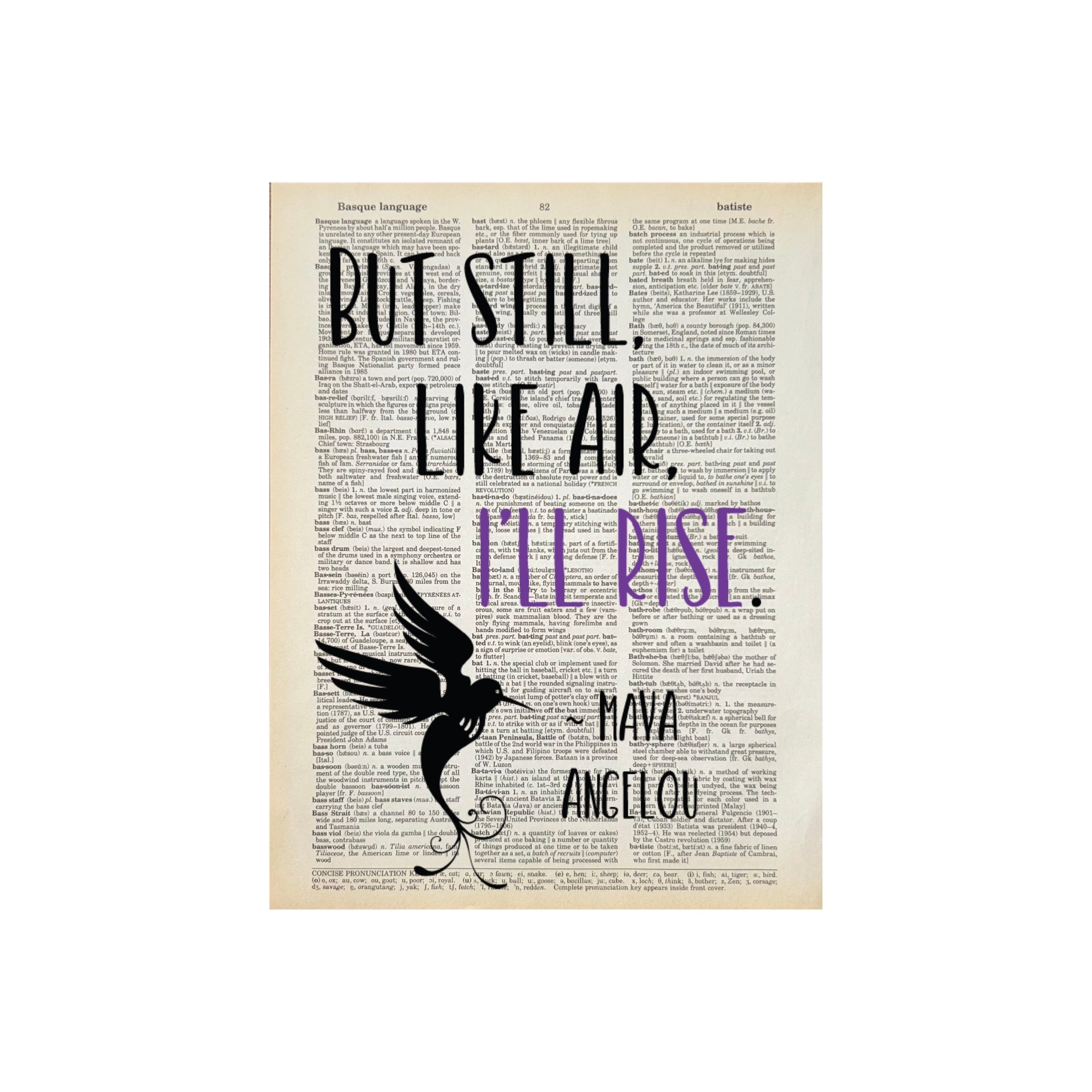 Diana and Roz (the owners of Bookish Birds) have been best friends since college and are serious book lovers. We repurpose old books (mostly dictionaries) into page art and sell them across the country to bookstores and gift shops. We are happy to work with stores to create custom pages for your spaces and customers. Just reach out. For all Bookish Birds Prints: - Quotes are printed on real dictionary pages, so no two pages are exactly alike. - Patinas will vary across pages because each dictionary has slightly different coloration. - Pages are printed on random dictionary pages so the print will not necessarily be on the exact page from the picture. - Frame not included. - Pages come in sealed sleeves with cardboard backer. We can leave them unsealed upon request. - Pages frame up beautifully. Dictionary page size is roughly 8.25"x10.75" - No minimum purchase. - Free shipping on orders of $250 or more