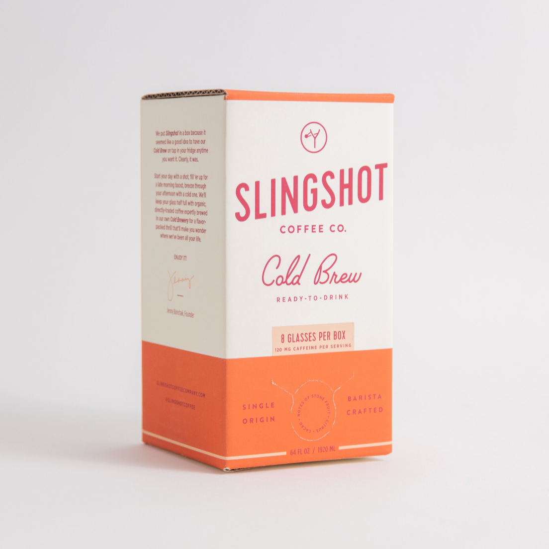 I'm an up & at 'em morning person, and the first thing I do when I wake up is take a hit from a Slingshot Fridge Box. I sold my car for $5000 to start Slingshot Coffee Co. because I believe in better, more exciting coffee experiences. As a national award-winning barista and veteran of the Specialty Coffee industry for more than 12 years, I turned the $5000 I had into a company that brings exceptional coffee beverages to life. From our pioneering organic, single-origin Cold Brew & Nitro Flash Brew, to our life-giving Coffee Sodas, we innovate approach-ably… yet interestingly. We want to get you just as amped about taking coffee to new heights as we are. Our dedication to building unmatched coffee beverages and a company with substance starts with a commitment to organic coffees, a transparent supply chain, and our own Cold Brewery where we build every recipe from the ground up and craft every beverage ourselves. It ends with pure enthusiasm to live our vision to lift up the coffee experience for all. I'm proud to be a woman-founded company that pushes to be the best we can for ourselves, our team, our community and our fans. So sip it by yourself, make it for a friend or share it with a stranger. Whatever you do, enjoy it.