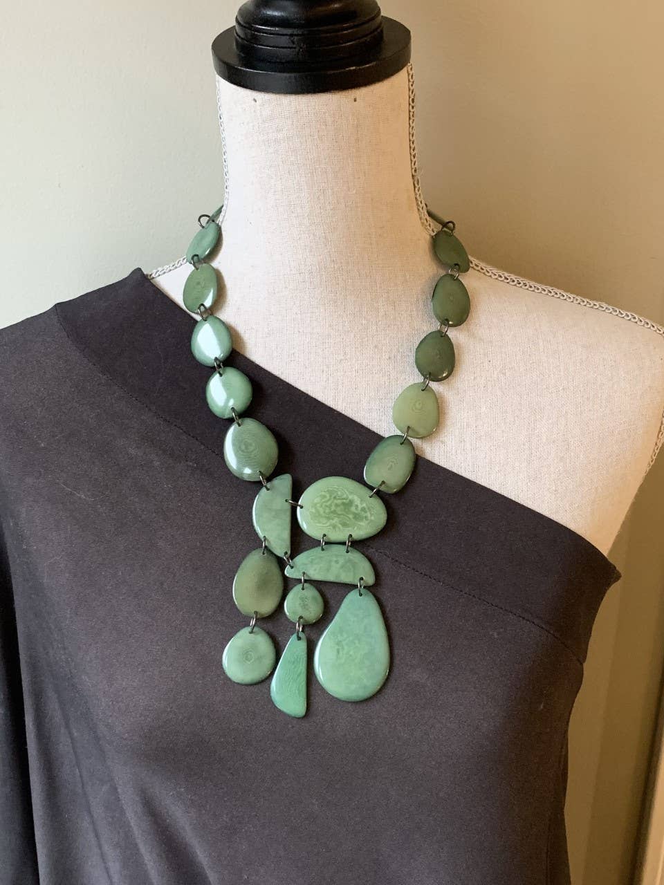 Veronica Riley Martens jewelry design focuses on ecofriendly, organic and natural components with a modern twist. With a background in interior design, she creates unique pieces that play with color, texture, size, proportion. The main component of Veronica's jewelry line consists of tagua nuts. These nuts are indigenous to the rainforests in South America. They are sustainably harvested and are a renewable resource that helps preserve the rainforests. Tagua nuts are dried, cut, shaped and dyed by local craftpersons in South America. Veronica then purchases these beads in various shapes and colors and creates each finished jewelry piece by hand in her Chicago studio, including drilling all holes and designing each piece. The Veronica Riley Martens jewelry line is lightweight, colorful, and can be customized to fit your needs. The line is diverse in style and price point, thus is appealing to young and old!