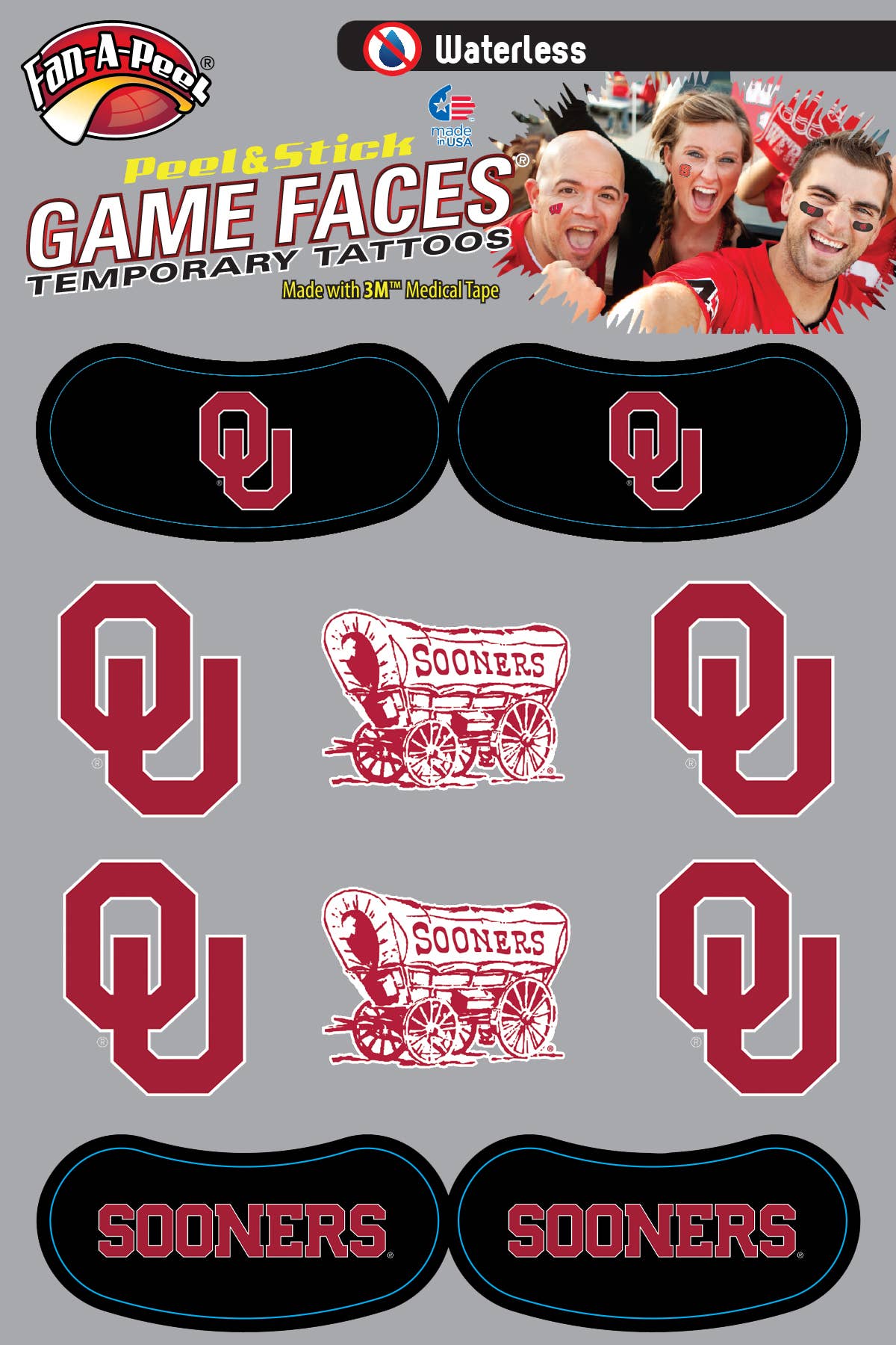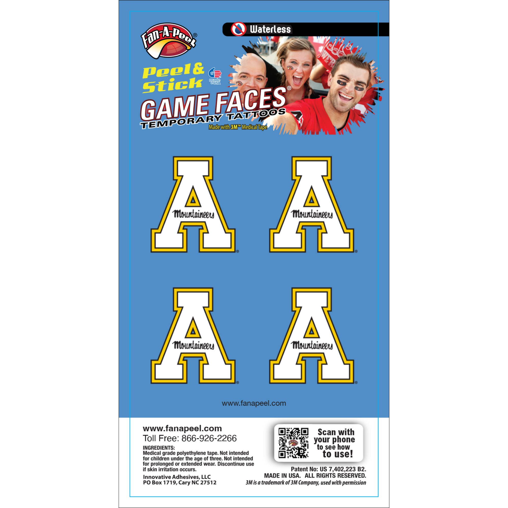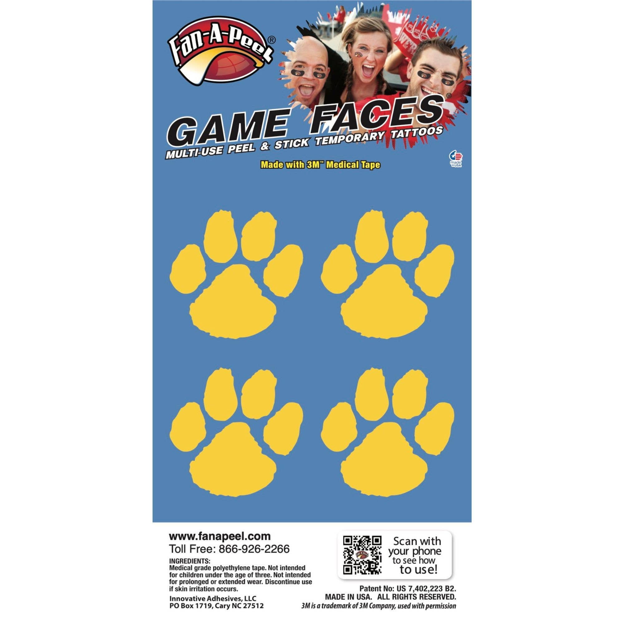 Fan-A-Peel / Gamefaces have long been a staple in the sporting world. First introduced over 25 years ago as a water applied tattoo in collegiate sports has now evolved into a fashion statement for fans, cheerleaders and players. Our products have embraced the fashion trends as well as impulse buy and immediate use by introducing several years ago a tattoo that can be used without water and used on most any surface. As the inventor and patent holder for peel & stick temporary tattoos we have revolutionized the market and made it easier to anyone to wear and remove their "GameFace" at will. We utilize the safest 3M Medical adhesives in our products and have expanded our lines to include metallic and glitter. A game day doesn't go by without seeing our products on TV, print and in the stands. In addition to our mantra for safety and convenance we have embraced sustainability by only using recycled materials in our packaging. All we want is for you to have fun and "put your gameface on"!!
