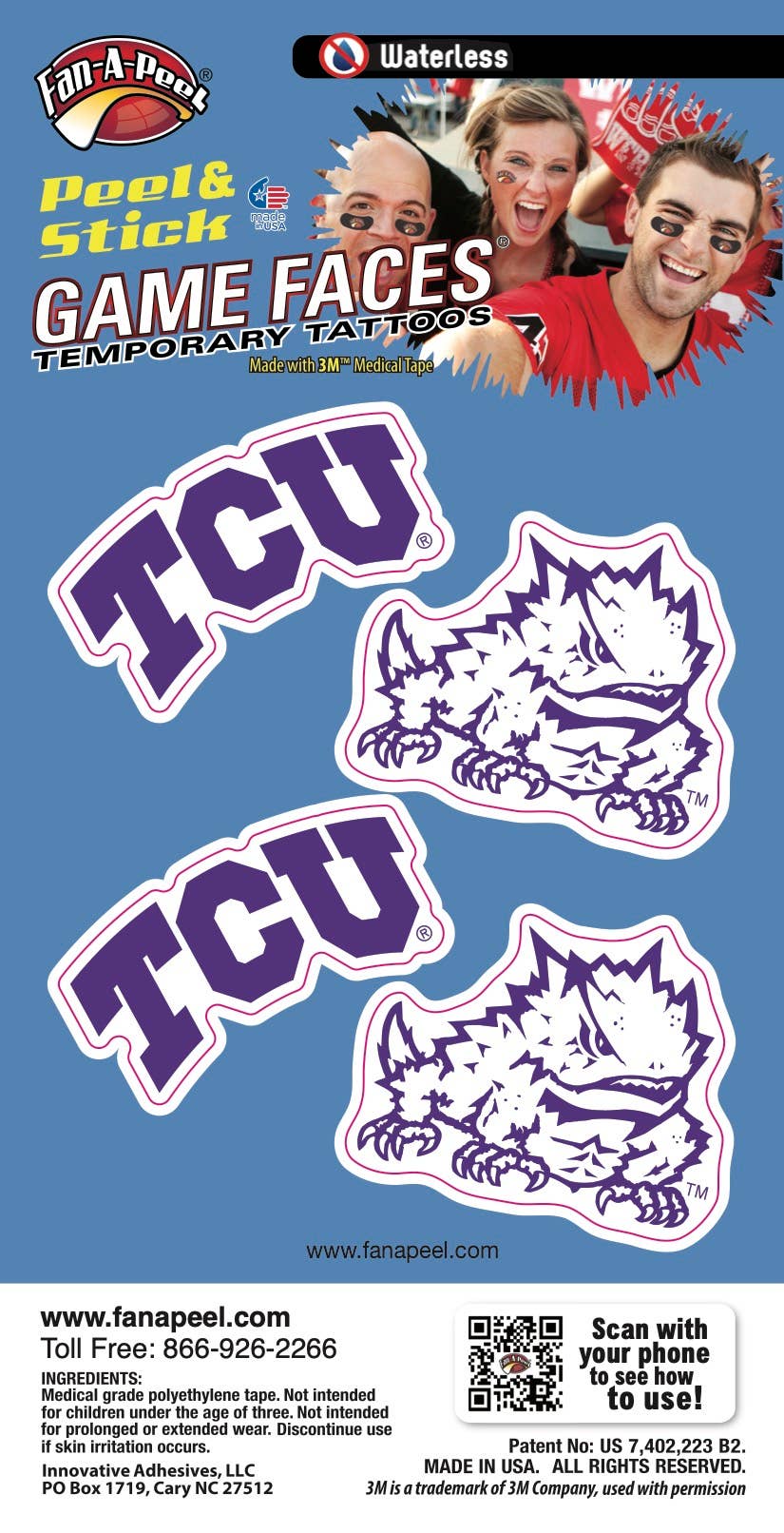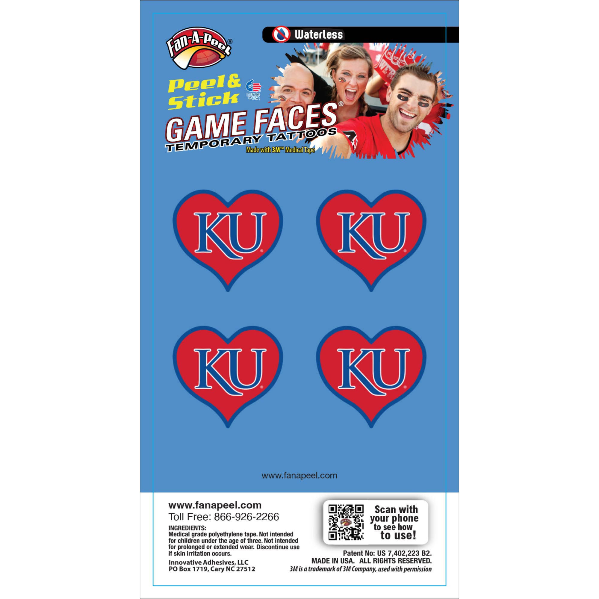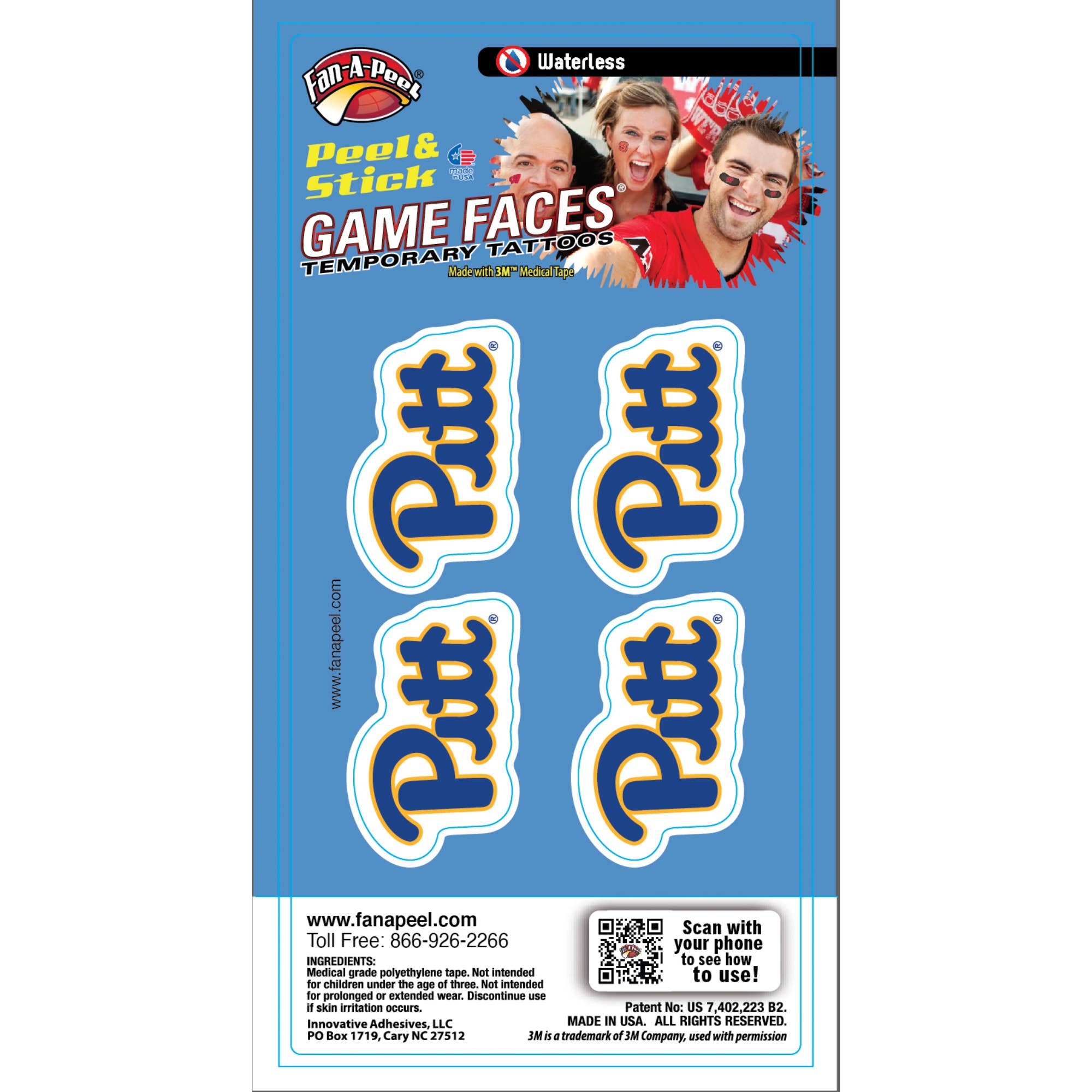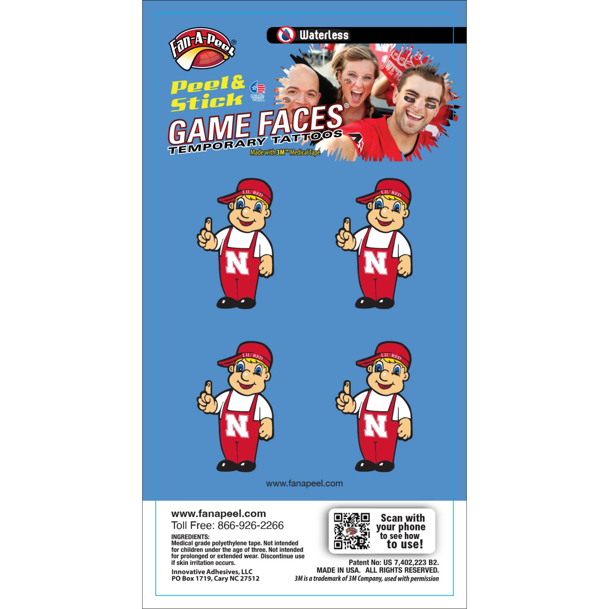Fan-A-Peel / Gamefaces have long been a staple in the sporting world. First introduced over 25 years ago as a water applied tattoo in collegiate sports has now evolved into a fashion statement for fans, cheerleaders and players. Our products have embraced the fashion trends as well as impulse buy and immediate use by introducing several years ago a tattoo that can be used without water and used on most any surface. As the inventor and patent holder for peel & stick temporary tattoos we have revolutionized the market and made it easier to anyone to wear and remove their "GameFace" at will. We utilize the safest 3M Medical adhesives in our products and have expanded our lines to include metallic and glitter. A game day doesn't go by without seeing our products on TV, print and in the stands. In addition to our mantra for safety and convenance we have embraced sustainability by only using recycled materials in our packaging. All we want is for you to have fun and "put your gameface on"!!