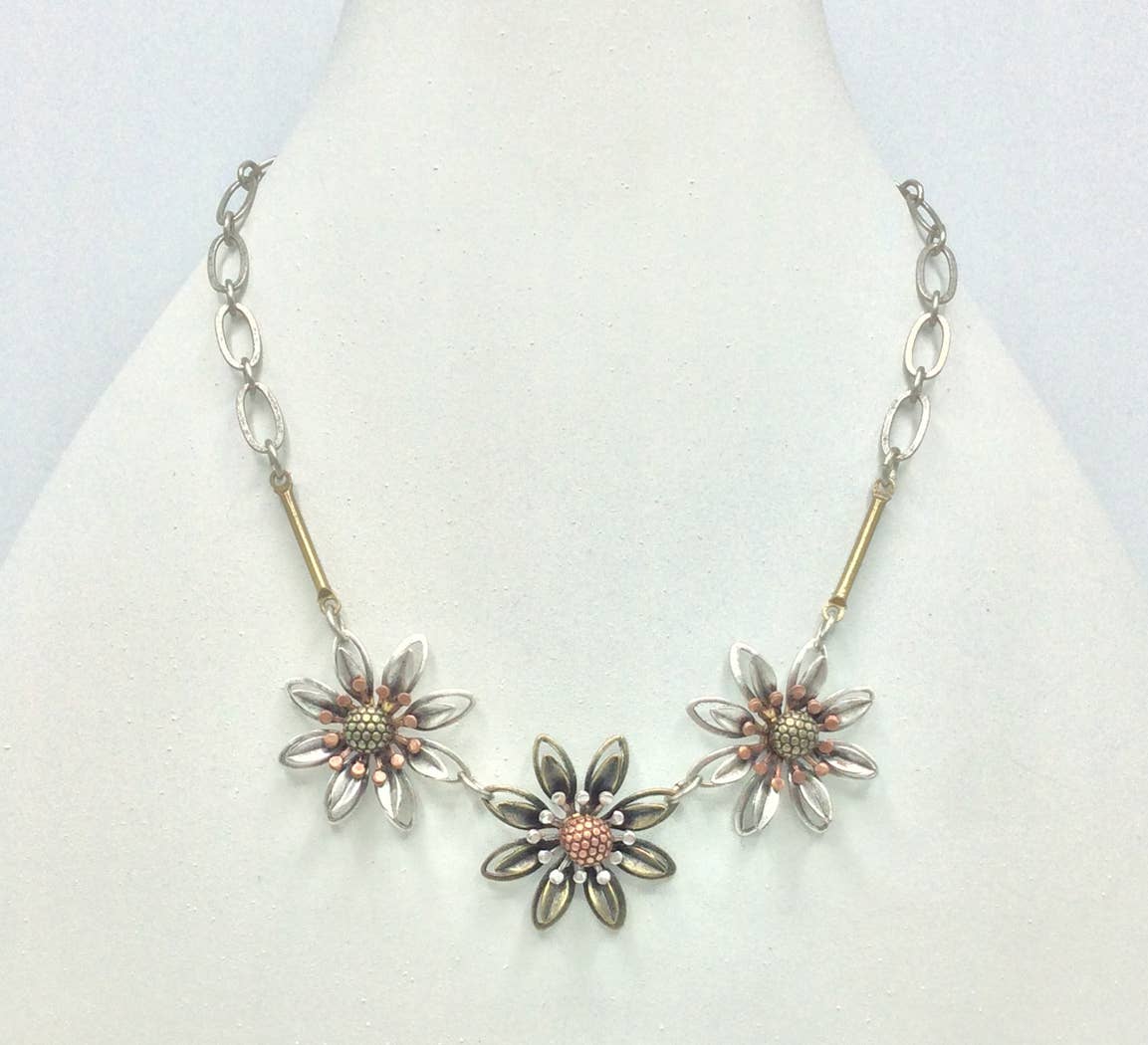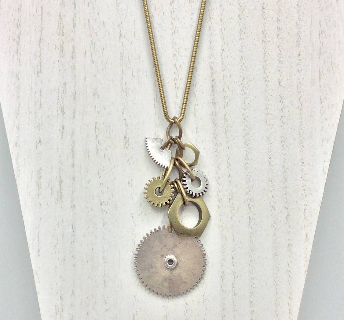 In 1978 I earned my BFA at Washington University in St. Louis, studying with the renowned metalsmith, Heikki Seppa. After spending four post college months working and nightclubbing in Berlin, I landed in NYC with a suitcase and $15. I immersed myself in the downtown art and music scene, doing artwork for DIY fanzines, hanging out at punk clubs, and playing bass in an all female band. Not having the funds to set myself up with a precious metals studio, I started experimenting with unconventional materials in jewelry application. I developed a collection of jewelry made of heat formed neon colored Lucite, origami folded semi-rigid vinyl, and collage pins featuring the kind of clip art I used in my fanzine work. I sold them under my own name to stores like Patricia Field and Fiorucci in NYC, and trendy boutiques in London, Amsterdam and Berlin. In 1980 I did my first wholesale trade show and began to expand my customer base. In 1984, I reorganized under the name ALCHEMY with the idea that these objects made of non-precious materials can be transformed in the hands of an artist into something to be treasured. ALCHEMY’s current collection is created with castings taken from industrial artifacts such as gears, antique keys, machine parts, as well as castings carved in wax then molded and cast in pewter. I also use found objects such as test tube stoppers, pen parts, rubber o-rings, vintage ephemera, along with hand formed polymer clay, wood, hardware, vintage stampings and chains.