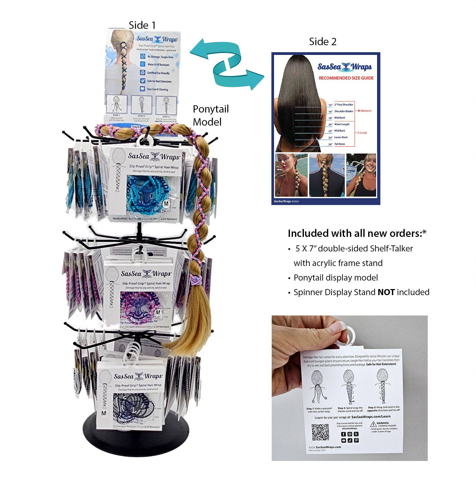 The Spiral Hair Tie Built for Bold, Active Customers. SasSea Wraps® were born from a hair disaster and transformed into a breakthrough. After a scuba dive left our founder with hair so tangled it had to be cut off, she set out to design a better solution. The result? A patent-pending spiral hair tie engineered to stay put during the wildest adventures—without damaging hair. These aren’t your average hair ties. SasSea Wraps® flex with movement, reduce breakage, and offer a strong, gentle hold for all hair types—even in water, heat, and humidity. They’re the go-to choice for active women, beauty lovers, moms, athletes, and anyone tired of hair ties that pull, snap, or sag. Stylish, durable, and built for real life, SasSea Wraps® are a smart, high-margin add-on for salons, spas, fitness studios, boutiques, and gift shops. With fashion-forward color collections and a growing fanbase, they’re a proven impulse buy that customers come back for—again and again. Trend-forward. Performance-backed. Purpose-built. SasSea Wraps® hit the sweet spot between beauty and utility, with growing buzz among influencers To help you set up a beautiful and effective display, your first order includes FREE: – 5x7" Acrylic Shelf Talkers with instructions, a sizing chart, and product-in-use photos – Lifelike Ponytail Display Model for hands-on interaction—studies show tactile displays can boost sales by 30%+ Stock the spiral that’s making waves. Order now on and bring SasSea Wraps® to your shelves!