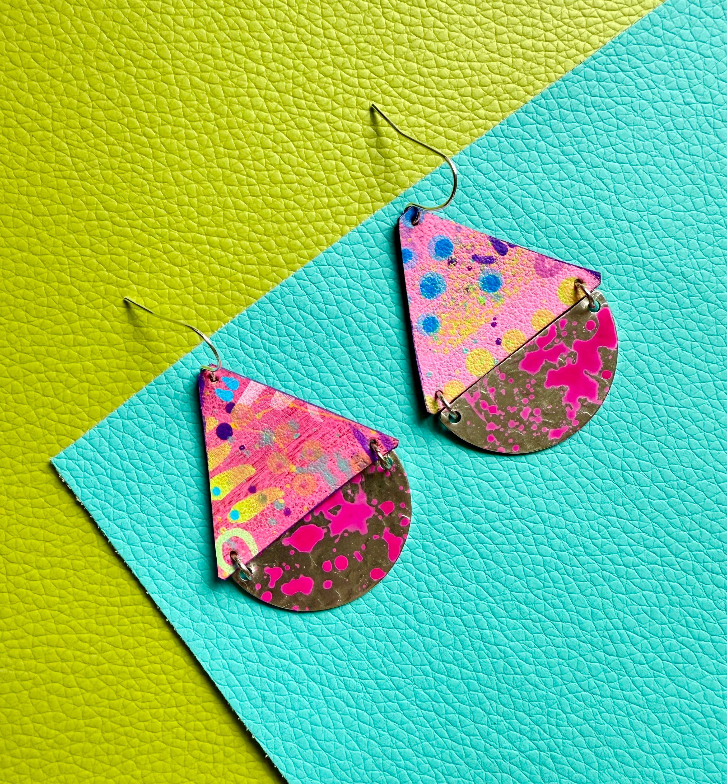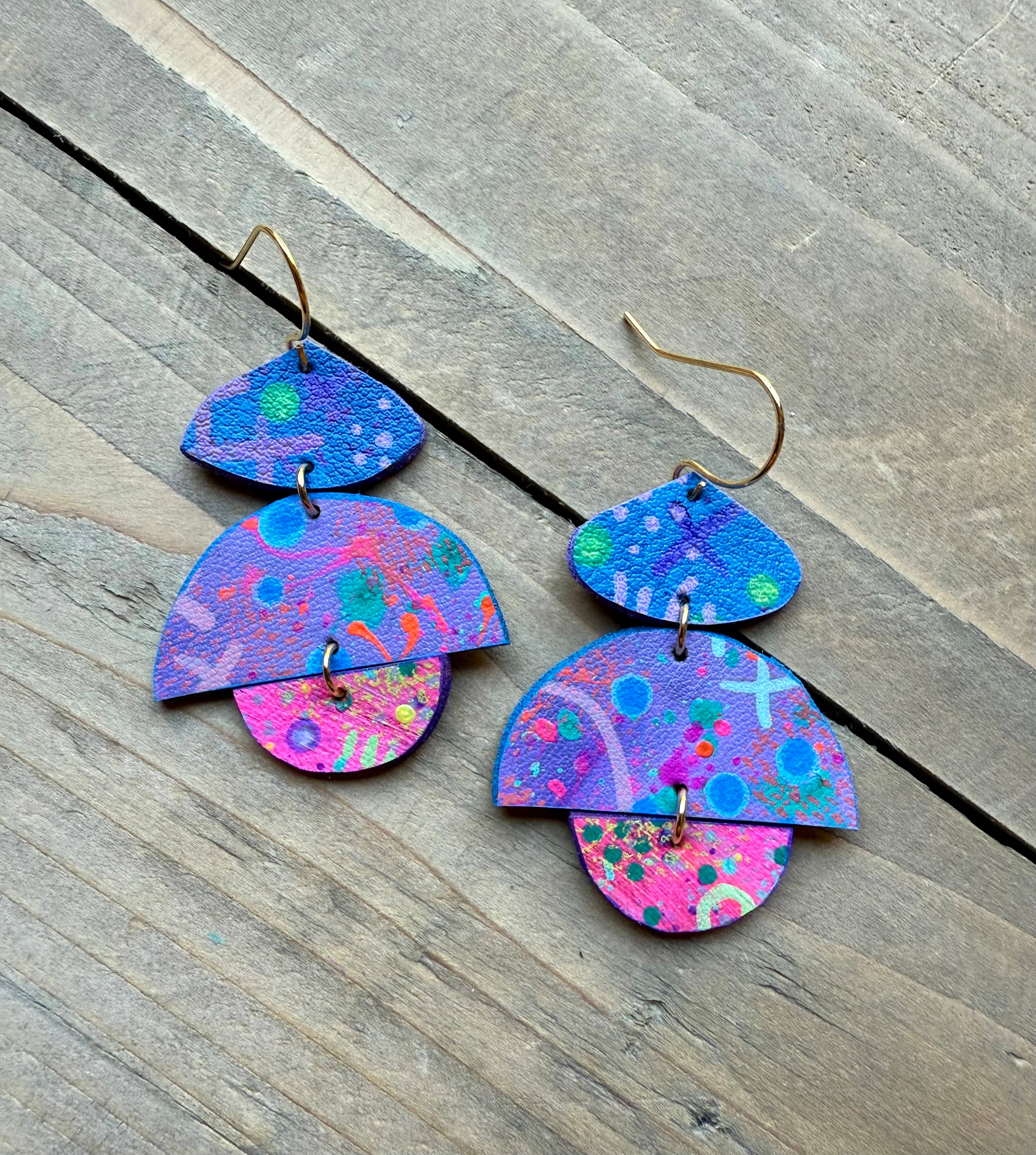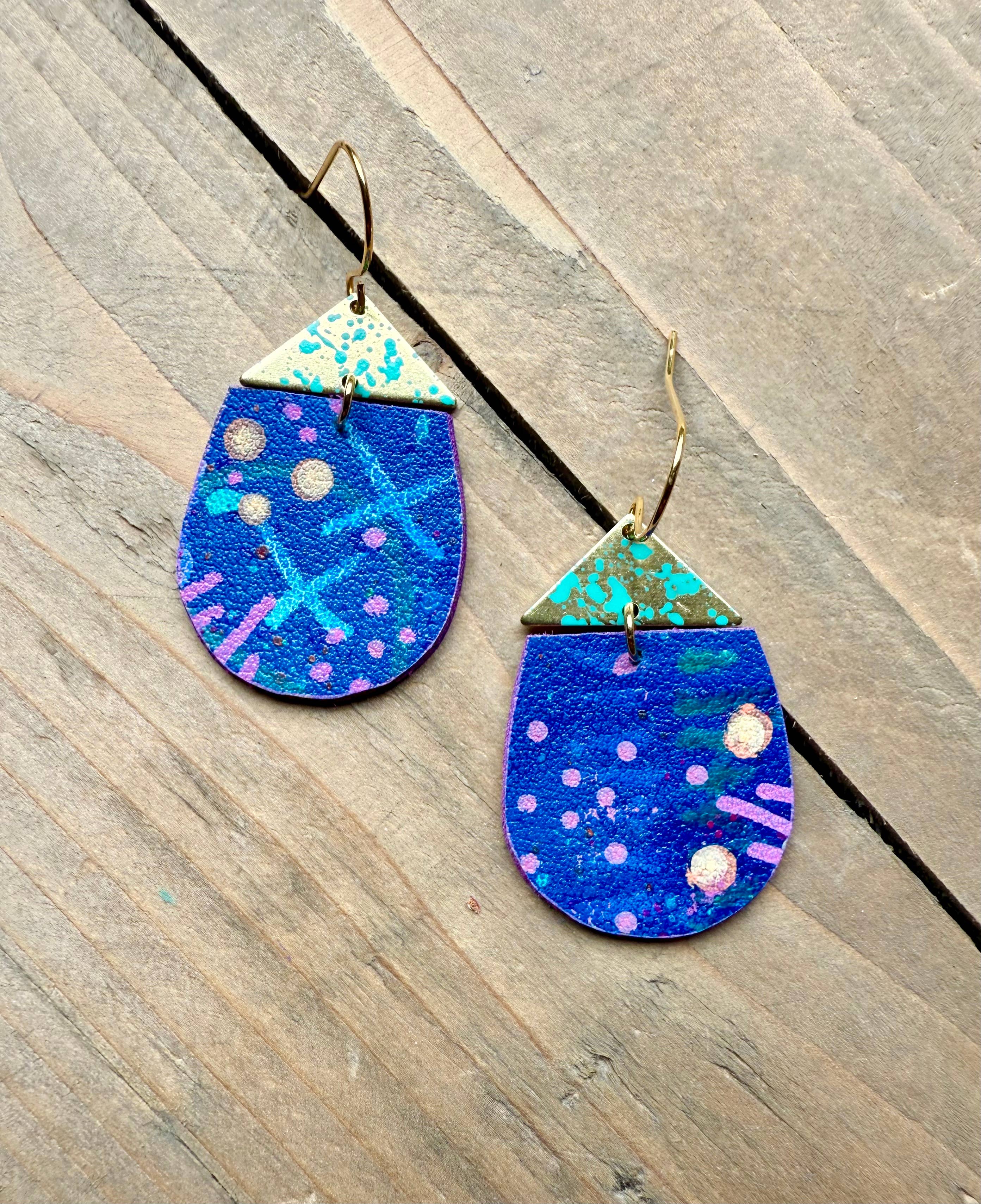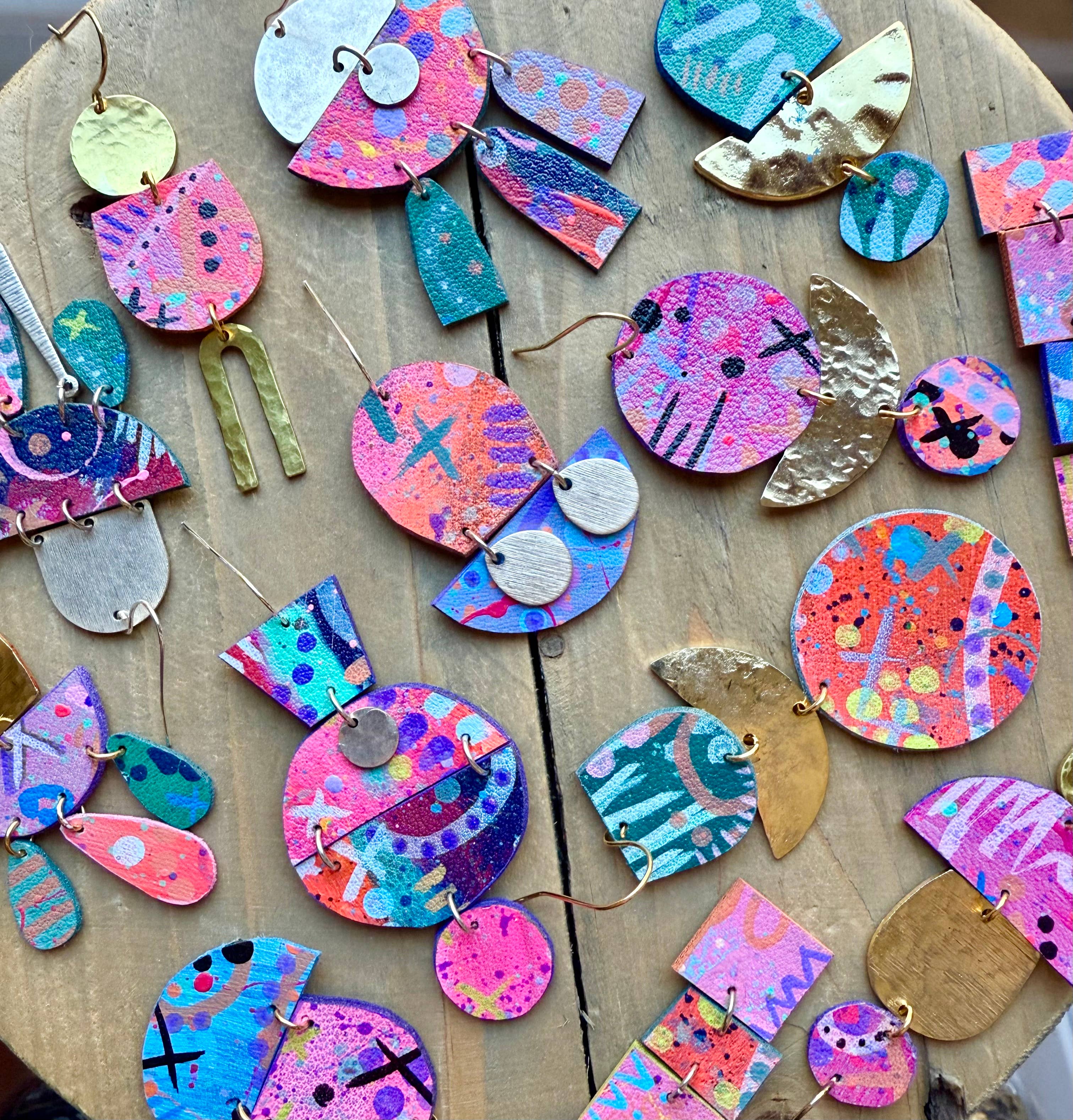 About enika jewelry: All pieces are truly one-of-a-kind, hand painted wearable art. Consisting of a mix of brass, copper, wood and vegan leather.