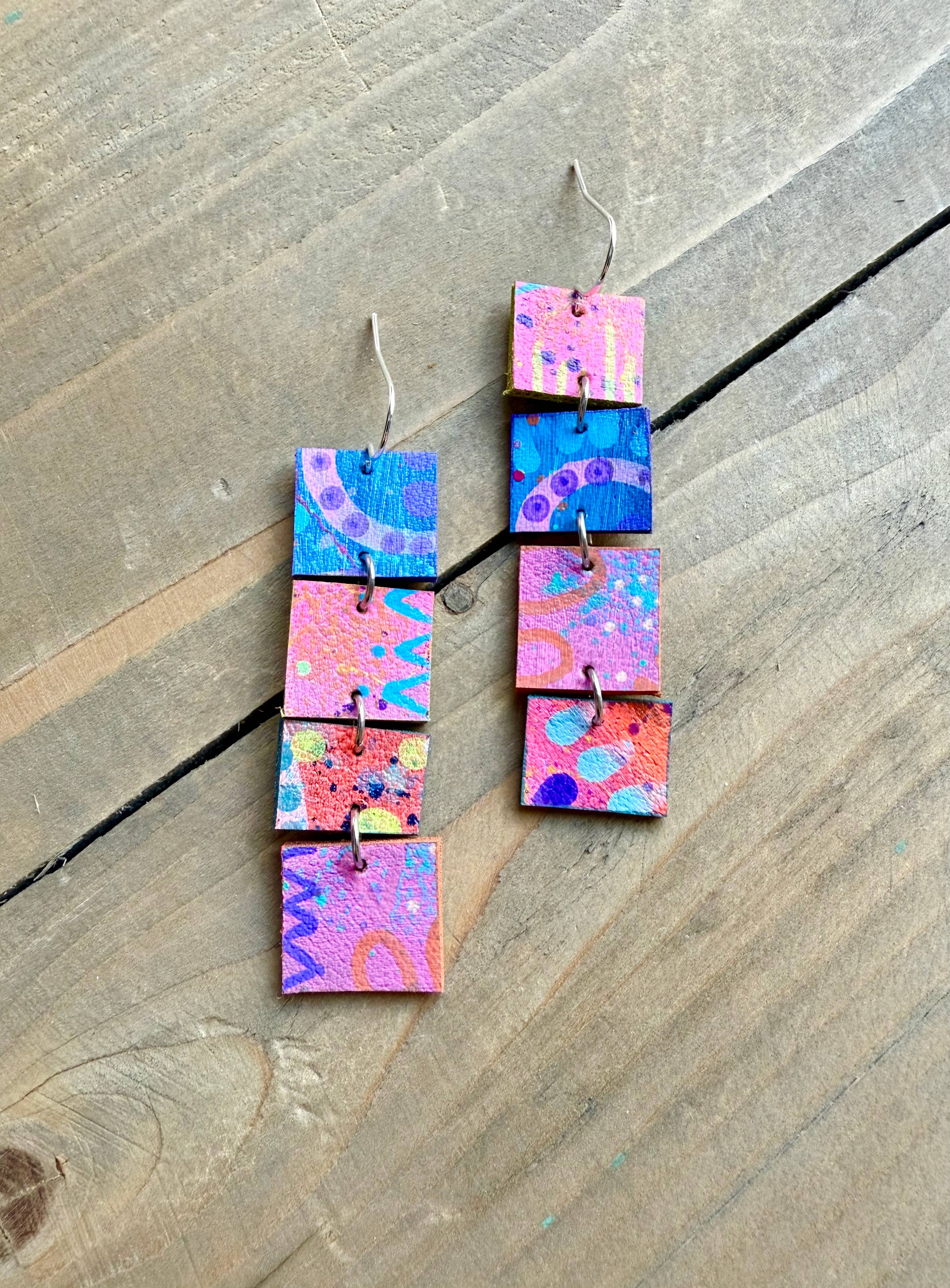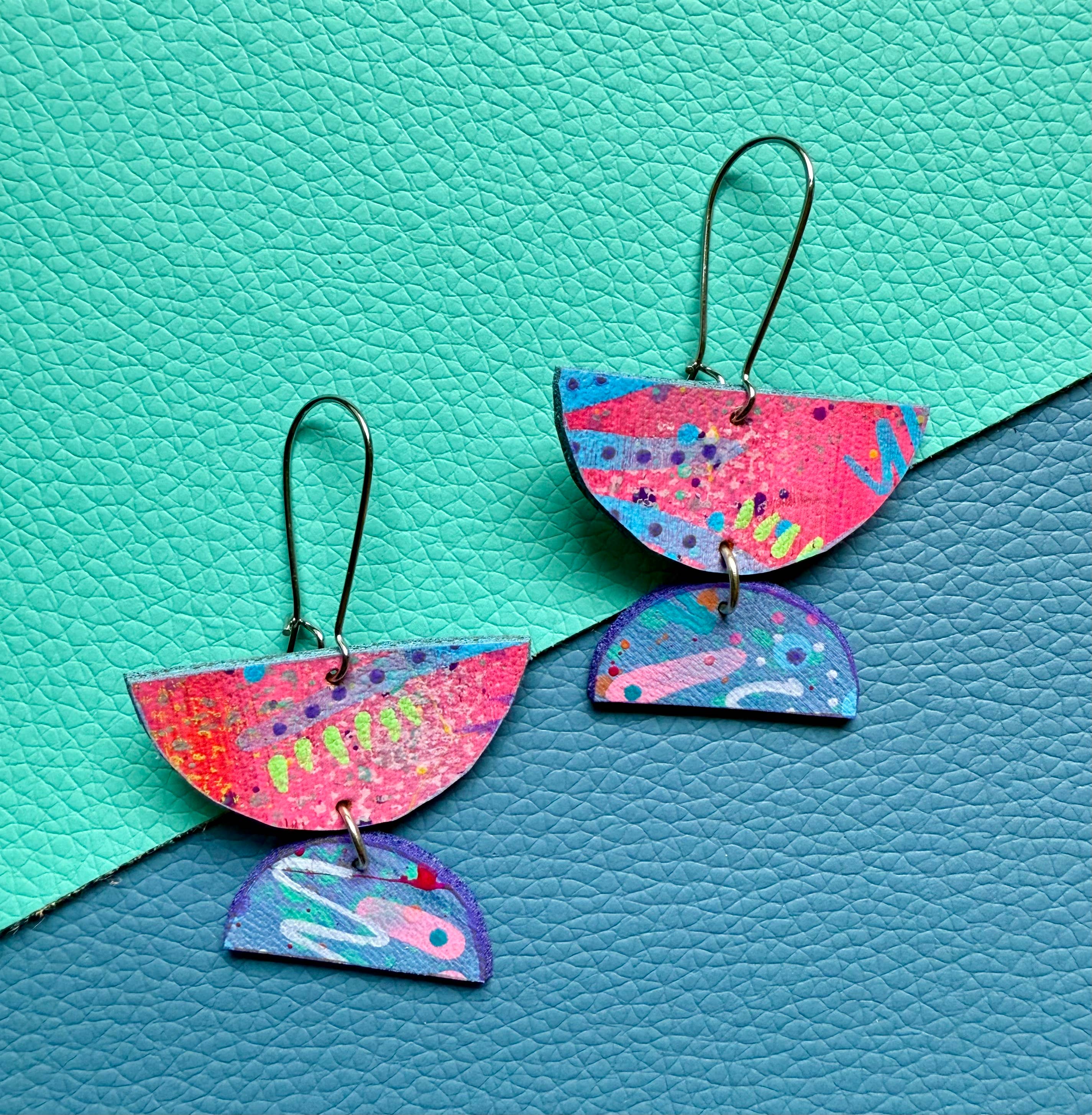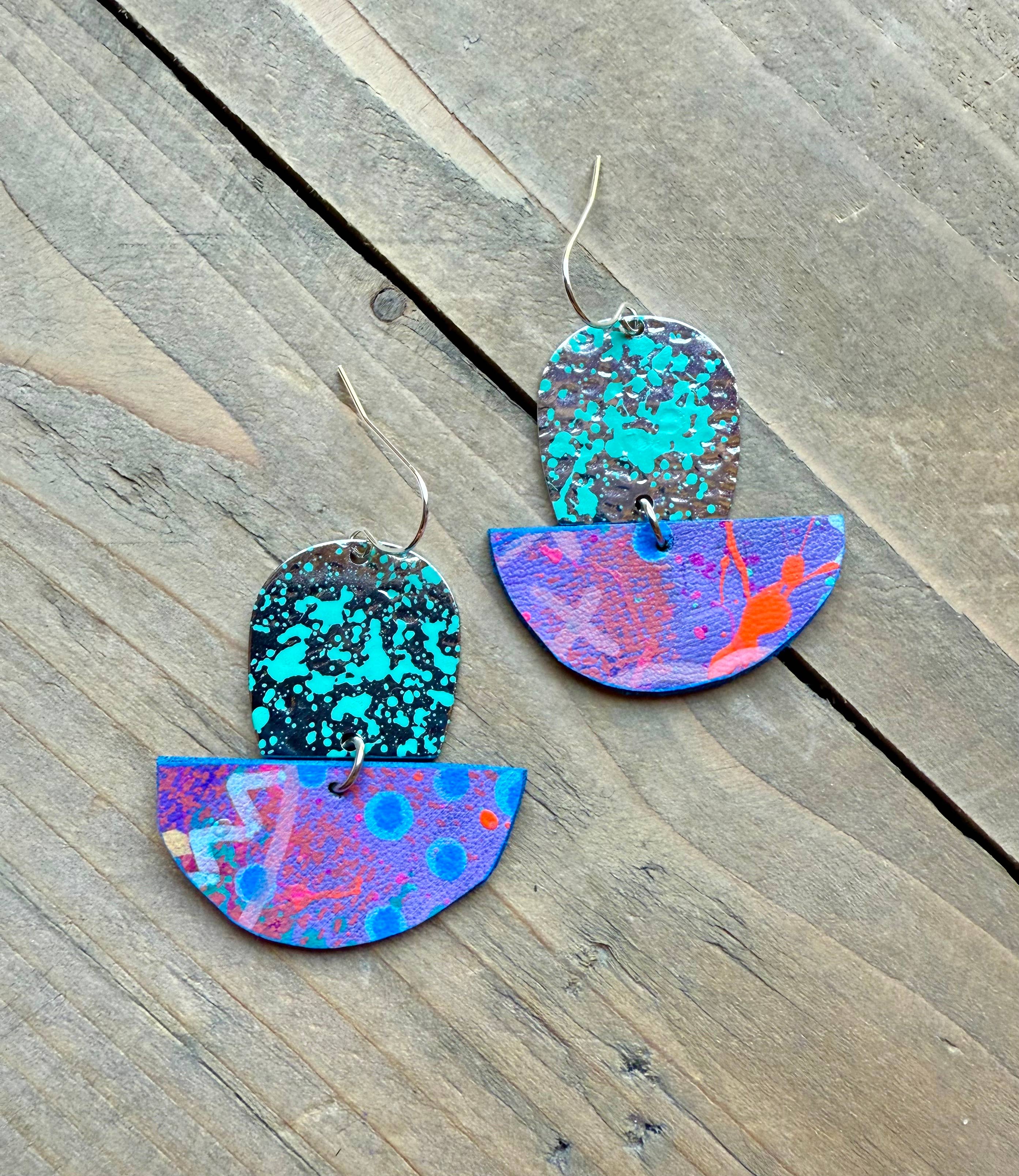 About enika jewelry: All pieces are truly one-of-a-kind, hand painted wearable art. Consisting of a mix of brass, copper, wood and vegan leather.