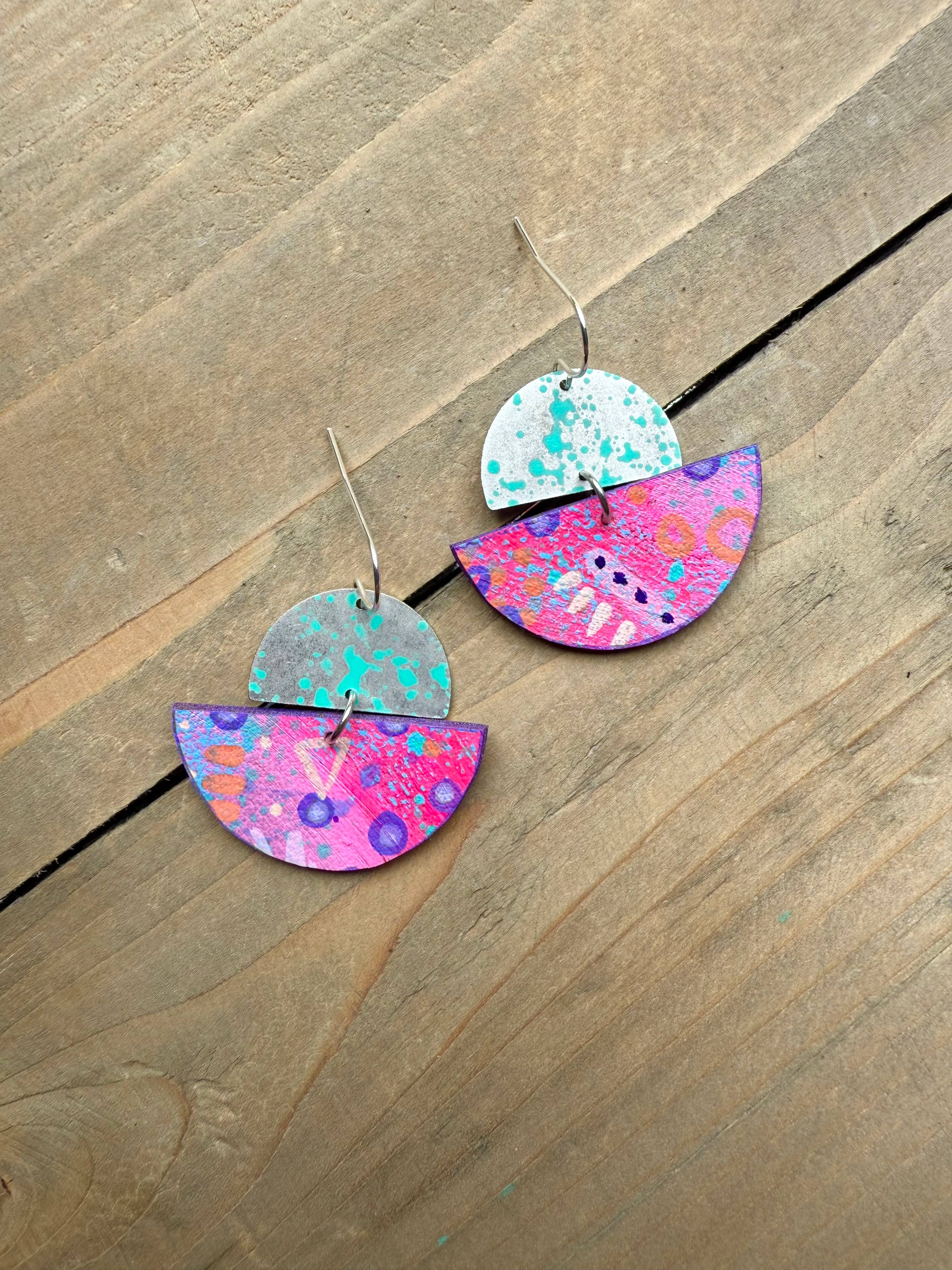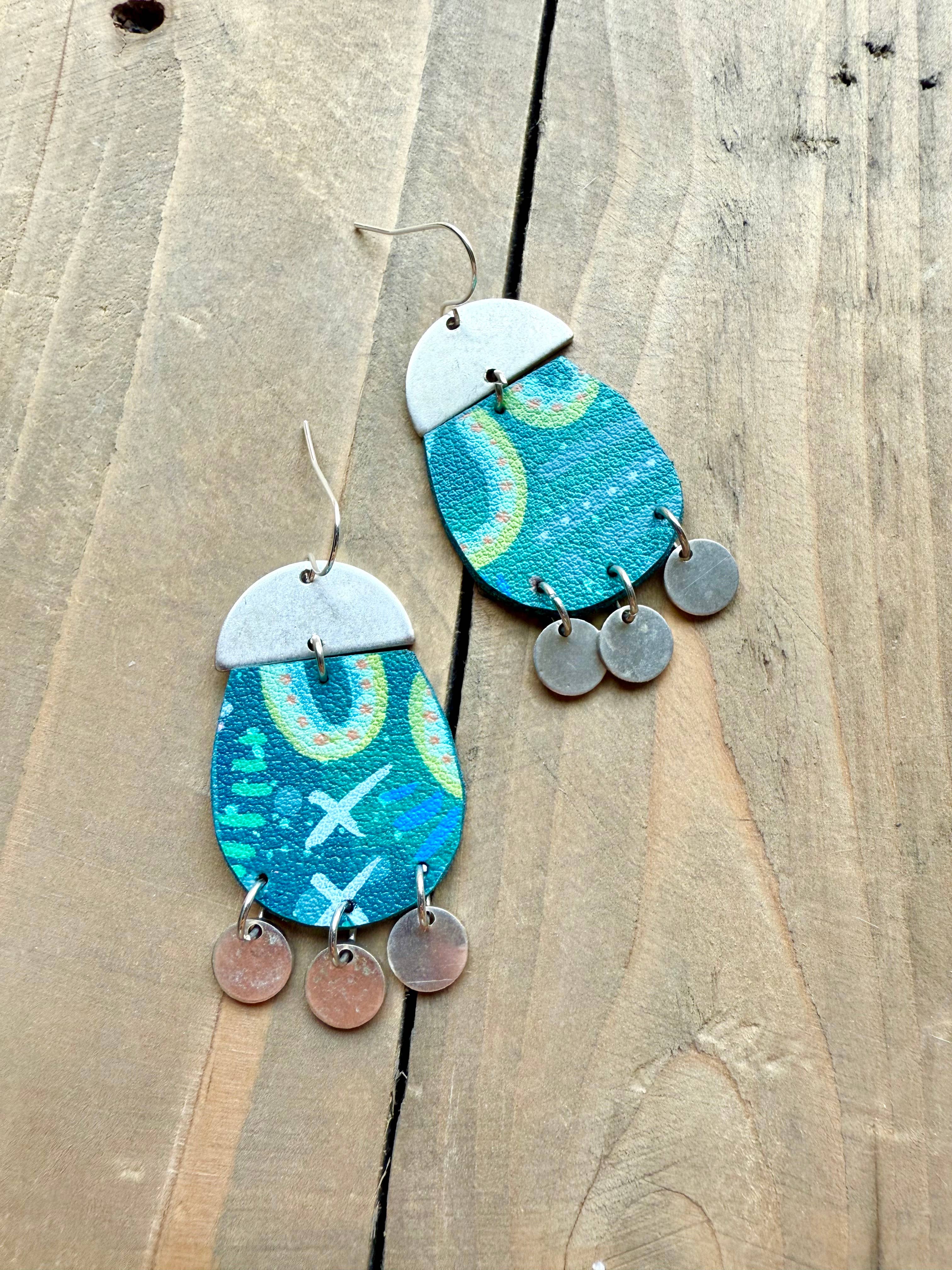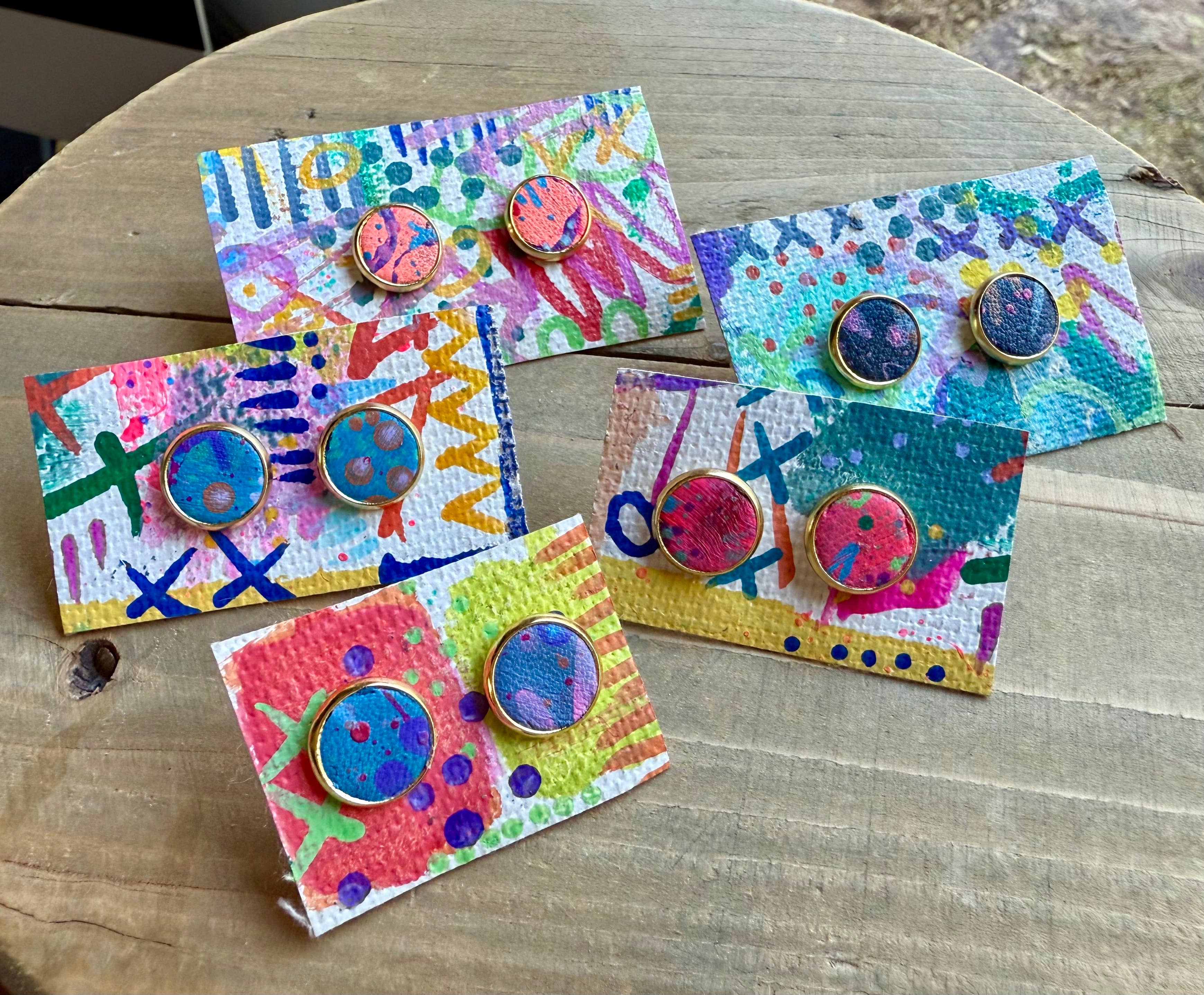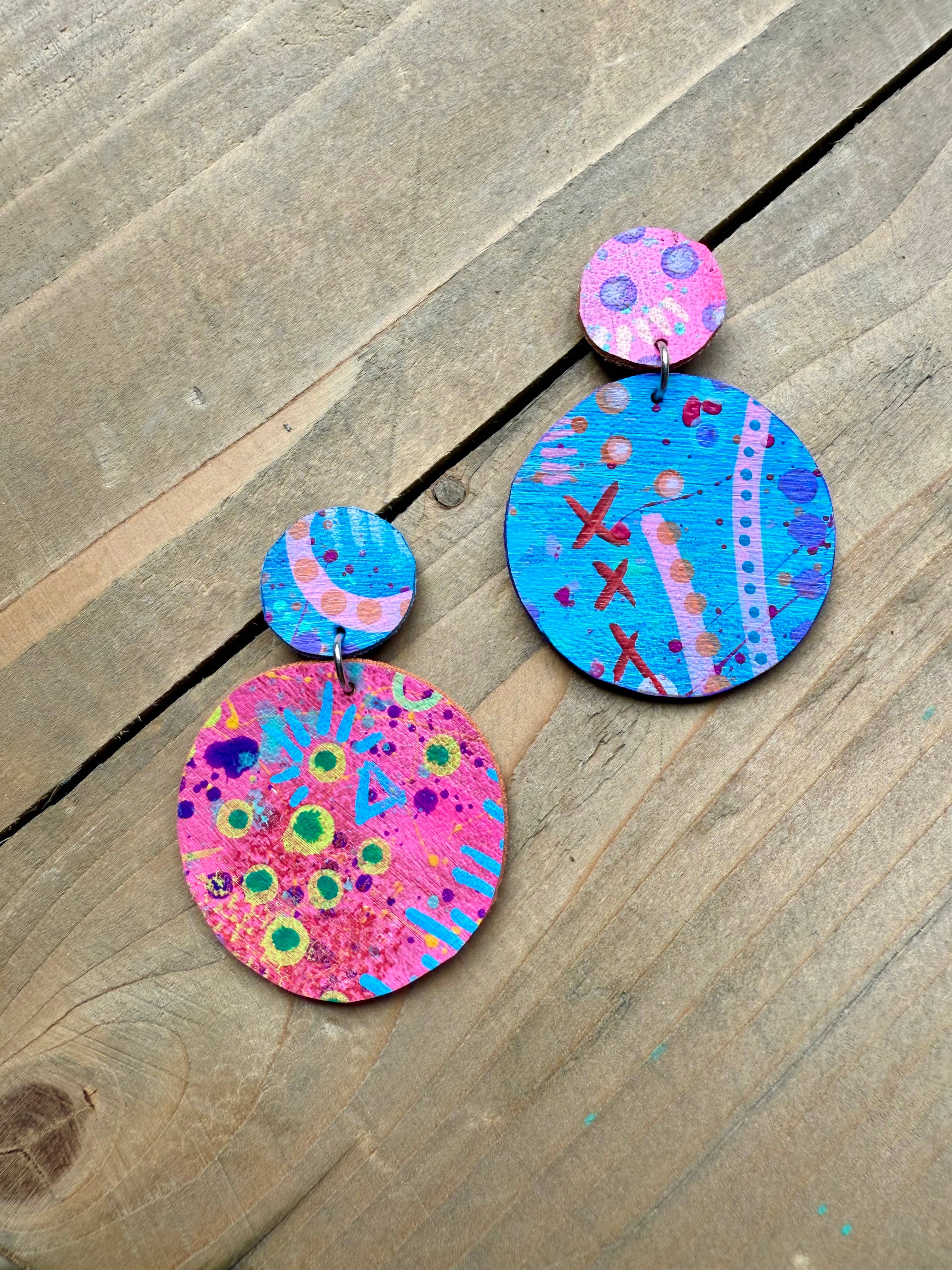 About enika jewelry: All pieces are truly one-of-a-kind, hand painted wearable art. Consisting of a mix of brass, copper, wood and vegan leather.