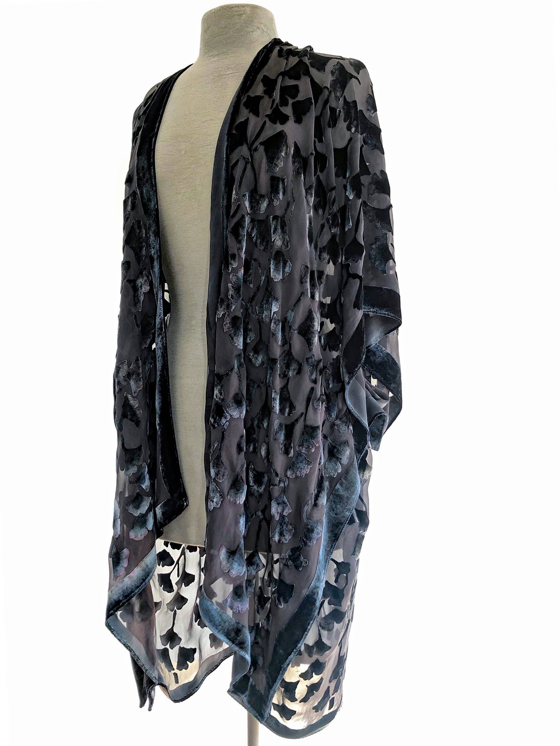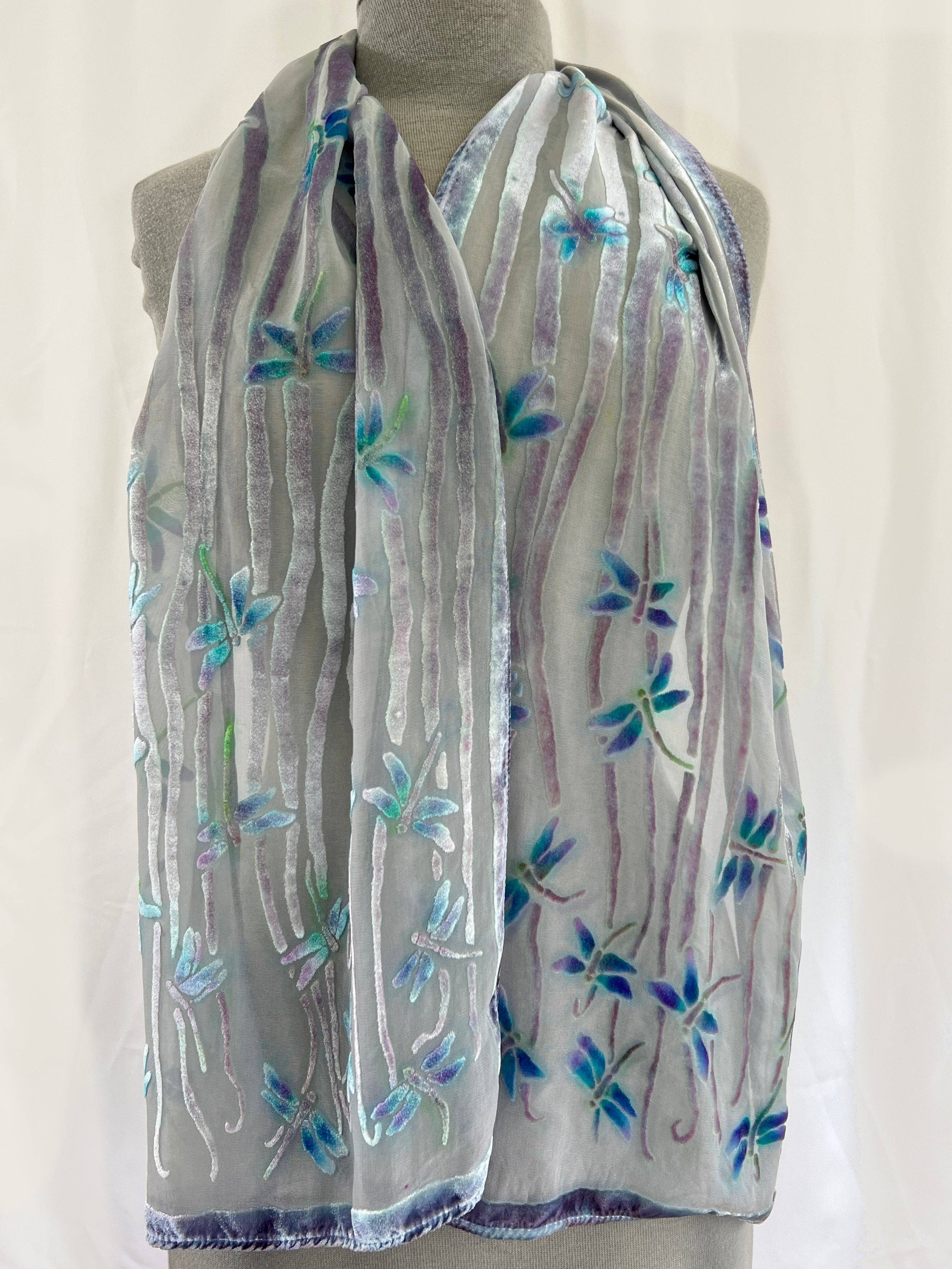 Sherit Levin creates hand-painted burnout patterns in luxurious silk-velvet. Scarves wraps and other accessories shimmer with vivid colors. The devoré designs are inspired by peaceful scenes found in nature. She dyes and colors the fabric with permanent dyes that are washable. Each piece starts as solid white velvet in her studio and is a one-of-a-kind. A single scarf is described as "a poem resting on your shoulders".