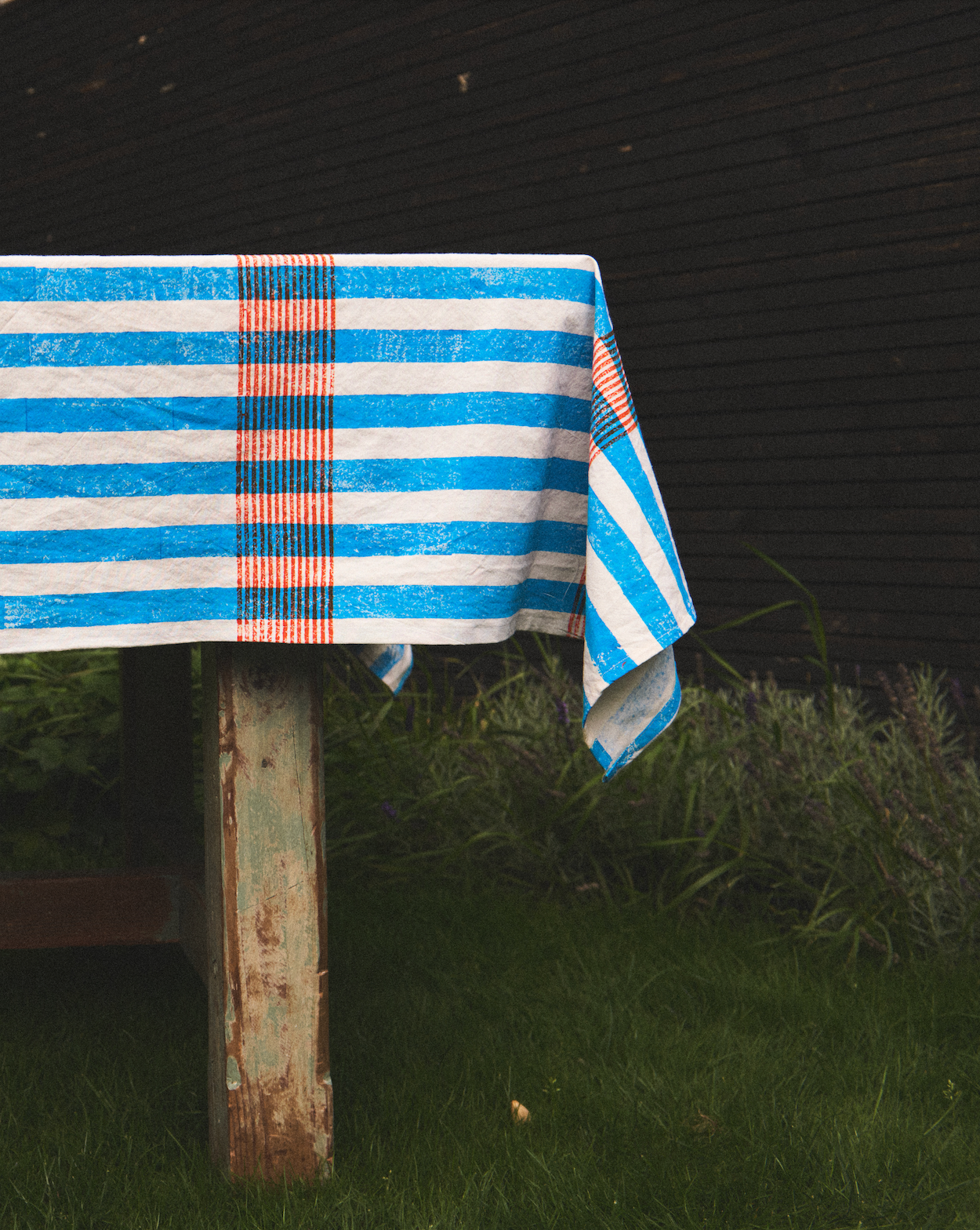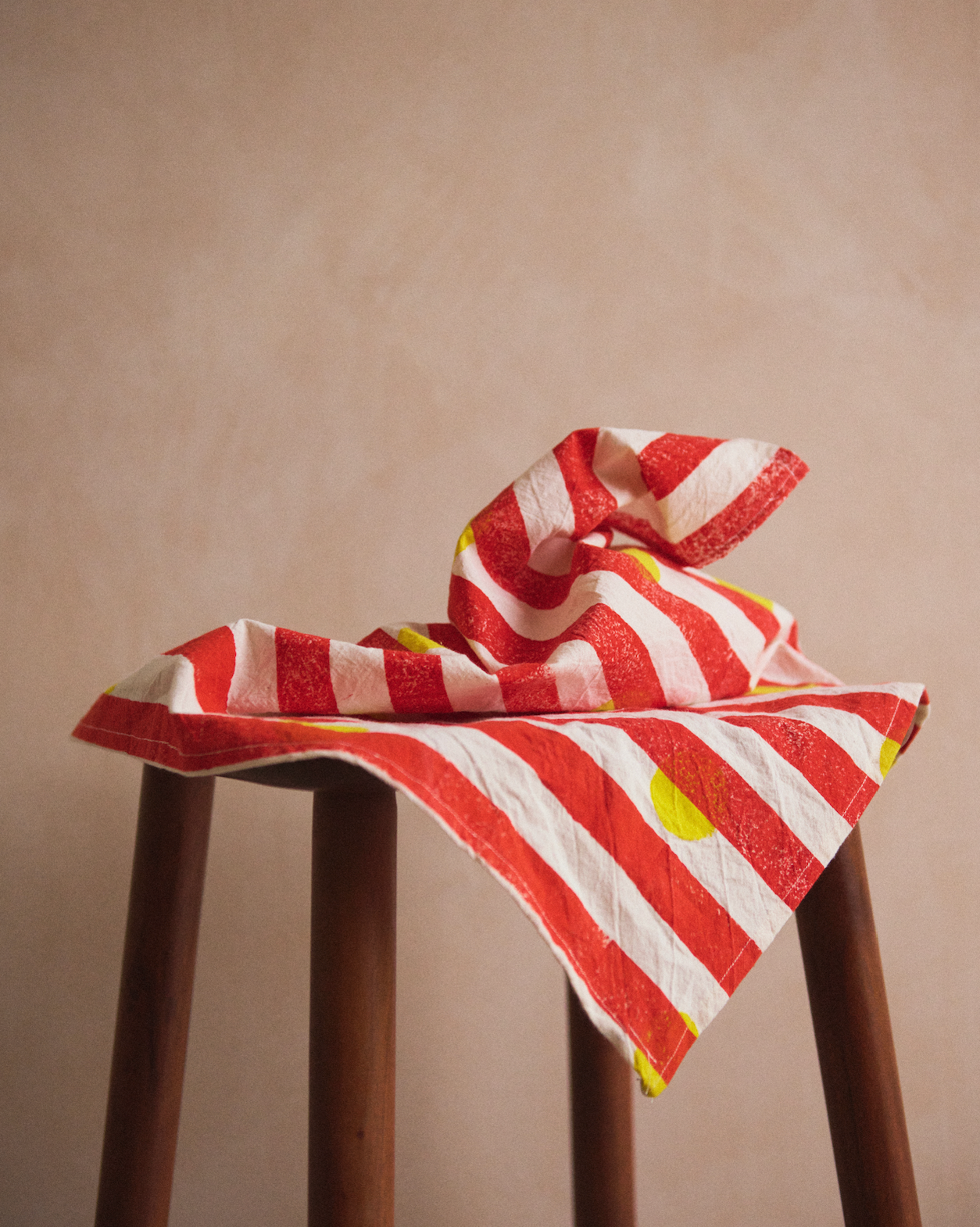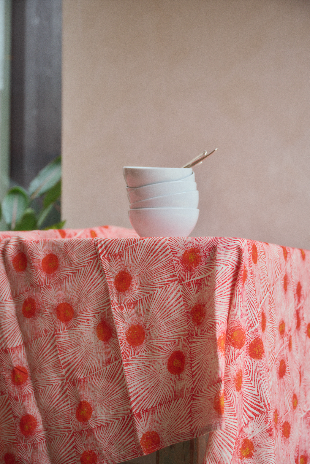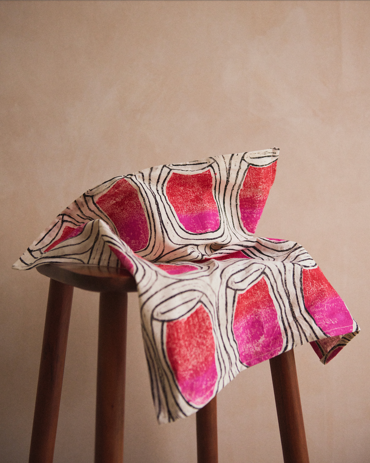 My childhood was split between schooling in London and traveling to the US for holidays. A cunning way my parents could spend time with their kids during the holidays but also work (as PR in the tech industry.)My memories of this time is watching movies on airplanes, cartwheeling into motel pools, eating Bugles in the back of hire cars and massive plates of food (mainly pancakes). These long road trips to the sound of country music left me with powerful visuals of family holidays and America in the 80’s and 90’s. Visuals that influence all my creative work today. In my 20’s I became a makeup artist in the fashion industry until my journey took an unexpected turn when I discovered a passion for block printed textiles and simultaneously inherited a 70-year-old sewing machine after the passing of my mother. Having always been captivated by the transformative power of colours and textures, I embraced this exciting transition, now combining my expertise in colours and past aesthetics with the art of block printing, allowing me to design and produce mesmerising textile creations.