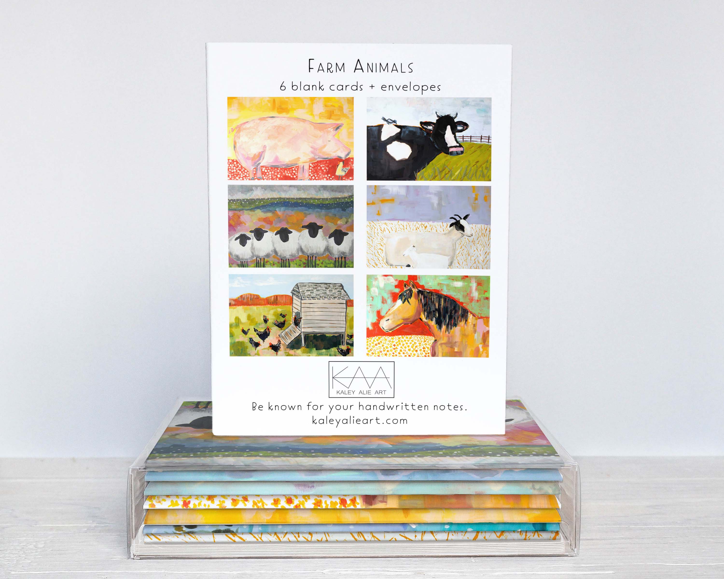 Hello! I am Kaley, the acrylic artist behind the canvas creating cheerful, bright, happy art. In 2018, I launched my creative endeavor in Colorado and began a small greeting card line. With my combined love for painting and stationery, my company has grown to now include over 200 card designs, plus yearly calendars. I am a strong believer in art that will make you smile and the power of a handwritten note. The cards are printed in small batches in the USA on FSC certified paper and are sealed in a plant-based sleeve that is compostable (option to omit sleeves) .All cards are blank inside, making them perfect for every occasion. Kaley Alie Art is a member of 1% For The Planet and is committed to donating 1% of annual revenue to the places and wildlife that inspire the art.