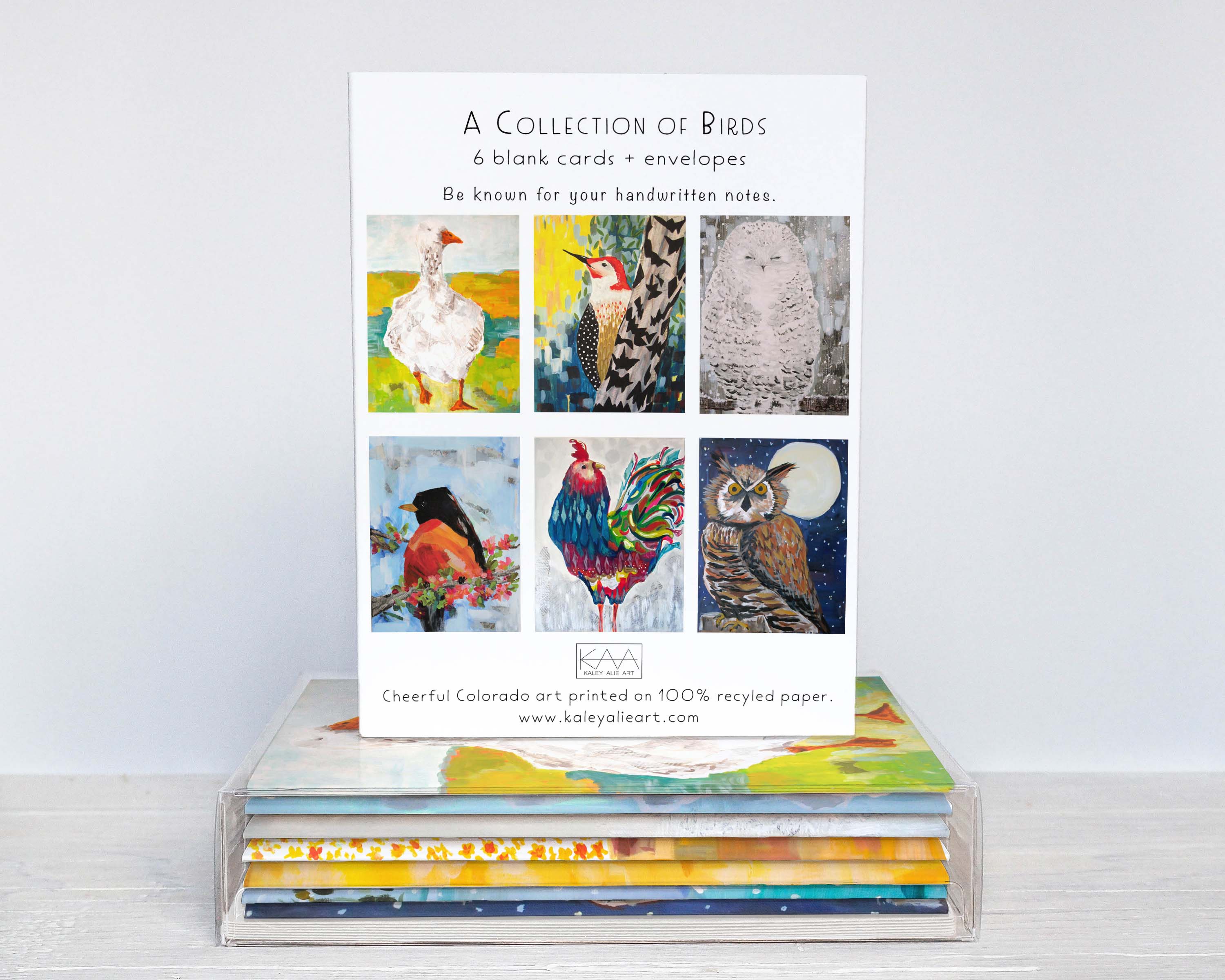 Hello! I am Kaley, the acrylic artist behind the canvas creating cheerful, bright, happy art. In 2018, I launched my creative endeavor in Colorado and began a small greeting card line. With my combined love for painting and stationery, my company has grown to now include over 200 card designs, plus yearly calendars. I am a strong believer in art that will make you smile and the power of a handwritten note. The cards are printed in small batches in the USA on FSC certified paper and are sealed in a plant-based sleeve that is compostable (option to omit sleeves) .All cards are blank inside, making them perfect for every occasion. Kaley Alie Art is a member of 1% For The Planet and is committed to donating 1% of annual revenue to the places and wildlife that inspire the art.