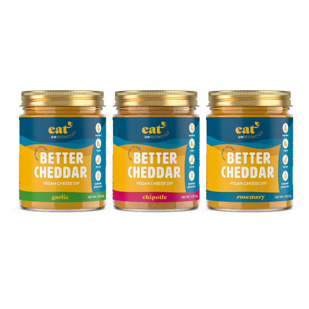 My family history of cancer inspired me to start a vegan food brand serving up cheesy sauces that are free from dairy (and nuts). Eat UNrestricted’s line of “cheese” dips/sauces is made with a blend of carrots potatoes, and is free from preservatives and artificial colors. All flavors (currently three: Original, Garlic, Chipotle) are naturally soy and gluten free, and unlike other plant-based cheeses on the market, nut/cashew free!