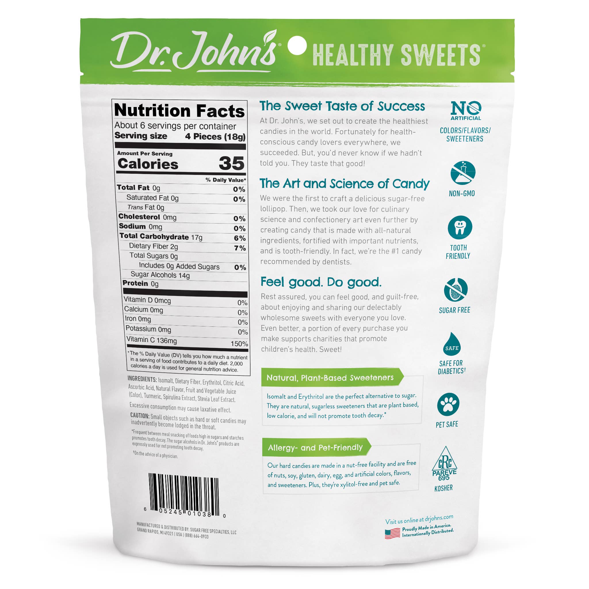 Dr. John's candy was founded in 1995 by a dentist out of his home in Grand Rapids Michigan with the goal of providing his dental office patients with a sugar free treat, that tasted good, and that would actually help to prevent cavities when consumed. His patients loved the products and shared his products with neighbors and friends to the point that in 2013 Dr. John’s purchased a small factory to produce his products in volume and at that point he began selling his sugar free products via the internet. Mike and Patty McDonald’s investment group purchased the company in November of 2017. By June of 2018 they received their trademark on Dr. John’s Healthy Sweets, which is the first candy produced in America that carries the word “Healthy” in the brand name. Dr. John’s Healthy Sweets contain many key attributes that allowed us to receive the trademark approval. In October of 2021 Dr. John's received the 2021 Presidential "E" Award from the U.S Department of Commerce for Export Service to 10+ countries, for our sustained commitment to growth internationally.
