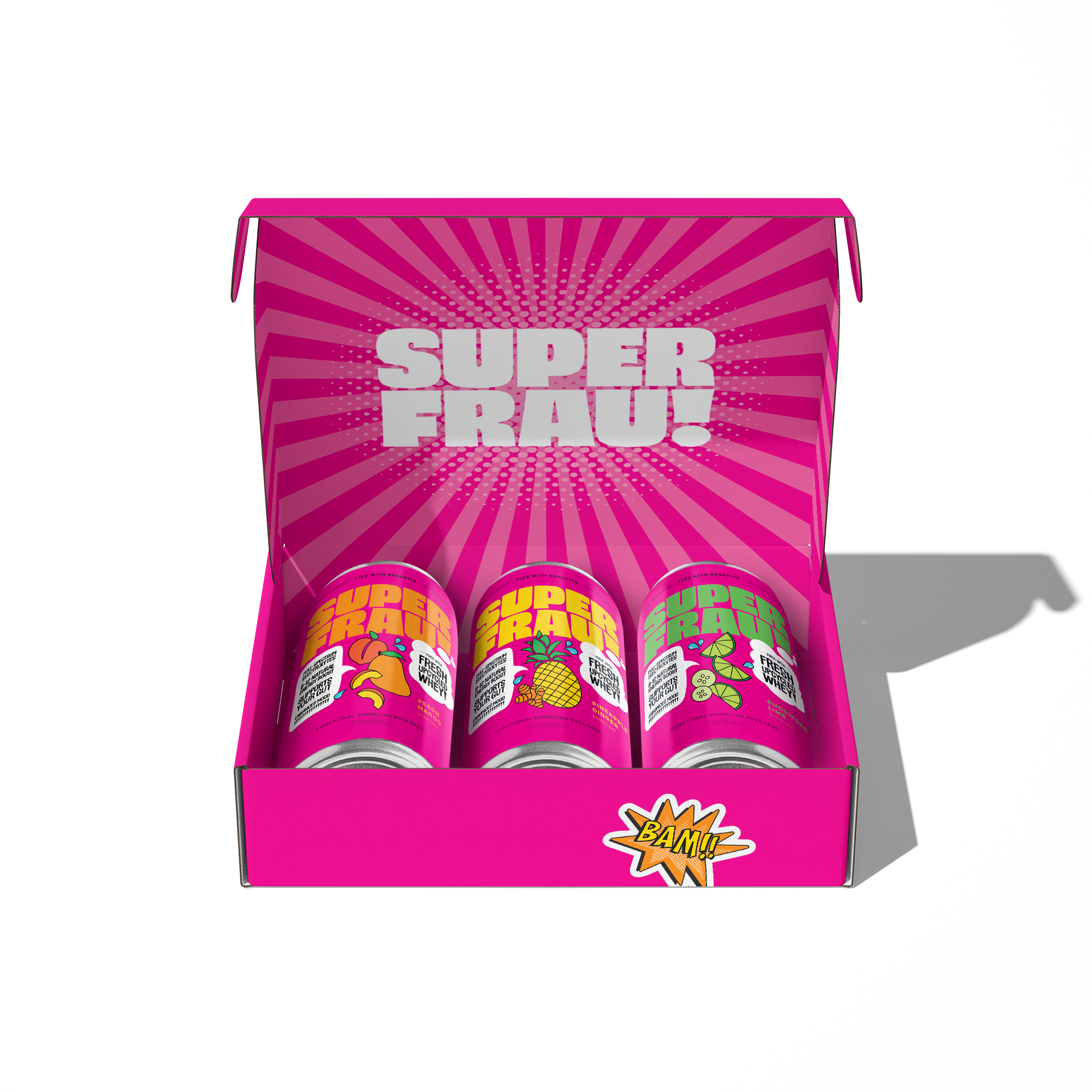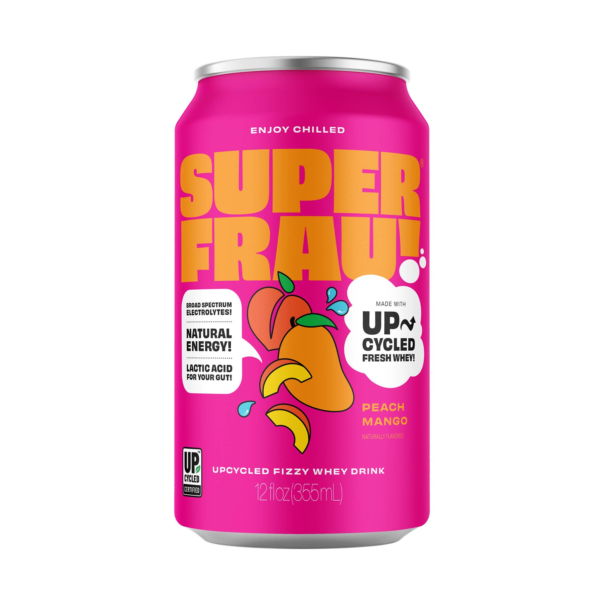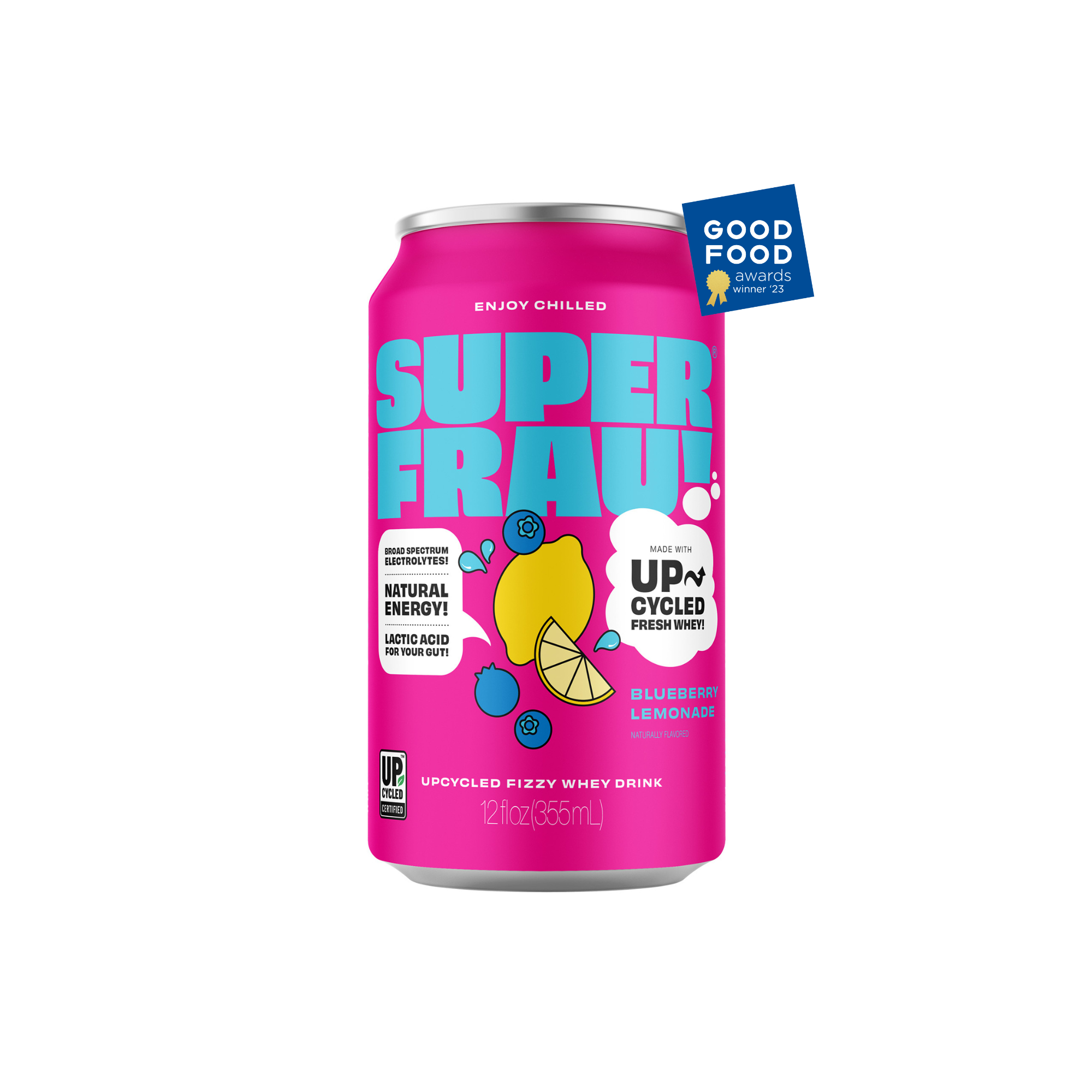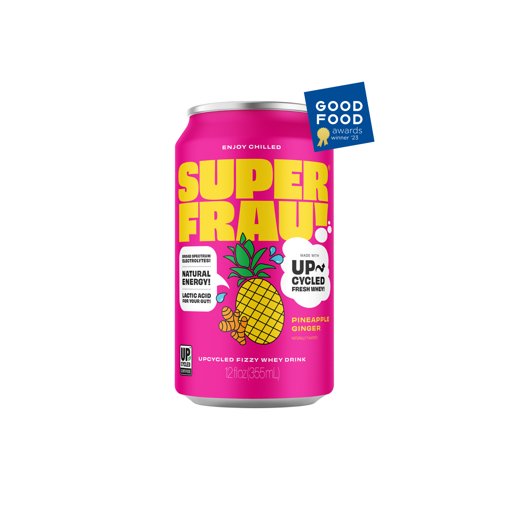 Superfrau is an award-winning fizzy functional drink made with fresh upcycled whey. It tastes amazing, is loaded with health benefits and helps save our planet. Fresh whey is the nutrient-packed liquid strained during yogurt and cheese fermentation that often goes to waste. During the fermentation process, about 67-90% of the milk becomes liquid whey, naturally packed with a broad spectrum of electrolytes, B-vitamins, and gut-beneficial acids. Our super mission is to divert this nutritious and delicious whey from ending up in landfills, by repurposing it into super vitamin-rich drinks for us to enjoy! By upcycling liquid whey, Superfrau doubles the productivity of a quart of milk. I created Superfrau to help every person be a super drink hero, for their own health and the health of our planet. You’ve never tasted anything like this. It's refreshingly sweet and tart, without any added sugar or sweeteners. Our Pineapple Ginger, Blueberry Lemonade, and Cucumber Lime flavors were all recognized by the Good Food Foundation in blind taste testing of over 2000 products. Nearly 40% of food in the U.S. is never eaten, creating climate-wrecking greenhouse gas emissions. Superfrau aims to empower consumers to fight food waste and climate change with each refreshing sip of its sparkling fresh whey beverages. With our Upcycled Certification. Superfrau is committed to a transparent and sustainable supply chain so you can feel good inside and out!