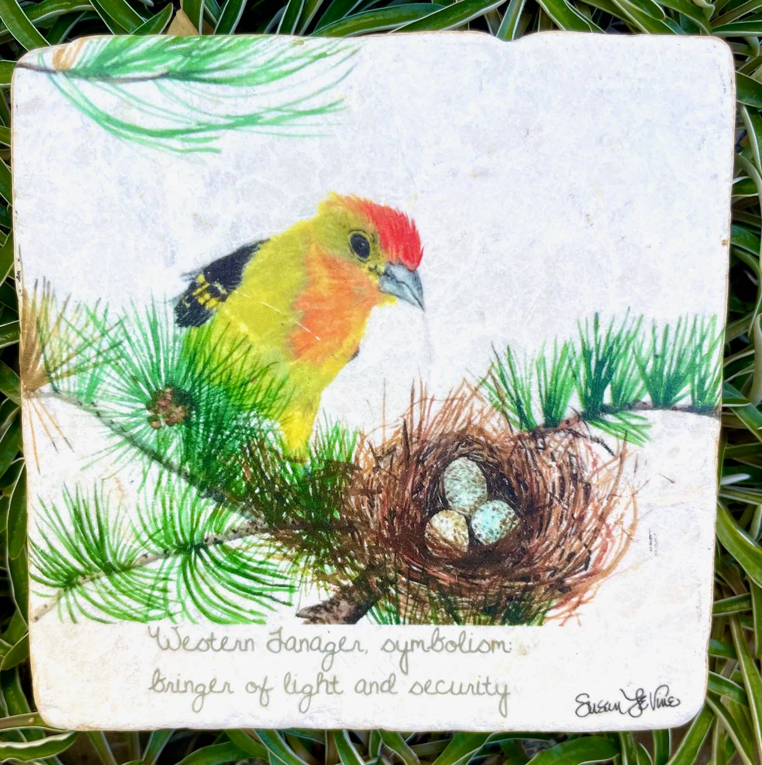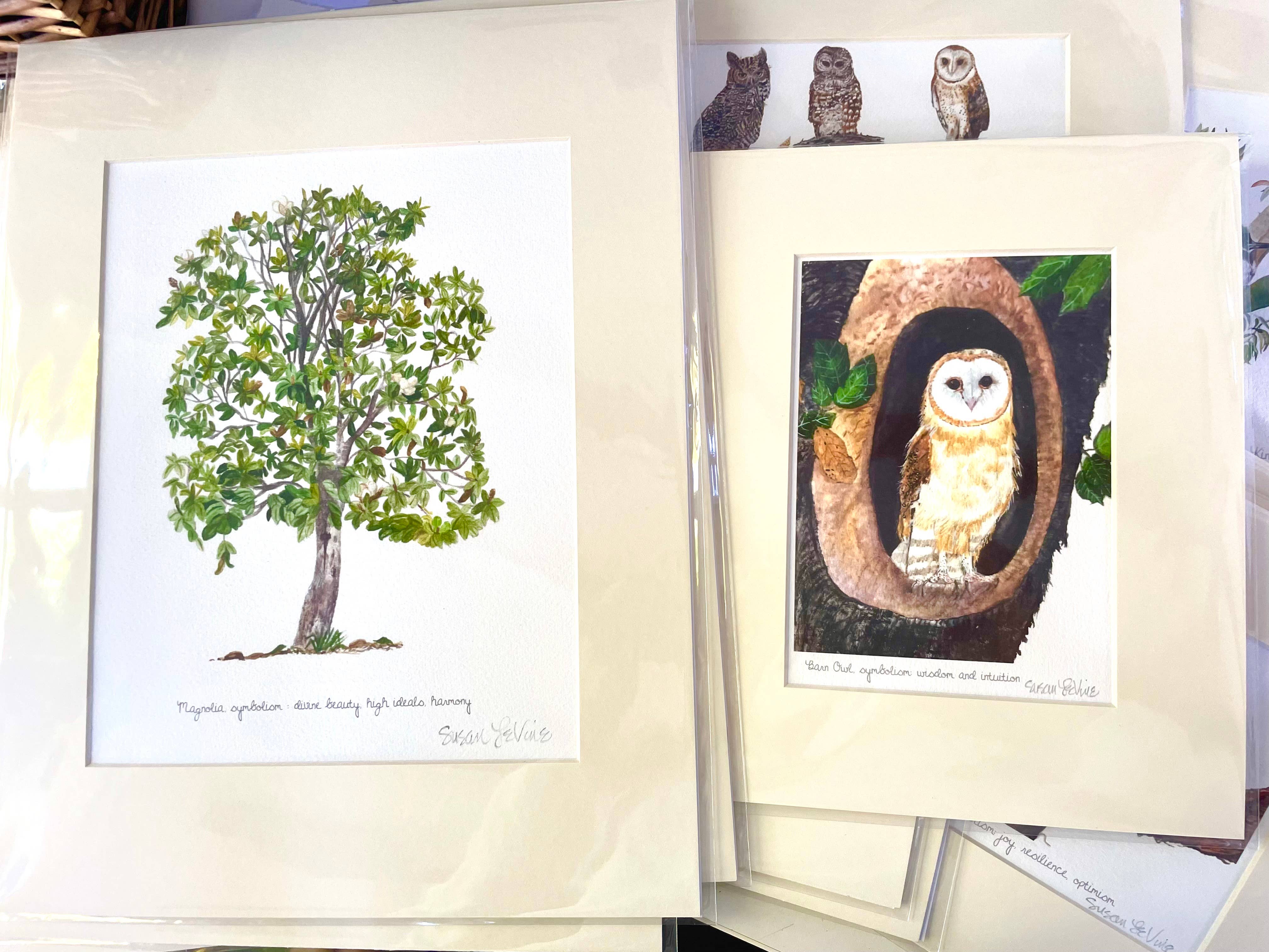 I have always been inspired by a love of nature and a desire to bring beauty and joy to others. I hand print all of my card/prints on watercolor paper and hand sign them. They are printed from my original paintings. Each card/print has the symbolism associated with the birds, trees or flowers that I paint written on them giving a deeper meaning to the image. Many people frame them. Trust me, they are a labor of love! My scarves are inspired by nature and travel and are made of silk crepe de chine in Italy. They are hand finished and hand rolled.Please feel free to visit my website susanlevineart.com.