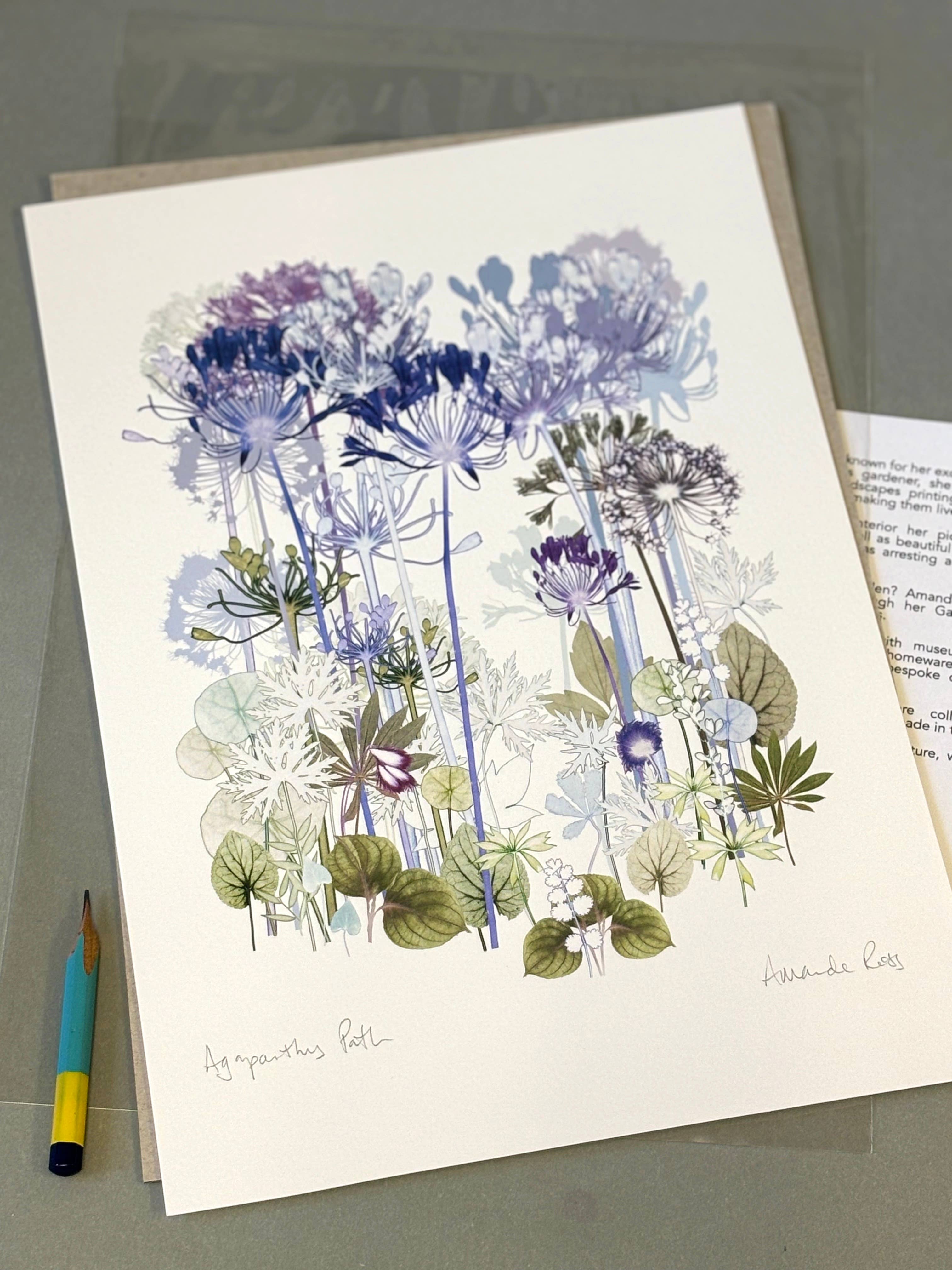 Amanda Ross creates modern botanical art, not painted but printed, using pressed plants as the paintbrush. A hopeless gardener, she collects plants both for their beauty and memory of place. Using these pressed cuttings she creates gardens that don't need watering... With a background in textile design she developed a process producing exquisitely detailed plant prints. Collecting specimens worldwide Amanda handprints everything in her London studio. Primarily making artworks for the wall, some designs are modified for greetings cards, blank inside they are suitable for all occasions. New, expanding concertina books are a visual illustration of the botany used in prints and a lovely present for those who love plants. Art prints are sized to fit in off-the-shelf frames, both imperial and metric sizes, and printed on demand to reduce wastage. All are on archival paper using lightfast inks so they can be placed anywhere. All of the range is made in the UK with small, independent companies, using sustainable materials as much as possible. Amanda exhibits regularly at the RHS Chelsea Flower Show, but still struggles with maintaining the houseplants.