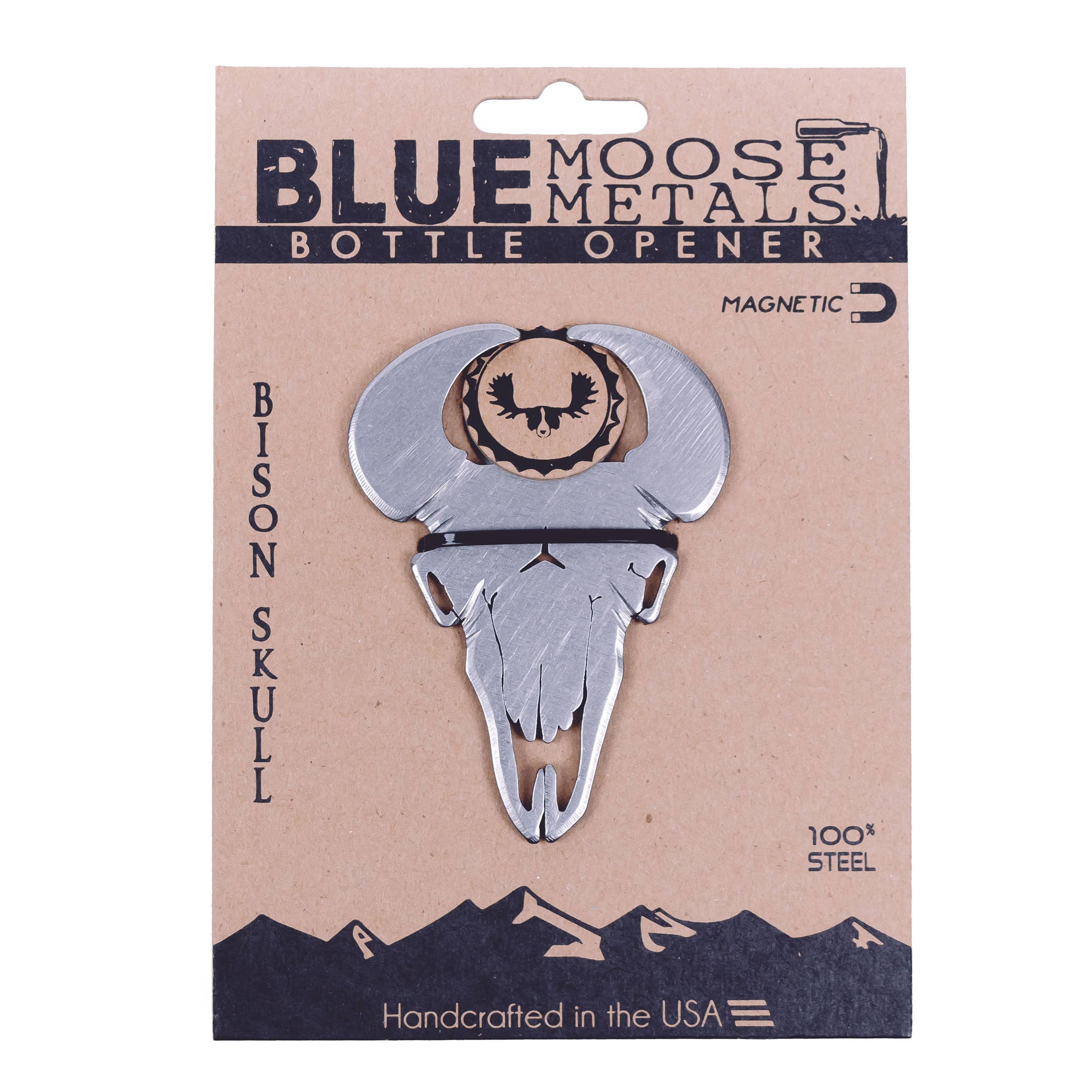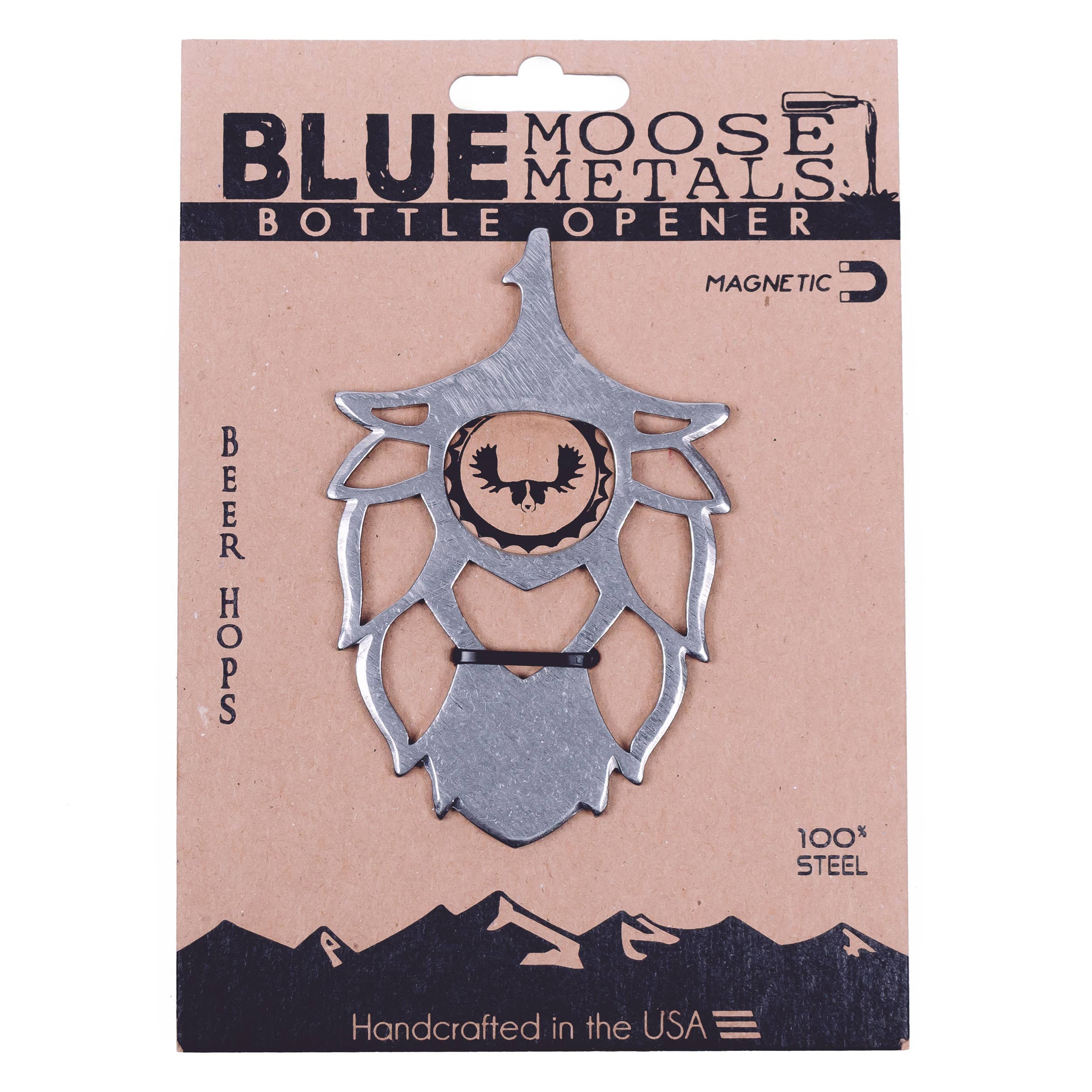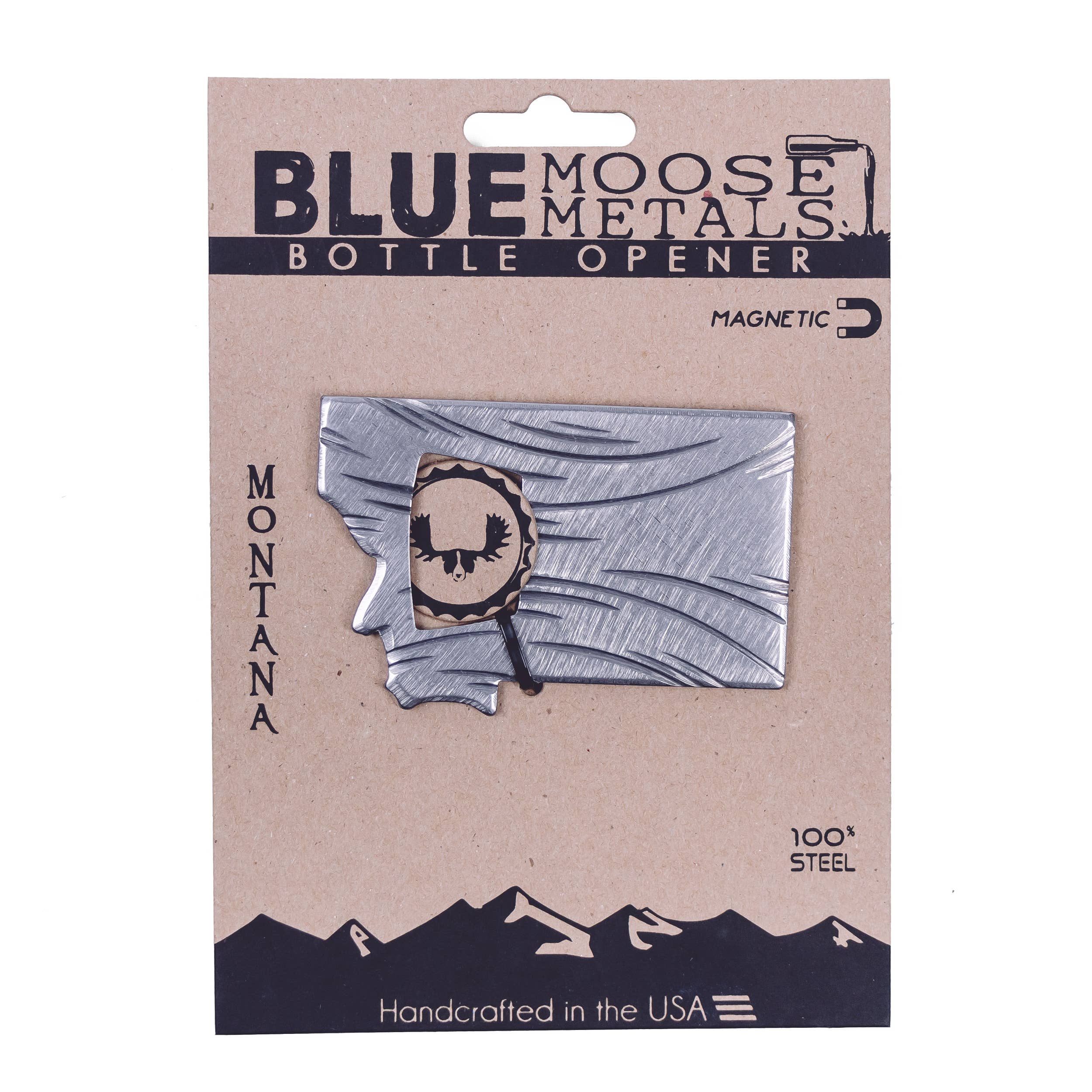 Blue Moose Metals is run by a husband and wife team based in the mountains of western Montana. Made from 100% steel and finished in unique steel patinas, each magnetic bottle opener and bottle stopper is durable and meant to last a lifetime. We pride ourselves on creating unique, quality, handcrafted products that are made in the USA. Our designs are inspired by our love of nature and the outdoors-with a bit of humor and quirkiness. We care about attention to detail and the fact that each opener is made by hand from start to finish making each one a unique piece of functional art.