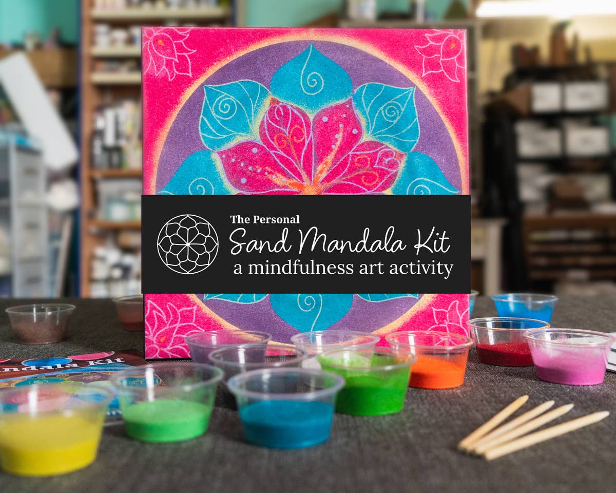 The Personal Mandala Kit was developed from our 25 years of helping thousands of people with hands-on art experiences in Artbeat, our walk-in art studios in Arlington and Franklin, MA. We (Jan Whitted, along with son Drai and his wife Virginia, a yoga teacher and reiki master) had developed new and fun ways to use sand as an art material. Sand is naturally playful, and we observed how much people enjoy making things together when there’s no pressure to “get it right” or to have a particular outcome. We wanted to bring that same fun experience to a format that most adults can relate to and can do at home We had the opportunity to do that during the 2020 pandemic, when we closed Artbeat and moved our equipment to a private studio in Lowell, MA. Brought to life through Kickstarter, the Personal Sand Mandala kit is now being offered to retailers across the United States.
