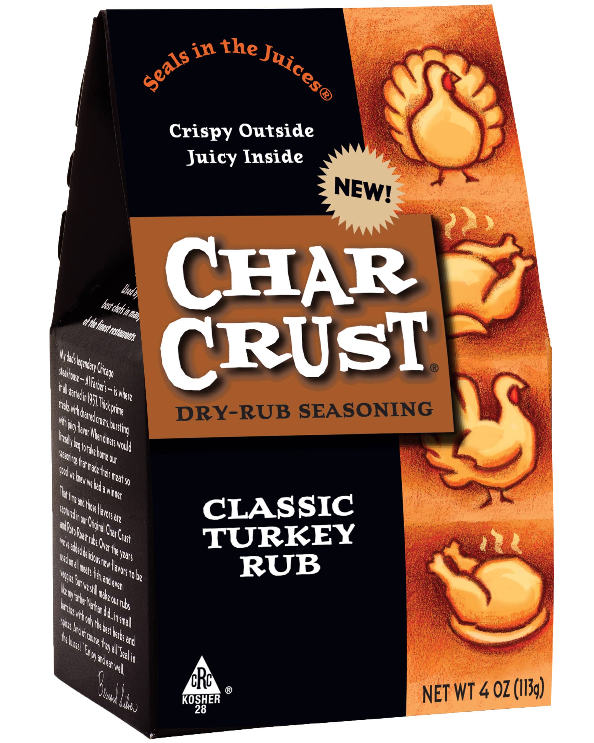 It all started in 1957 at the popular Chicago steakhouse – Al Farber’s. The house specialty was tender thick prime steaks with seared crusts, bursting with juicy flavor. The secret? House made rubs that added delicious flavor while creating a seared crust that Seals in the Juices every single time. Today, Char Crust continues to wow with ten clean label, chef-created flavors all made in small batches with only the best herbs and spices. Char Crust elevates the taste of all meats, fish, and even veggies. Signature crust for perfect results every time One-Step Prep Versatile: Each flavor profile to be used on multiple proteins (beef, chicken, pork, fish, plant-based) with multiple cooking methods indoor and out (grill, roast, pan-sear, broil, bake, smoke) On Trend and Healthy: Premium, clean label, non-GMO, certified Kosher (cRC), vegan. Woman-owned: Operated and produced in Chicago in small batches with only the best herbs and spices. Award Winning: National BBQ Association Gold and Bronze Medal winners