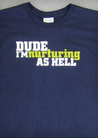 This is what happens when an Advertising Art Director of 10 years becomes a stay-at-home dad. In the fall of 2008, along with so many other down-sizing victims that year, I was laid off from my job. Ouch. Three weeks before the birth of my first daughter. Double ouch. Life had just taken a left turn and sent me down a road I hadn’t even known existed. Suddenly, I was a stay-at-home dad, changing diapers, taking stroller walks, cuddling, giving 2am bottles, and seeing other dads in the neighborhood doing the same thing along the way. After a few years of this, and the birth of my 2nd daughter, I noticed that despite so many modern dads becoming closely involved in the child-rearing process, it was still very much a mom-and-baby world when it came to baby products. I felt that Dads needed another voice, another champion – but one that came from an authentic dad’s perspective. With my creative engines kicking into high gear, 24-7 Daddyhood was born. What started with seven Daddy shirts has grown into a wide selection of funny, edgy, heart-warming, and just family-friendly apparel for kids & adults. I begin the design process digitally on my computer and finish elbow-deep in ink and sweat, applying each design by hand with my manual printing press. It’s a very rewarding hybrid between modern and classic artistic creation. Was being laid off what I wanted back in 2008? No, it was terrifying. But looking back on it now, I wouldn’t change it for the world.