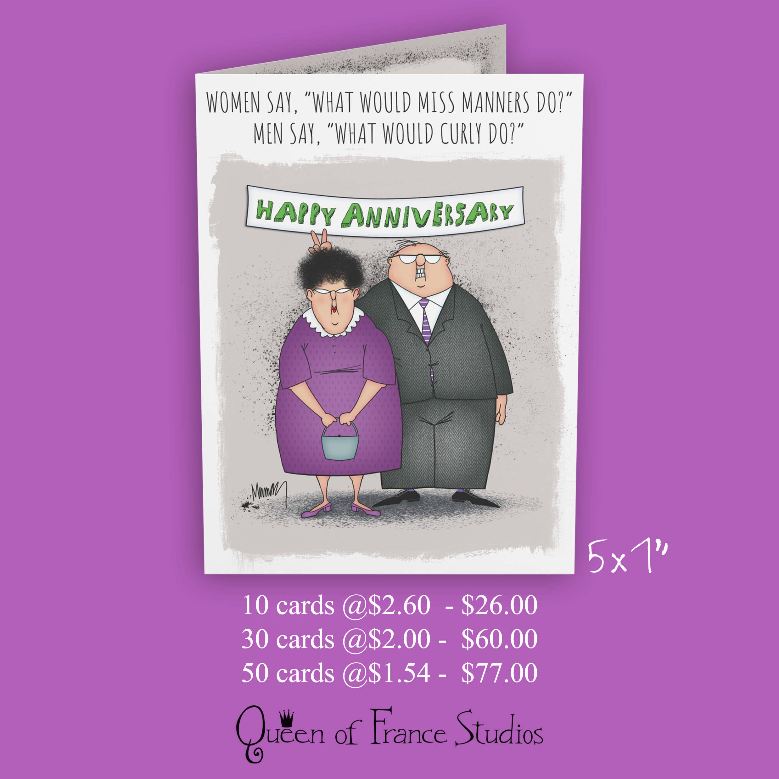 Introducing Queen of France Studios, the new generation of Murray's Law, my former line of greeting cards and paper products, winner of 23 Louie Awards including Greeting Card of the Year. Never one to rest on my Louies, I've now launched Queen of France Studios. I mostly did it so I can sit around going "Off with their heads, off with their heads." I've come to Faire to reconnect with my old retailers (and some new ones!). I still have contracts with card publishers, but now you can also buy wholesale directly from me, and have access to products you won't see anywhere else. * * * * * * "Leslie Murray is the smartest, funniest girl in the whole wide world." ---Artist's Mom.