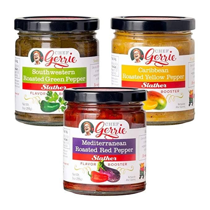 In addition to her role as an accomplished executive chef, Chef Gerrie is a culinary instructor, speciality food product innovator, social media maven and "Culinary Evangelist". She believes that cooking and eating feeds the soul! She was given this culinary gift, and now wants to share her love and knowledge of food with a "ladle of truth and a tongue of righteousness". Chef Gerrie's Slather Flavor Boosters puts "The Sexy Factor" back in your food or drink. It's versatile, gives the consumer "More Bang for the Buck". They give people the ability to enhance and improve their dishes in a healthy, fun and easy way - especially during those hectic work-week days, when meal prep time is crucial. The slathers are all plant based & vegan, all natural with no preservatives in 3 delicious flavors: Mediterranean Roasted Red Pepper Slather (Rich, Deep & Exotic), Caribbean Roasted Yellow Pepper Slather (Fruity, with a Touch of Heat), and Southwestern Roasted Green Pepper Slather (Smokey, Earthy, & Spicy). Use them in cocktails, egg dishes, soups & stews, vinaigrettes, meat, seafood & vegetarian dishes, toppings for pizzas, burgers & tacos, in pasta, rice, legumes & grain dishes, in savory & sweet breads and pies, and toppings to ice creams and sorbets. These flavor boosting slathers will deepen, magnify, and tease the taste buds to come back for more. Chef Gerrie brand is trademarked! You may just like it TOO much!