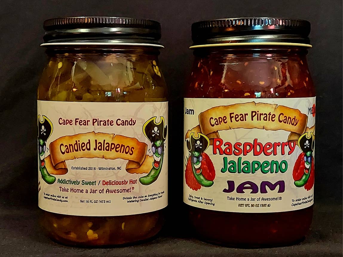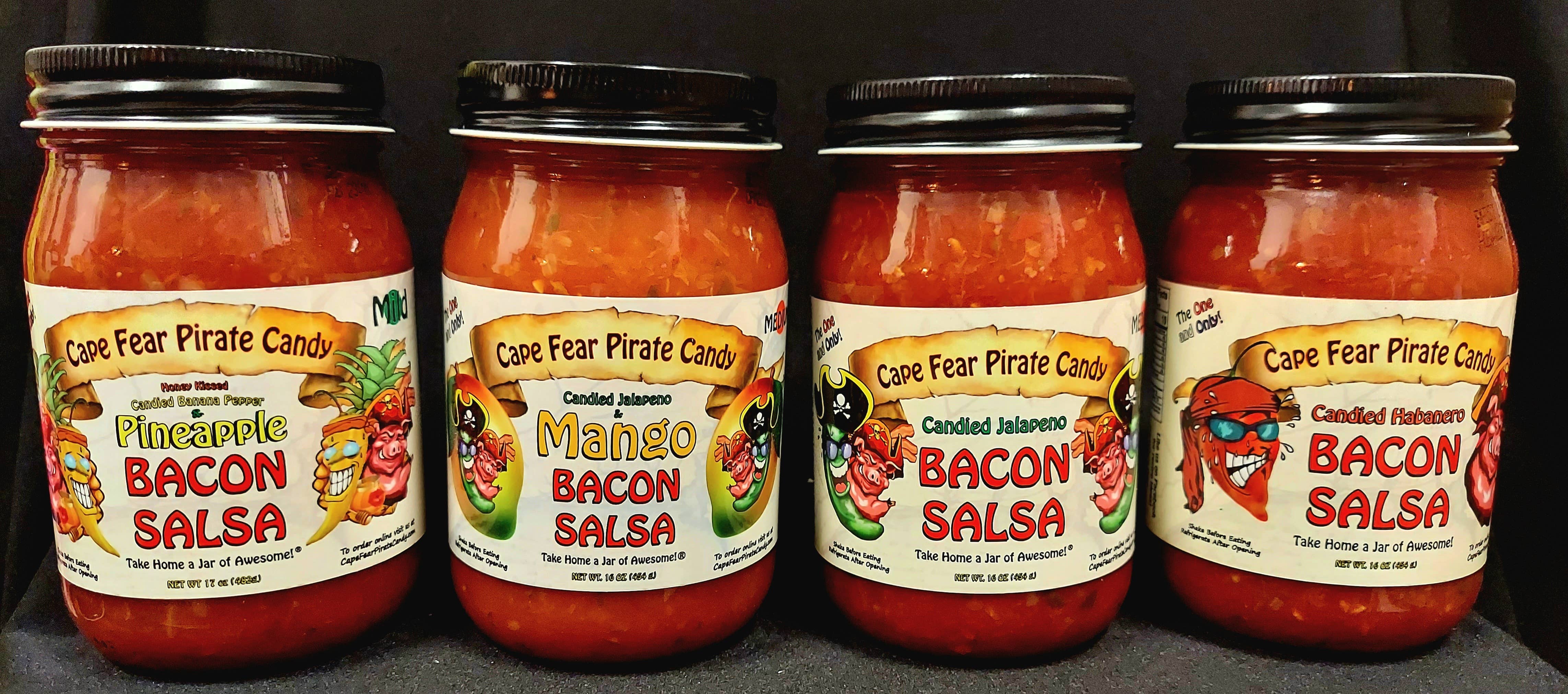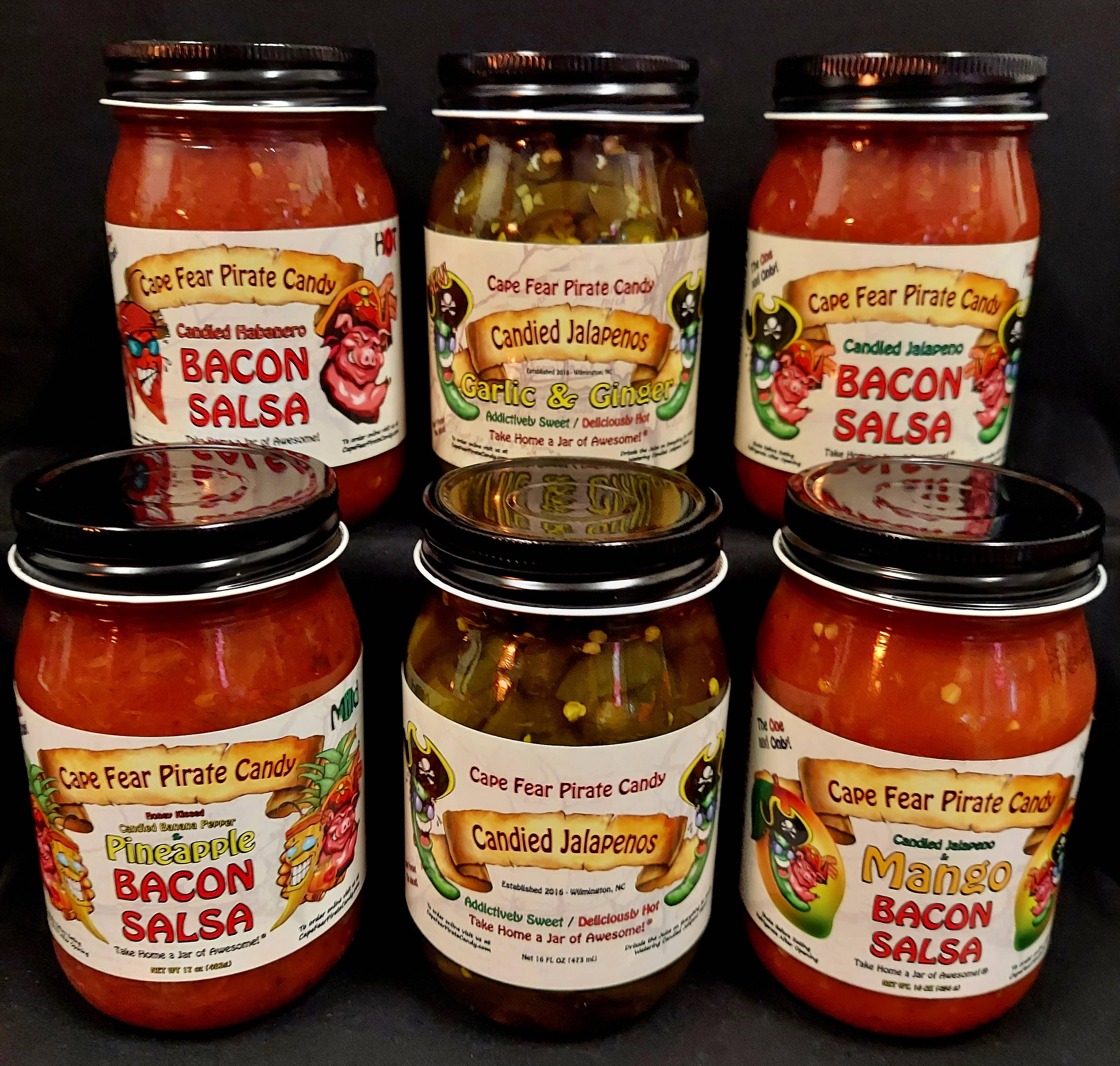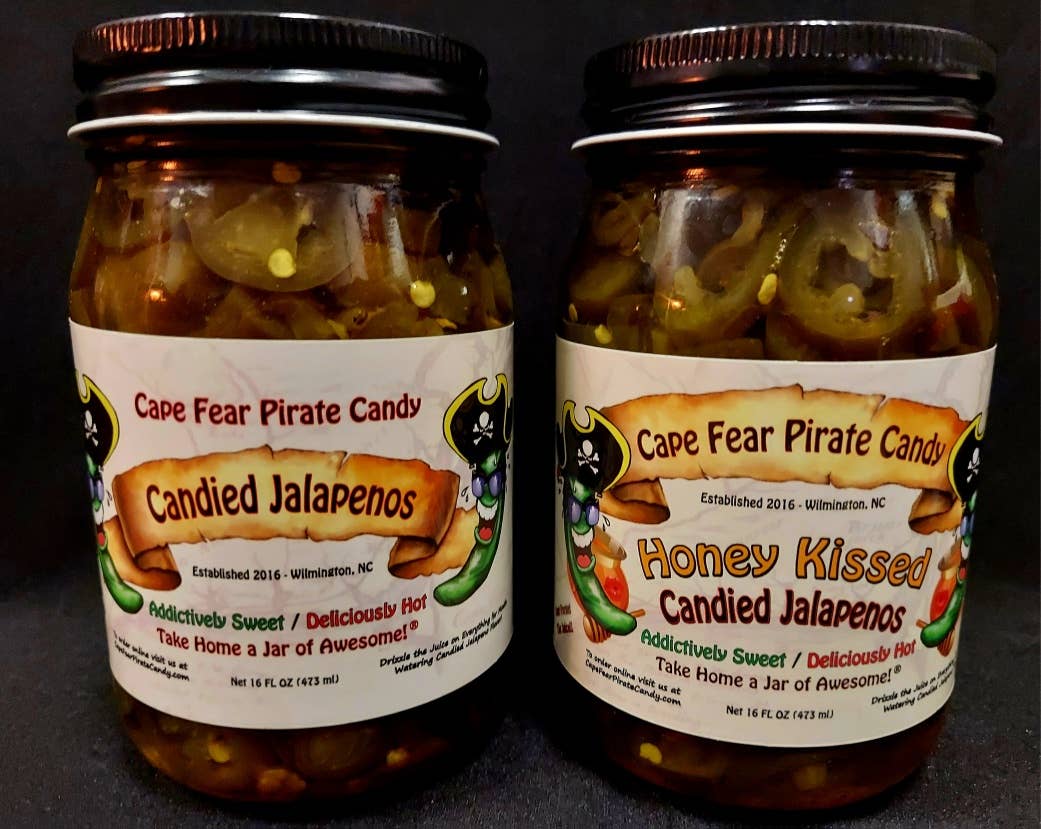 Take home a jar of awesome!® Boost your stores sales and keep them coming back for more! Great as gifts, stocking stuffers, for gift baskets - Mild to Hot and 4 Bacon Salsa Options! Cape Fear Pirate Candy has something for everyone. Sweet, Hot and Highly Addictive Candied Jalapeños. Don't forget the juice!! Garlic & Ginger Candied Jalapenos! For the Garlic & Ginger lovers in the family! Honey Kissed Candied Banana Pepper & Pineapple Bacon Salsa – Honey Kissed Candied Banana Peppers, blended with Pineapple Bacon Salsa! Mild, Delicious and Addictive! Great for crockpot chicken! Candied Jalapeno Bacon Salsa – it’s Candied Jalapenos, it's Bacon, it’s salsa.. What more could you ask for? Perfect with chips or used as a topping for Tacos, Hot Dogs/Hamburgers, Eggs and Pulled Pork. New! Candied Jalapeno & Mango Bacon Salsa – Mango blended with Candied Jalapeno Bacon Salsa! Spicy, Delicious and Addictive! Candied Habanero Bacon Salsa – it’s Bacon, it’s salsa, it’s HOT!.. Same great Bacon Salsa taste, but with a kick!! If you have any questions or need references, please feel free to contact us and we hope our products are as successful for you as they have been for us. Tara & Travis Moore Cape Fear Pirate Candy – Take home a jar of awesome!®