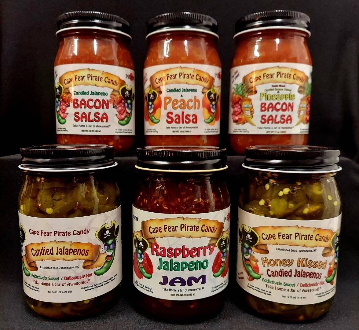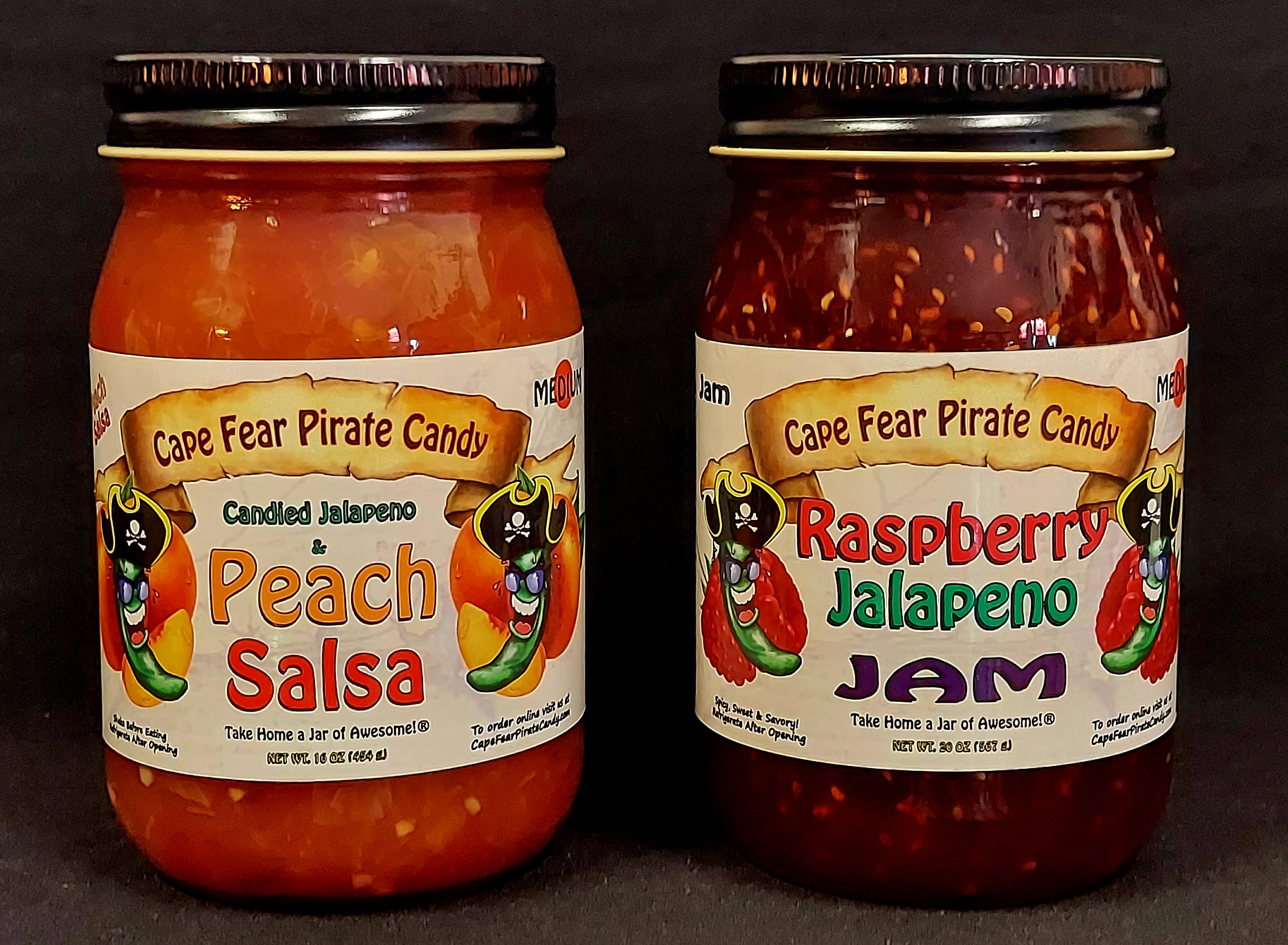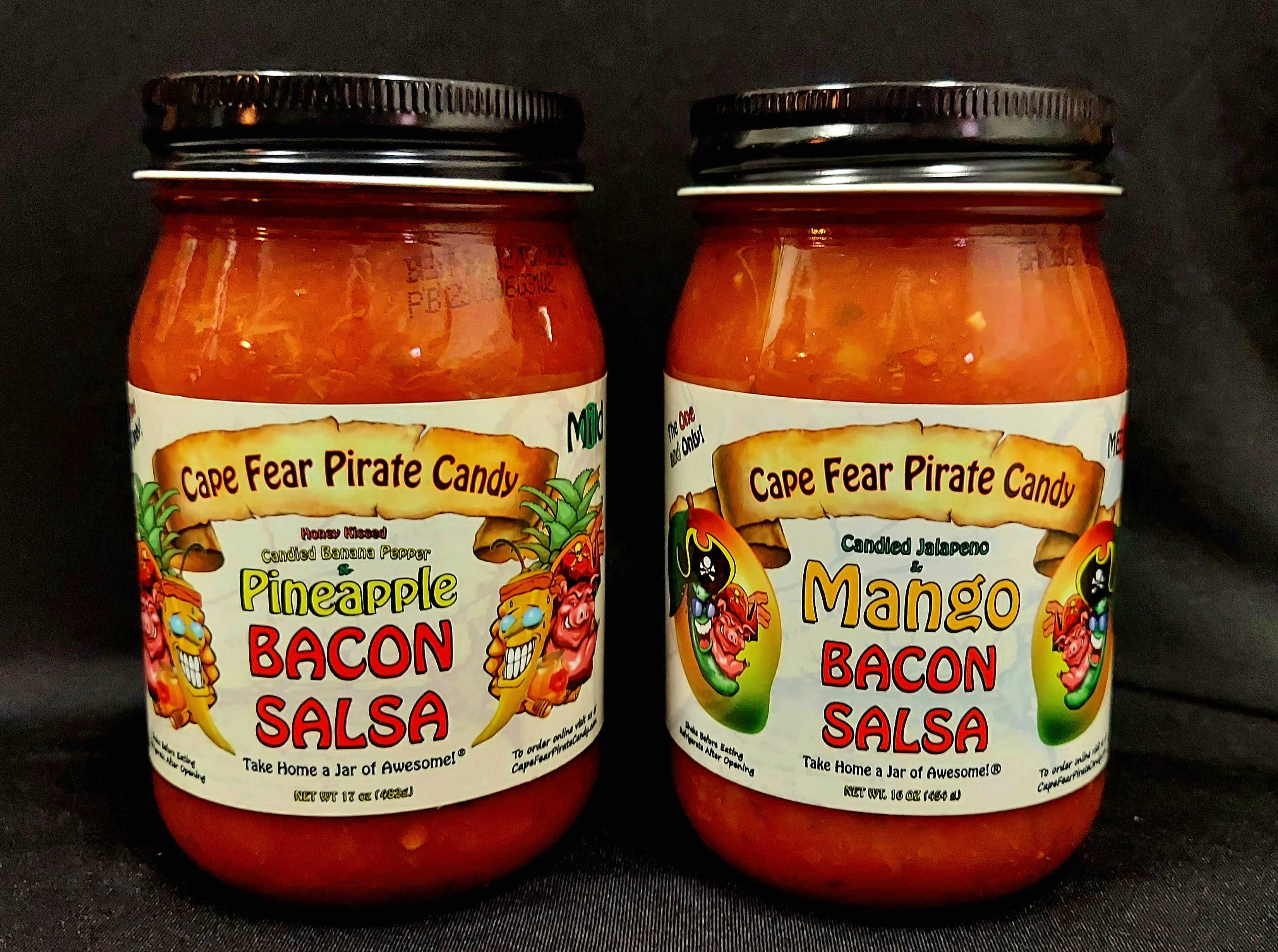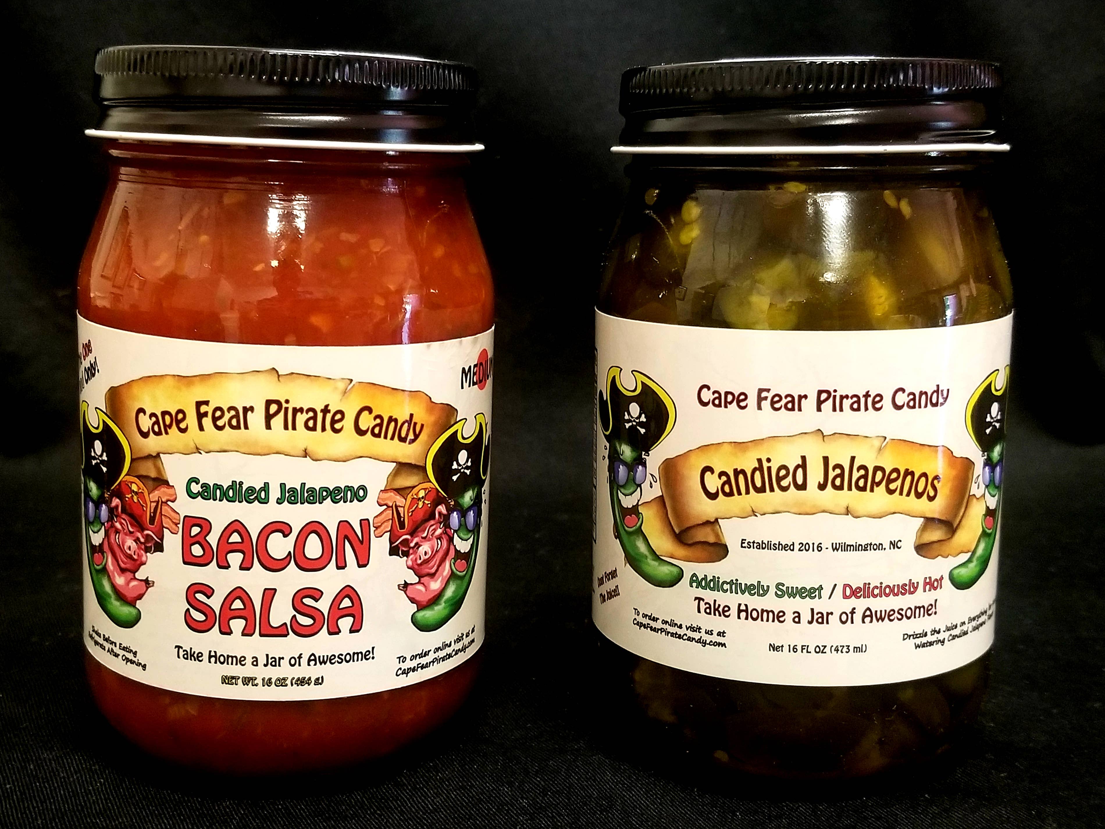 Take home a jar of awesome!® Boost your stores sales and keep them coming back for more! Great as gifts, stocking stuffers, for gift baskets - Mild to Hot and 4 Bacon Salsa Options! Cape Fear Pirate Candy has something for everyone. Sweet, Hot and Highly Addictive Candied Jalapeños. Don't forget the juice!! Garlic & Ginger Candied Jalapenos! For the Garlic & Ginger lovers in the family! Honey Kissed Candied Banana Pepper & Pineapple Bacon Salsa – Honey Kissed Candied Banana Peppers, blended with Pineapple Bacon Salsa! Mild, Delicious and Addictive! Great for crockpot chicken! Candied Jalapeno Bacon Salsa – it’s Candied Jalapenos, it's Bacon, it’s salsa.. What more could you ask for? Perfect with chips or used as a topping for Tacos, Hot Dogs/Hamburgers, Eggs and Pulled Pork. New! Candied Jalapeno & Mango Bacon Salsa – Mango blended with Candied Jalapeno Bacon Salsa! Spicy, Delicious and Addictive! Candied Habanero Bacon Salsa – it’s Bacon, it’s salsa, it’s HOT!.. Same great Bacon Salsa taste, but with a kick!! If you have any questions or need references, please feel free to contact us and we hope our products are as successful for you as they have been for us. Tara & Travis Moore Cape Fear Pirate Candy – Take home a jar of awesome!®