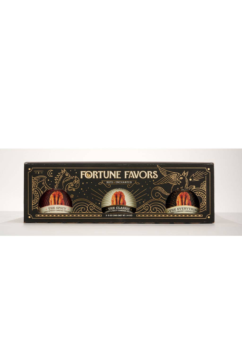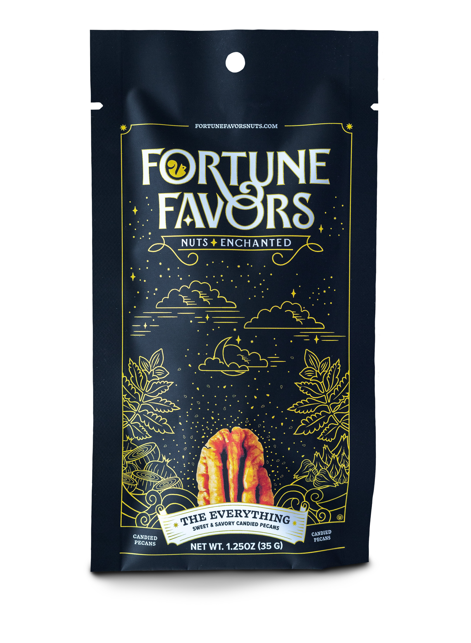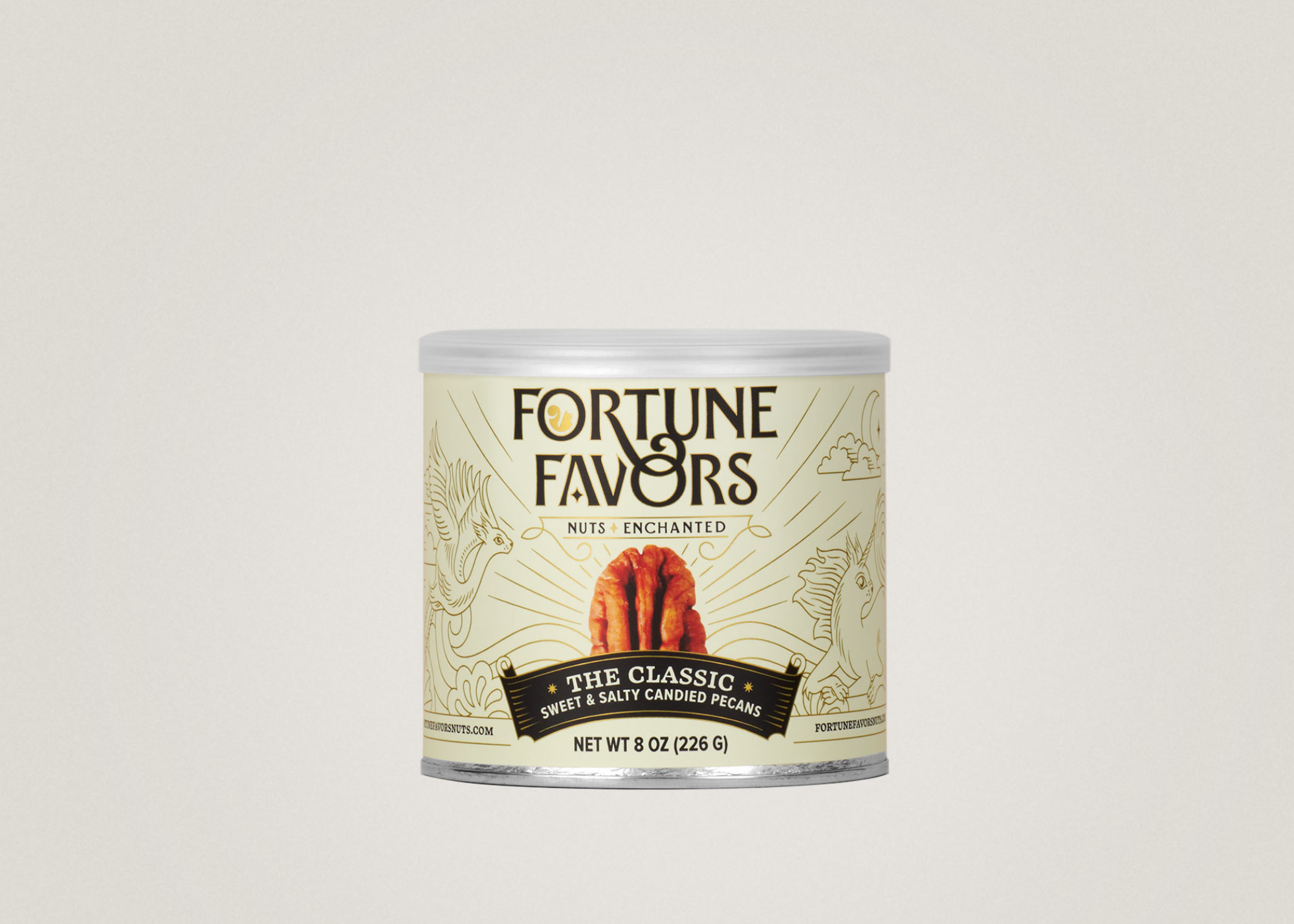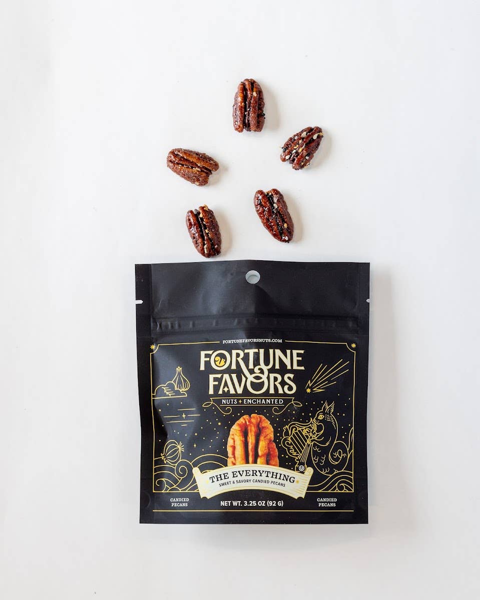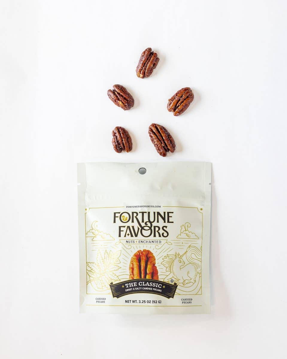 Life is moments, connected. We believe fortune favors those who weave wonder into weekdays, who make magic from mundane. We are a nut company that savors the occasion of being alive. A nut company that believes in the magnitude of a moment. Our pecans are perfect companion pieces — magic seeds sown for sharing. Nuts, enchanted in a world of daily occurrences that when examined, contain opportunity to share, to seek magic, to let the light in. Fortune Favors | Enchant Every Moment From flavor to packaging, Fortune Favors is a premium product that will grow your basket size and increase customer loyalty, while adding incremental sales. Fortune Favors is naturally GMO-free, gluten-free, vegan, and plant-based, appealing to diverse customers. This simple, delightful snack is the perfect treat to share, and still meets the highest nutritional standards in our dedicated, SQF-certified facility! All products have a shelf life of 11 months from the date of production. Faire customers will always receive at least 7 months of product life on their order. The ultimate treat, snack, and gift — healthy and delicious American pecans, touched with a little magic. An artful balance of sweet, salt, richness, crunch, and toastiness, presented in a stunning package that elevates snacking into an experience!