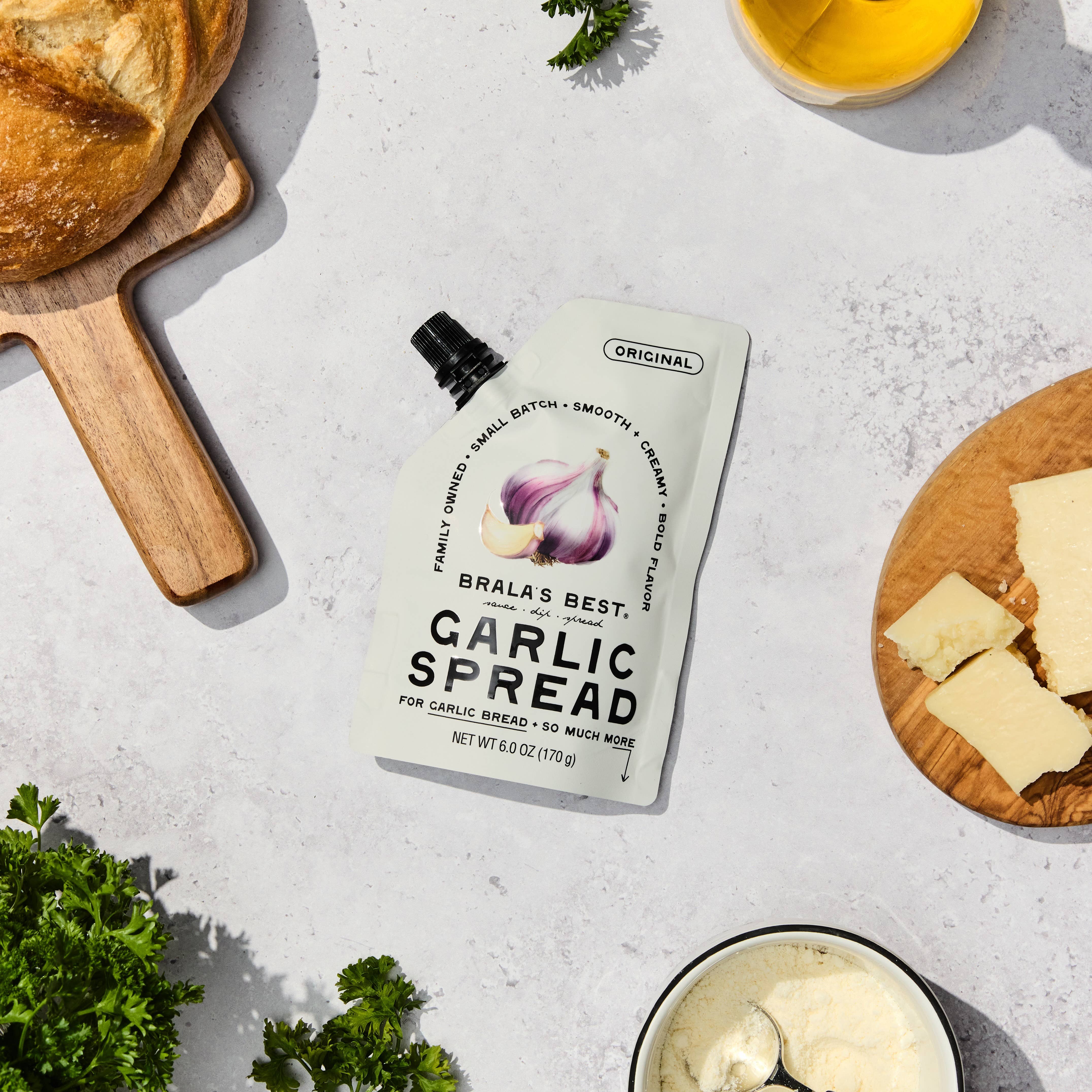 Brala’s Best Garlic Spread: Born for Garlic Bread & So Much More Garlic bread has always been a restaurant indulgence — at home it usually means frozen loaves or shortcuts that never quite deliver that golden, garlicky crust. But Brala's Best changes that. It all started when, at age 19, Paul Brala left his 1950s powdered-garlic childhood behind when he discovered the bold flavors of fresh garlic from his Indian neighbors. That spark ignited a lifelong passion for garlic spread and sauces from around the world. For years he refined his recipe quietly. Then in 2017, he shared it with his family for the first time — and it floored them. Two years of tasting, feedback, and perfecting later, Brala’s Best Garlic Spread was born: smooth, creamy, and bursting with bold garlic flavor. Now, as a small family business, we’re bringing it to kitchens everywhere. With Brala’s Best, you can finally make restaurant-quality garlic bread at home — no peeling, no chopping, no fuss. Just spread, toast, and enjoy. And while at it's heart Brala’s Best makes garlic bread magic, it’s also incredible as a dip, a sandwich spread, or a rub for meat and veggies. We can't wait for you to try it!