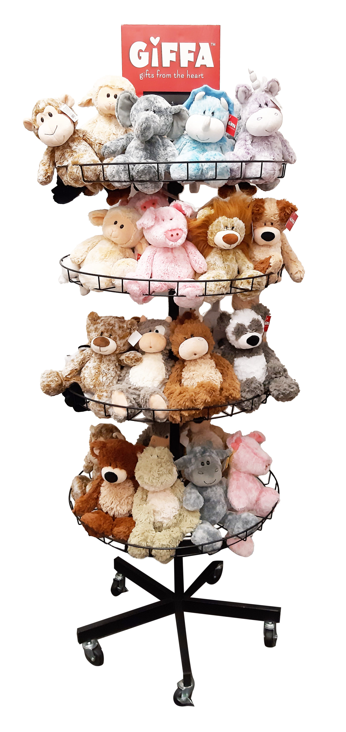 Who couldn’t use a little more softness in life? GIFFA has just the thing to smooth out the rough edges. GIFFA plush is a designer plush brand offered at unrivaled pricing. With its quality-controlled stuffing process executed in the U.S., GIFFA passes along its manufacturing savings through high-caliber product value. GIFFA’s products range from collectible 5-inch plush to jumbo 53-inch cuddly friends. GIFFA Classics include 5-inch dogs, cats, jungle or farm animals; 13-36-inch Fluffy Friends and Cuddly Critters; and 10-53-inch original GIFFA Teddy Bear Families and GIFFA Baby collections. By offering GIFFA to your customers, you can make life a little softer and easier. Give the gift of GIFFA, gifts from the heart.