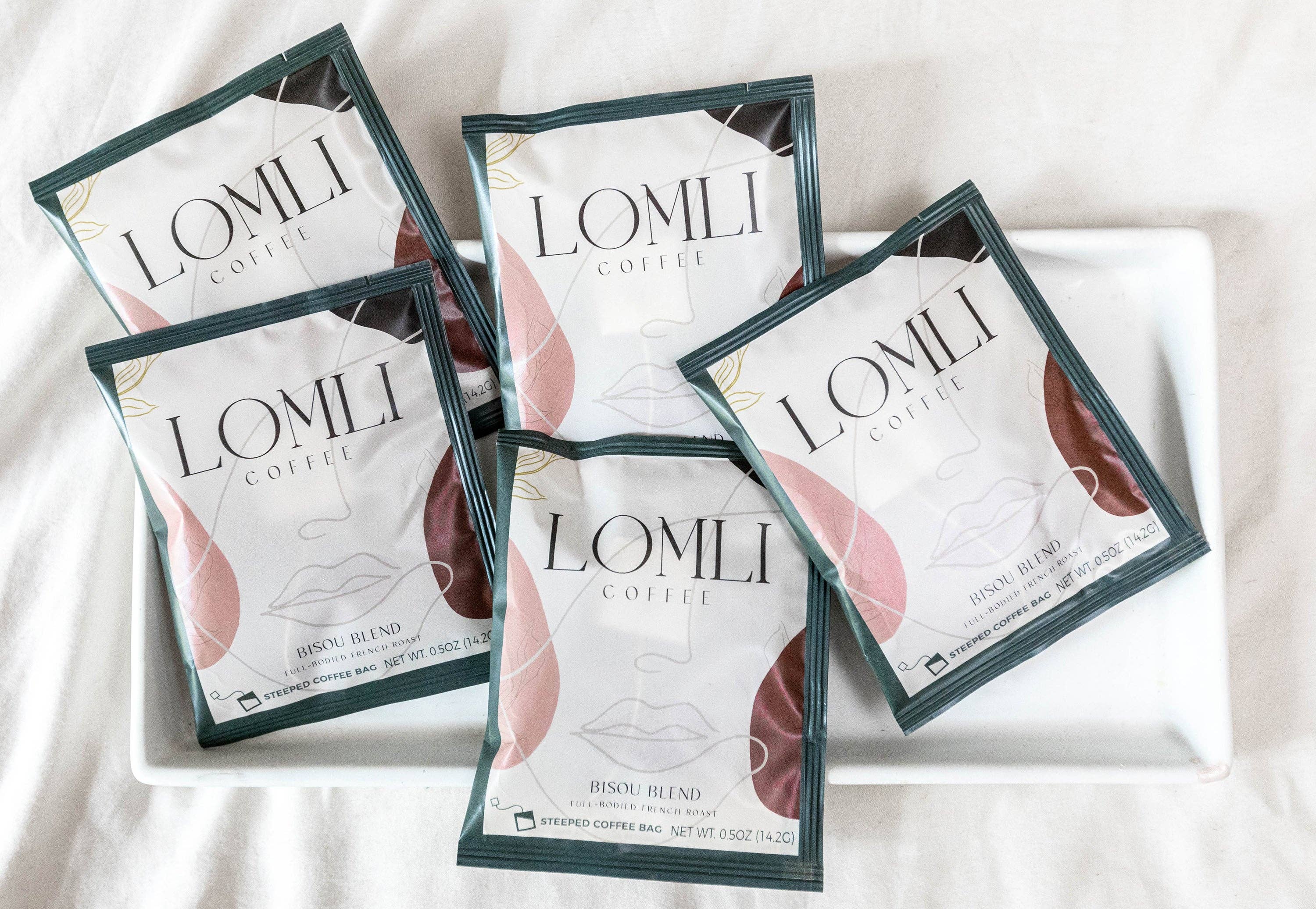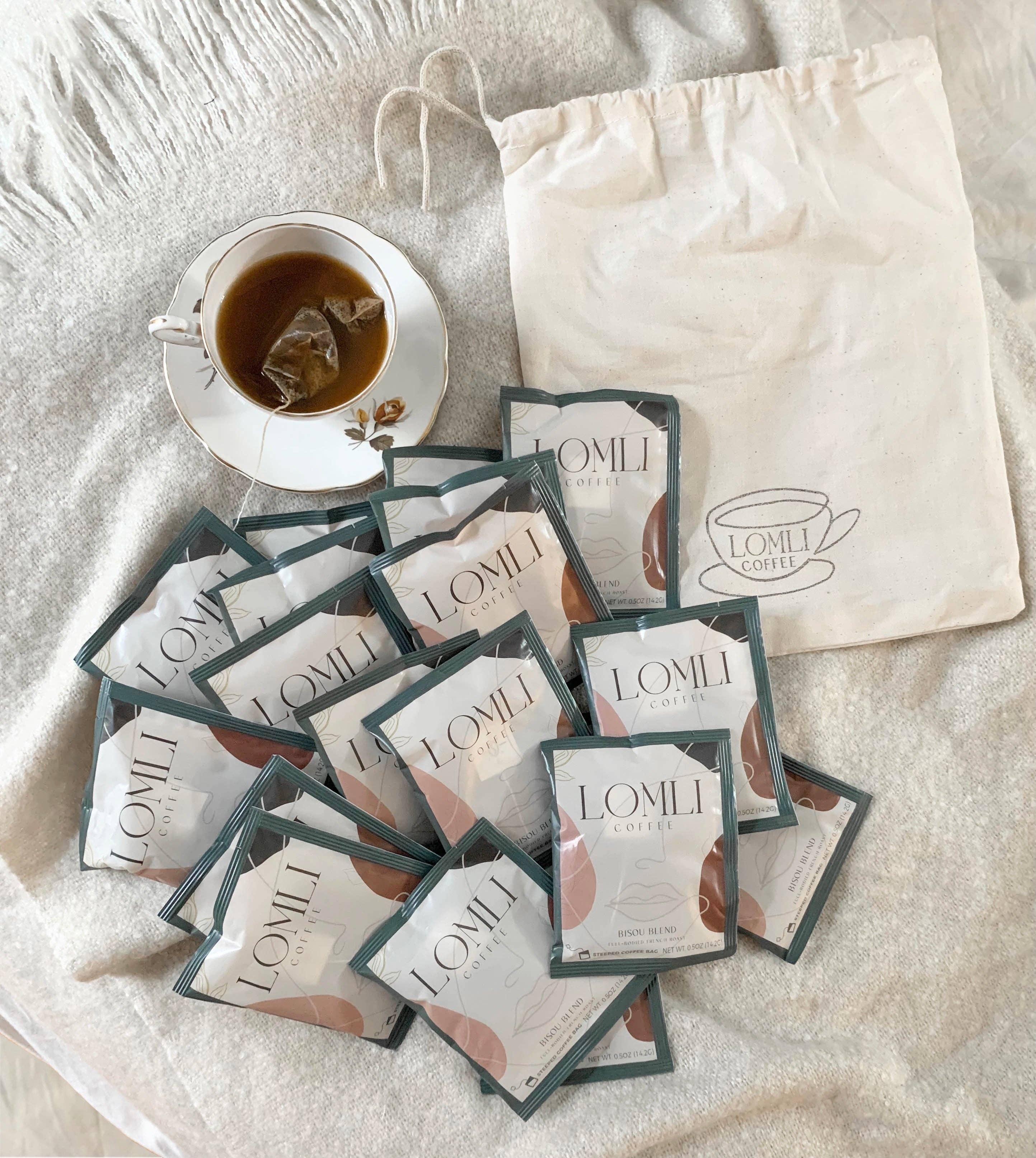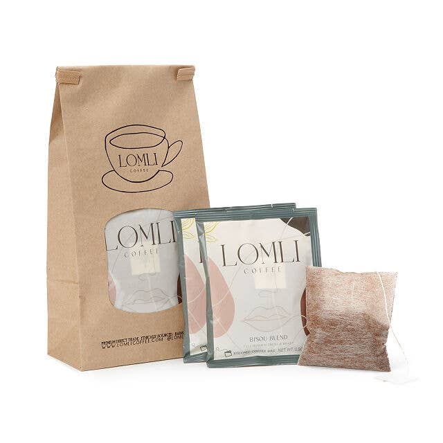 LOMLI Coffee sachets are convenient and sustainable coffee bags that steep just like tea! Made for the busy person on the go, you can brew high-quality coffee that is ethically and sustainably sourced without any mess or excess equipment. Our Bisou Blend is a full-bodied and delectable French roast. Our packaging is completely guilt-free! It’s, eco-friendly, 100% compostable and our inks for printing are non-toxic and water-based.