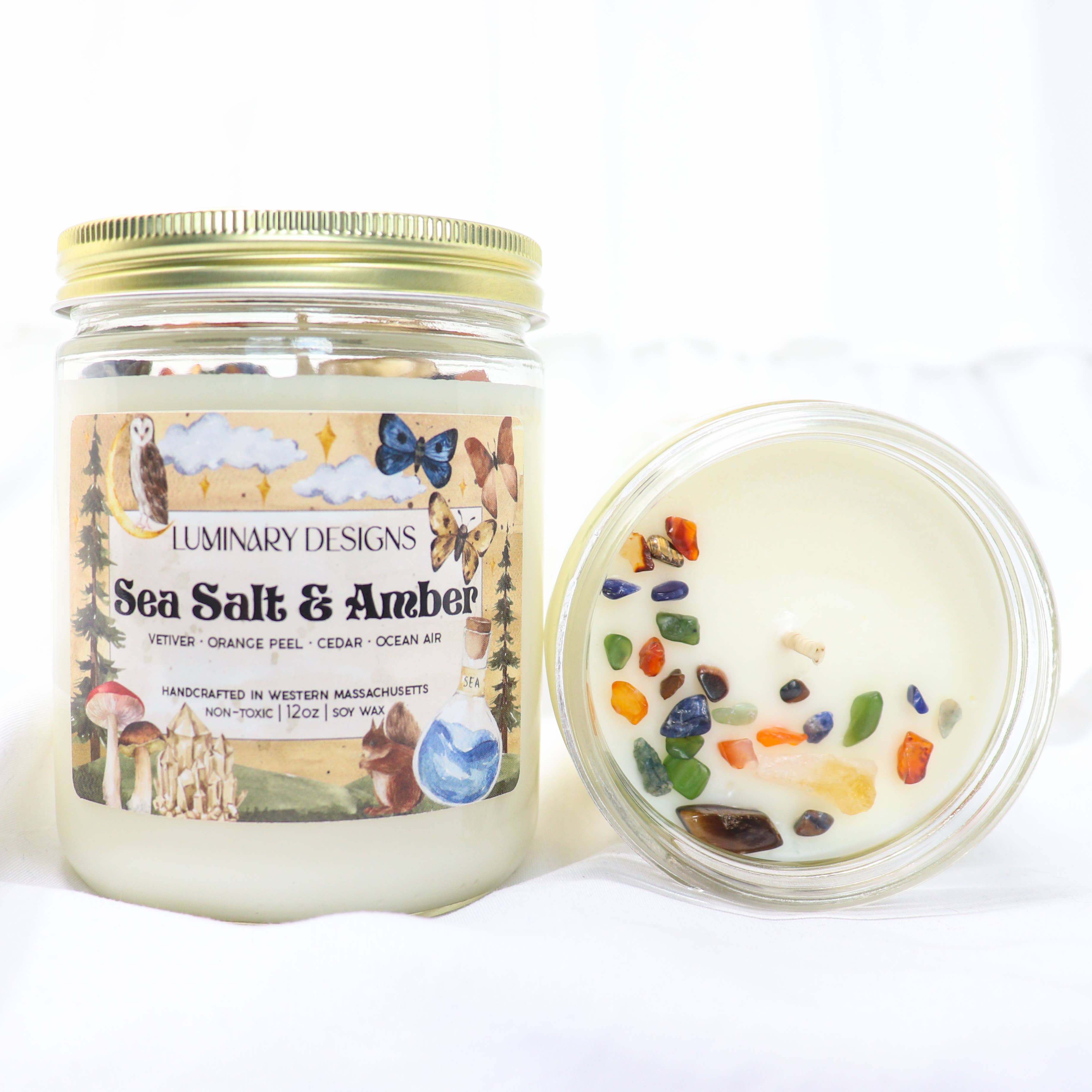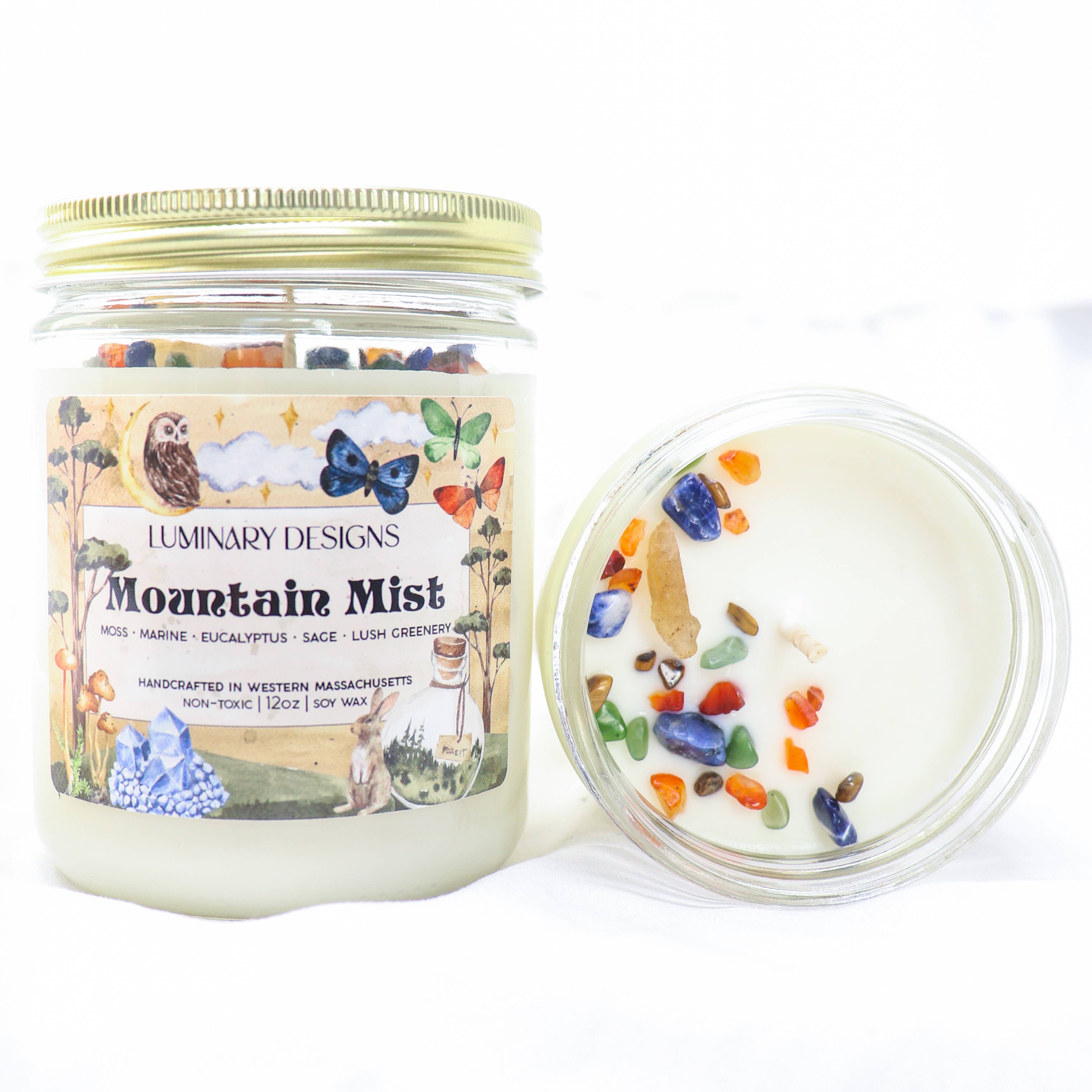www.luminarbykarissa.com Luminary Designs is an artisan candle company created by Karissa St. Pierre in Easthampton, Massachusetts. My mission is to imbue everyday life with more magic, whimsy, and intention. All candles are handmade in Karissa’s kitchen using clean burning soy wax, cotton wicks, and non-toxic + phthalate free fragrance oils infused with essential oils. Each candle is topped with real crystals you can keep after the wax burns away. I am most inspired by the dense, mossy forests that make New England so magical. When I create new fragrances and label designs, my goal is to produce a final candle that is fanciful enough to fit nicely in a fairy house or a witch’s cottage…but also elevated enough to function in a chic mortal apartment.