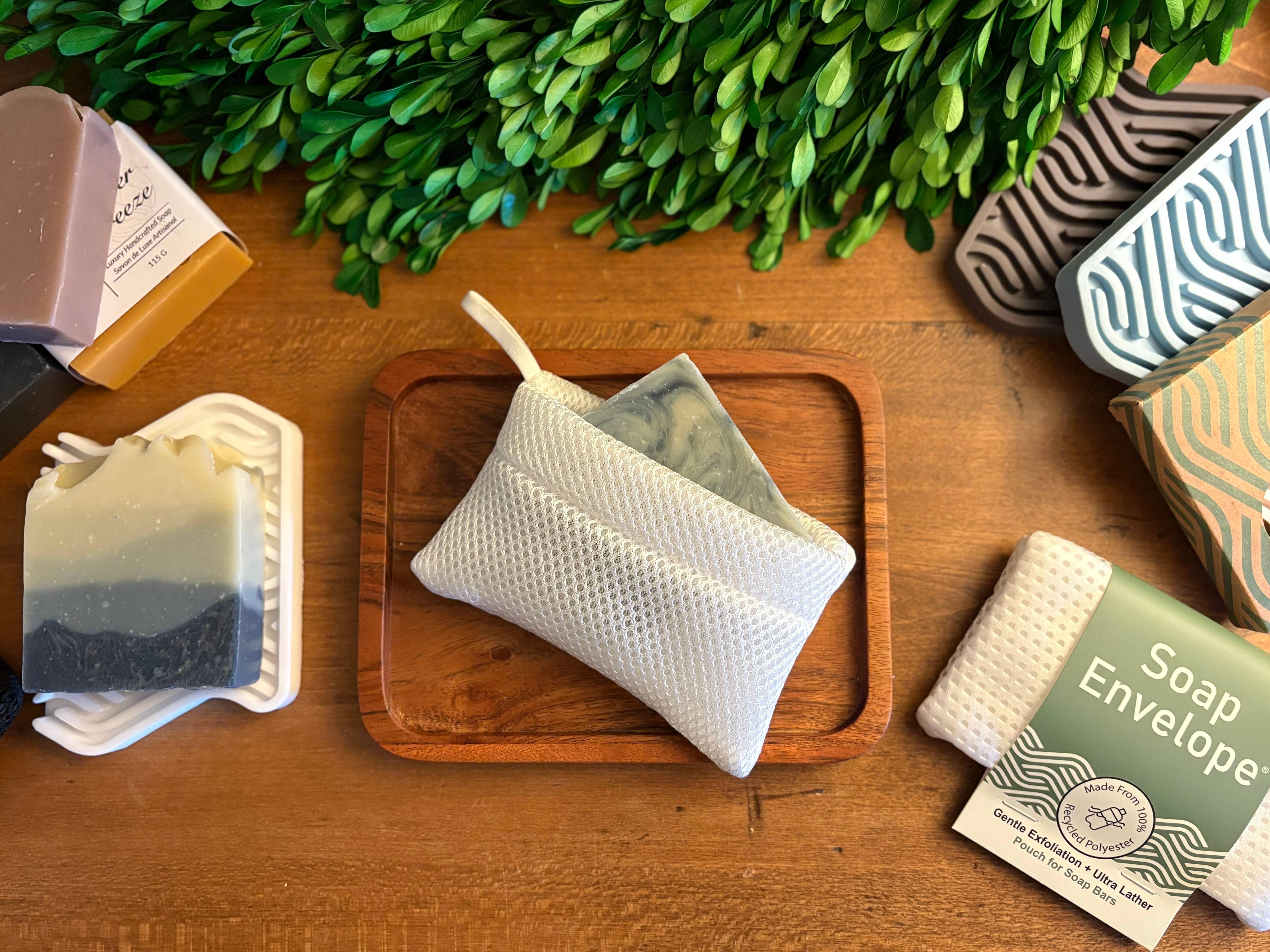 Soap Envelope - take better baths. @soap.envelope It all started in 2023 when Scott and Danika were researching how to make sustainable furnace filters... yes you read that right! @cycleair.ca was the original invention, and they developed a proprietary fabric made from 100% recycled bottles. Turns out that fabric also worked well with soap and makes an AMAZING lather. Here we are almost 3 years later and voila; the Soap Envelope has morphed into a brand of its own. We aim to make the BEST soap accessories to transform the bath experience into a luxurious ritual. Products that are durable, eco-friendly, feel great, and look great too. What started as the flagship Soap Envelope bar soap pouch, has turned into a full lineup of soap accessories that sell in refilleries, soap boutiques, gift shops, and anywhere soap and bath goodies are sold!