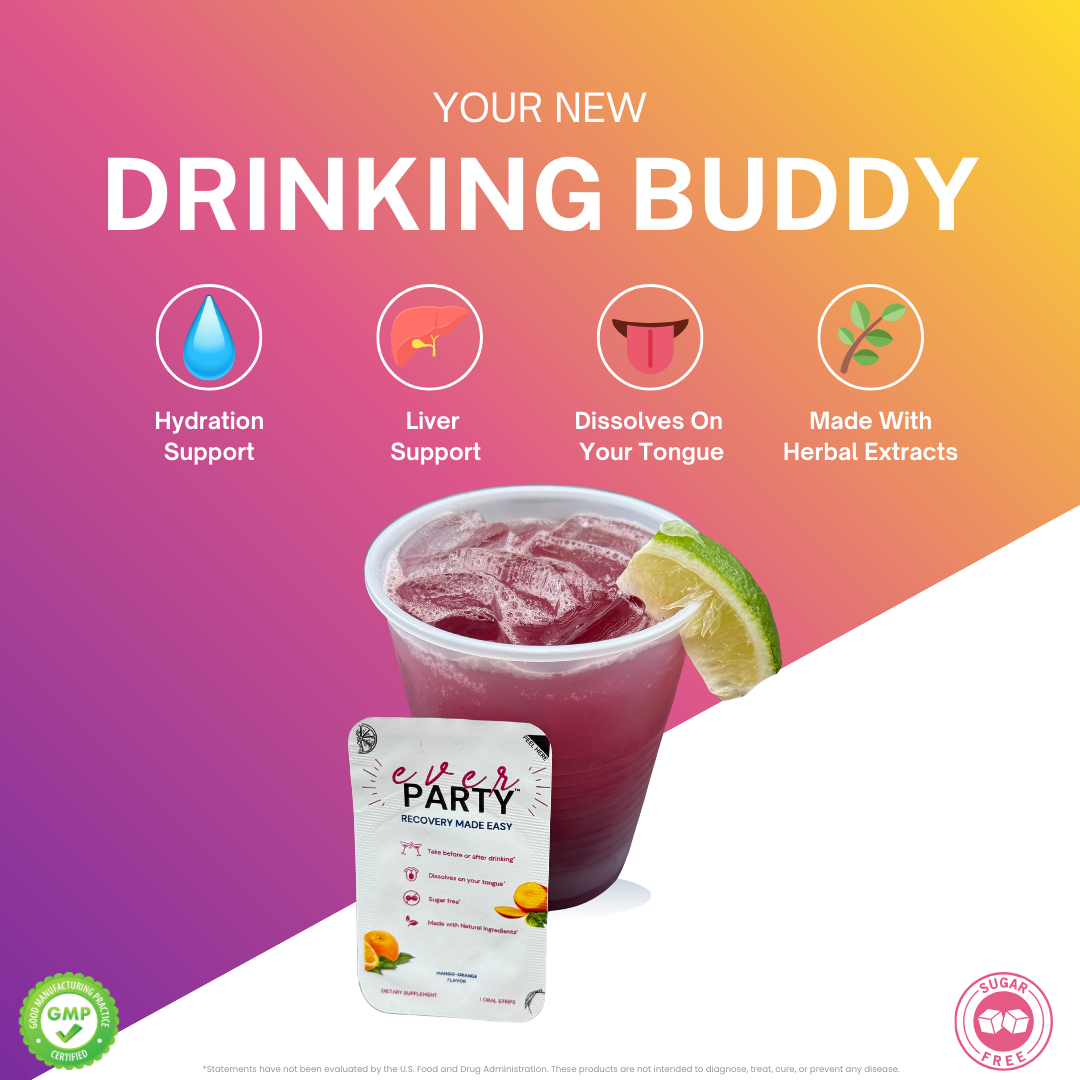 In a nutshell, EVER.PARTY offers and easy recovery solution made with natural herbal extracts in the form of a tasty dissolvable strip that you place right on your tongue. It’s portable, easy to use, and you can take it the night you are drinking as a preventative or the next day. We retail in packs of 10 individually wrapped servings for only $9.99. Learn more at https://www.ever.party
