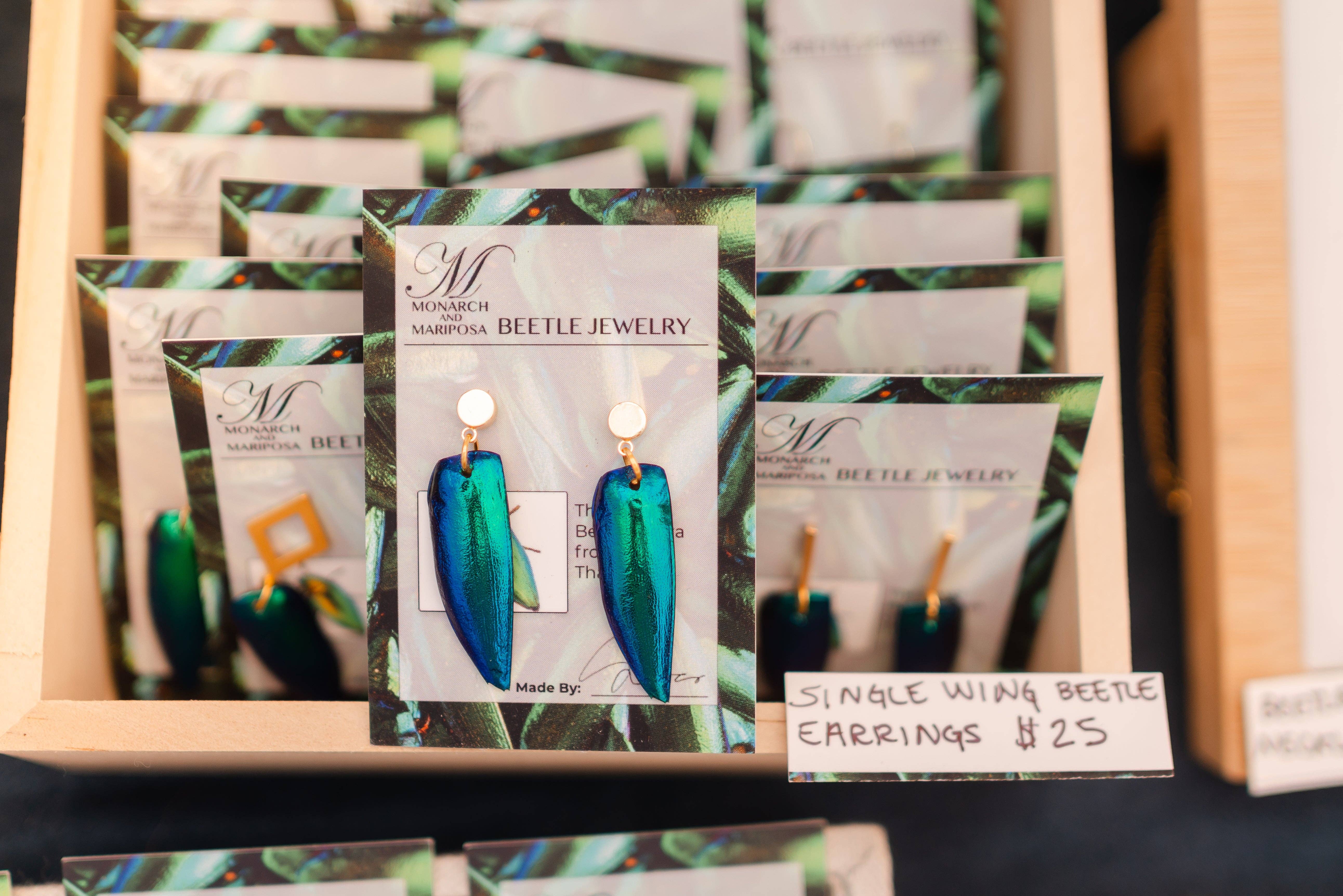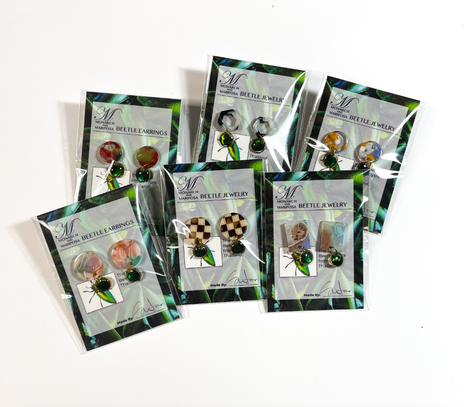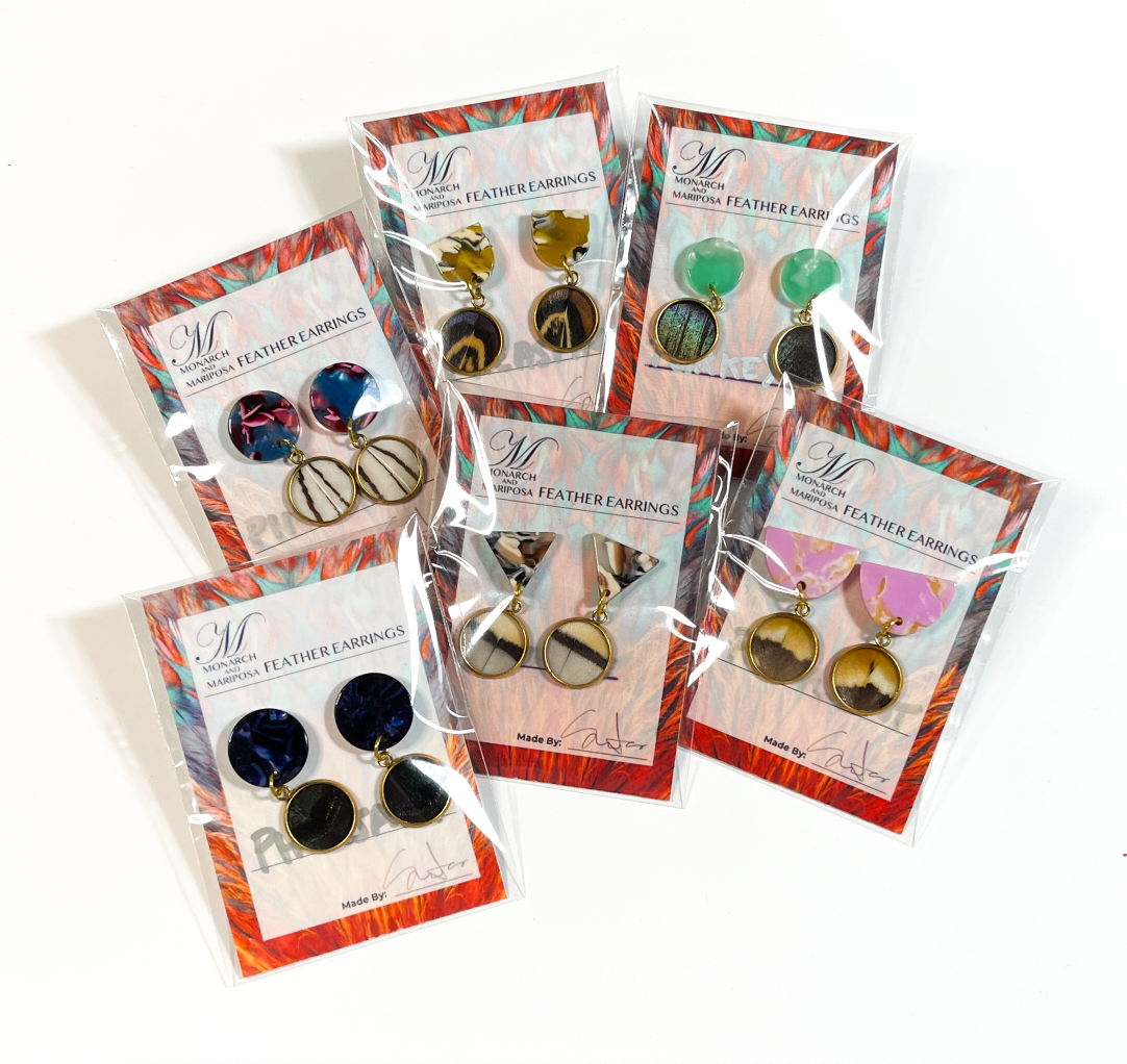 A dynamic female partnership striving to create colorful, one-of-a-kind pieces of wearable art that will be sure to spark up a conversation. Monarch and Mariposa is an eco-friendly brand focused on preserving and showcasing the beauty of nature. We use ethically and sustainably sourced bird feathers, butterfly wings, and beetle wings in all of our jewelry and accessories.