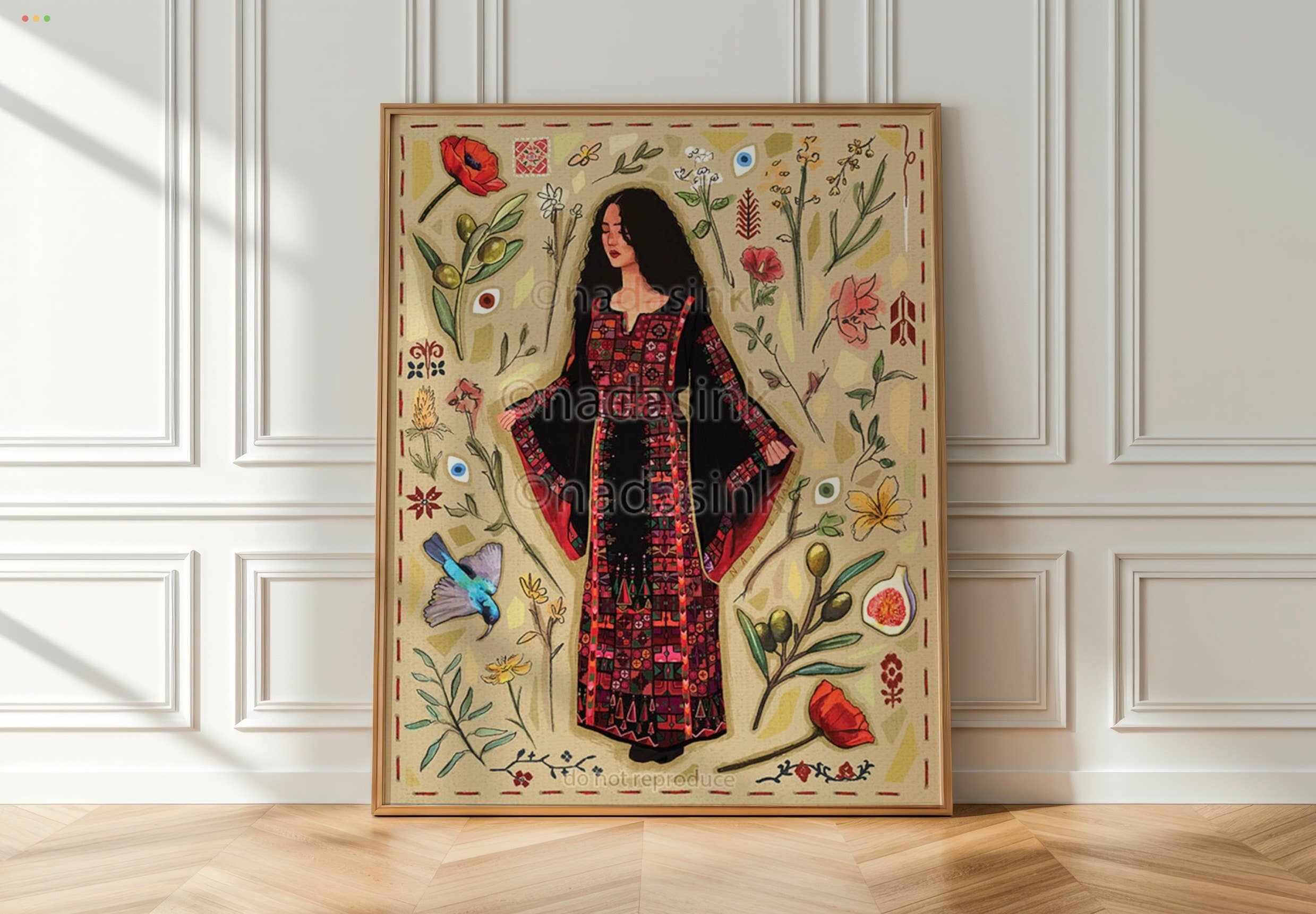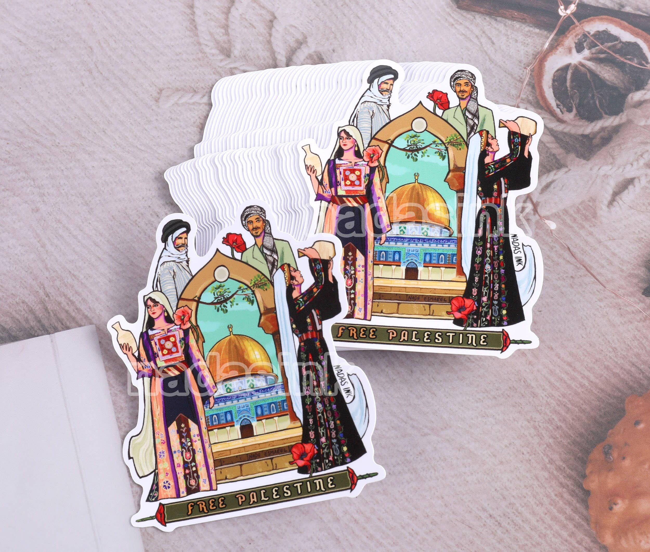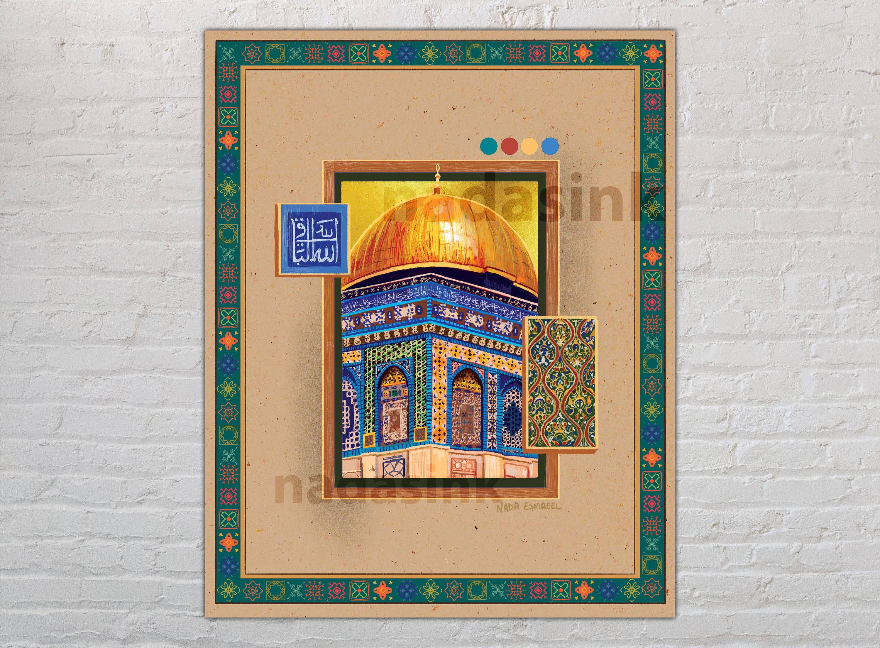 Nada's Ink is run by Nada Esmaeel, a Palestinian diaspora artist whose work is heavily influenced by her continued exploration and reconnection to her heritage, often inspired by and invoking the vibrant colors and geometric motifs of traditional Palestinian Tatreez in her artwork. Nada’s personal work focuses on the celebration and representation of repressed SWANA-region cultural history, women, tradition, and connections between land and people.
